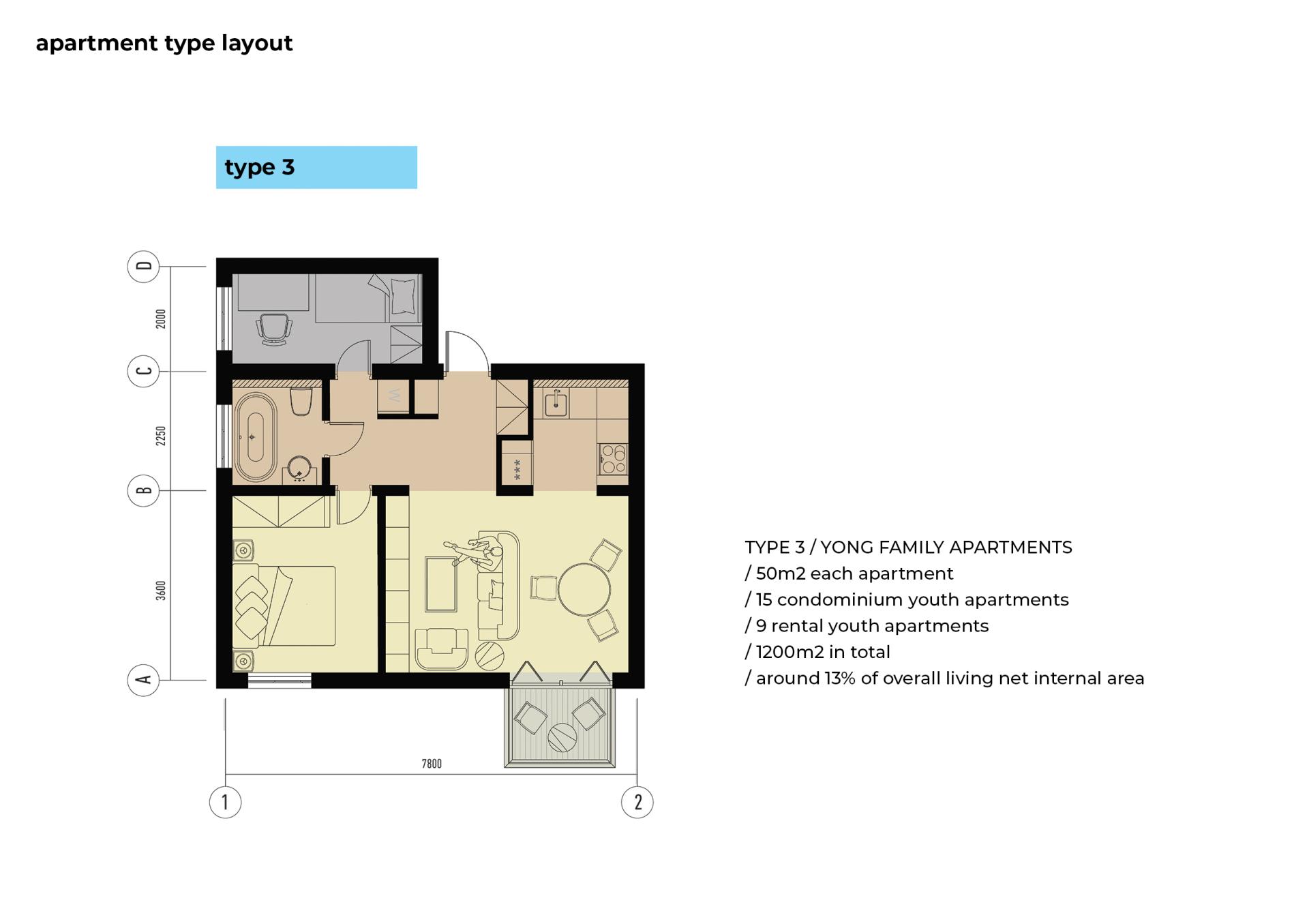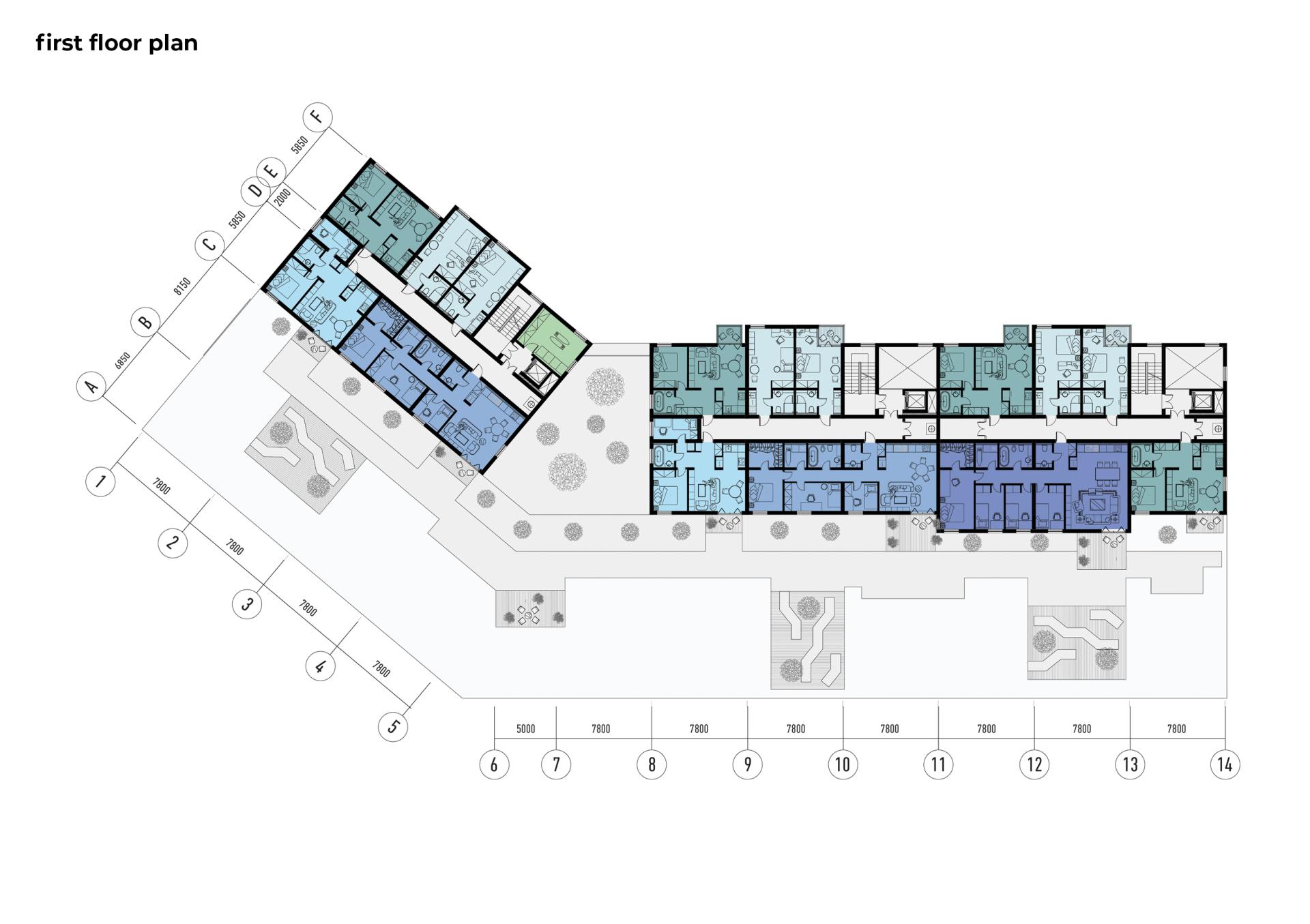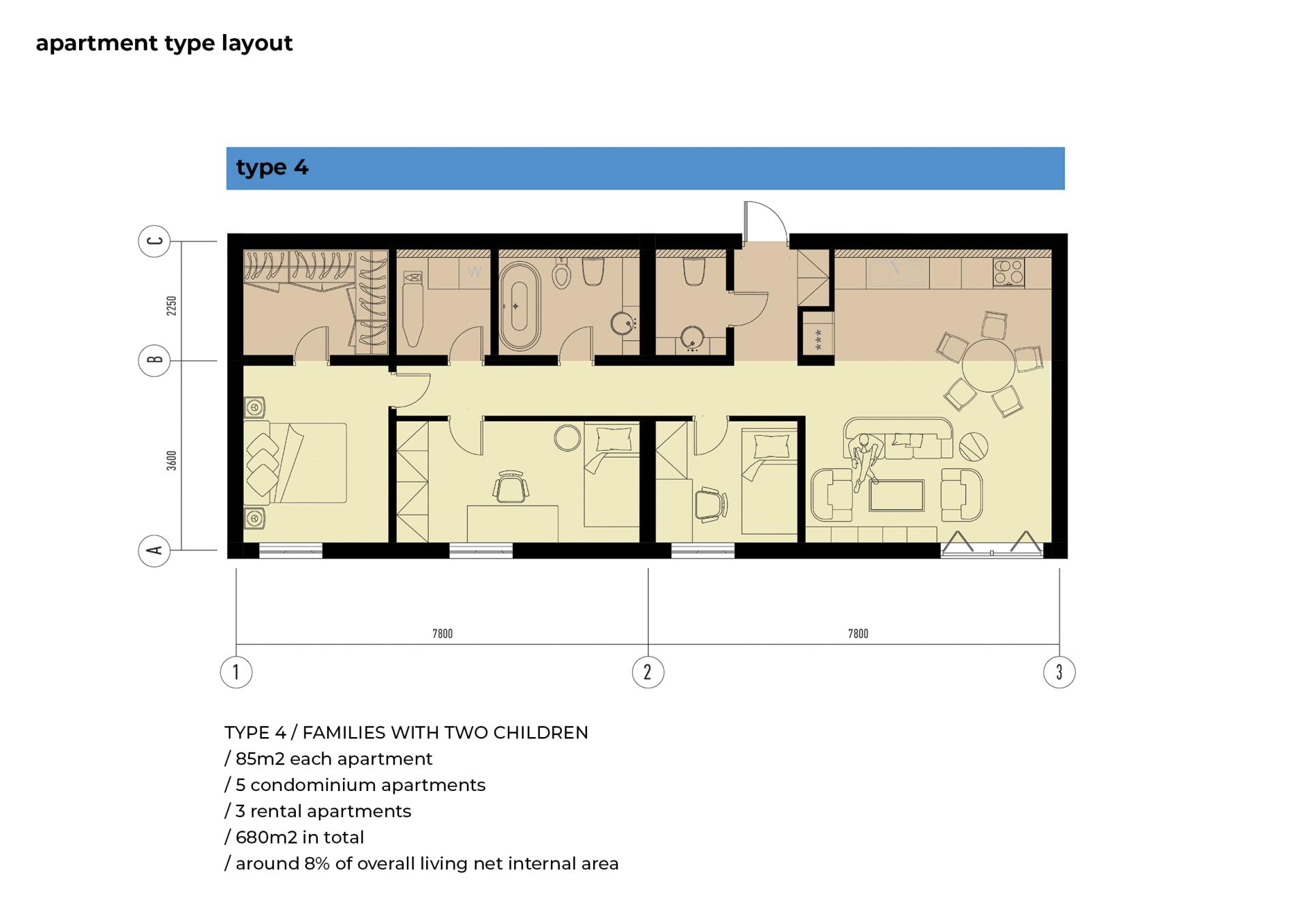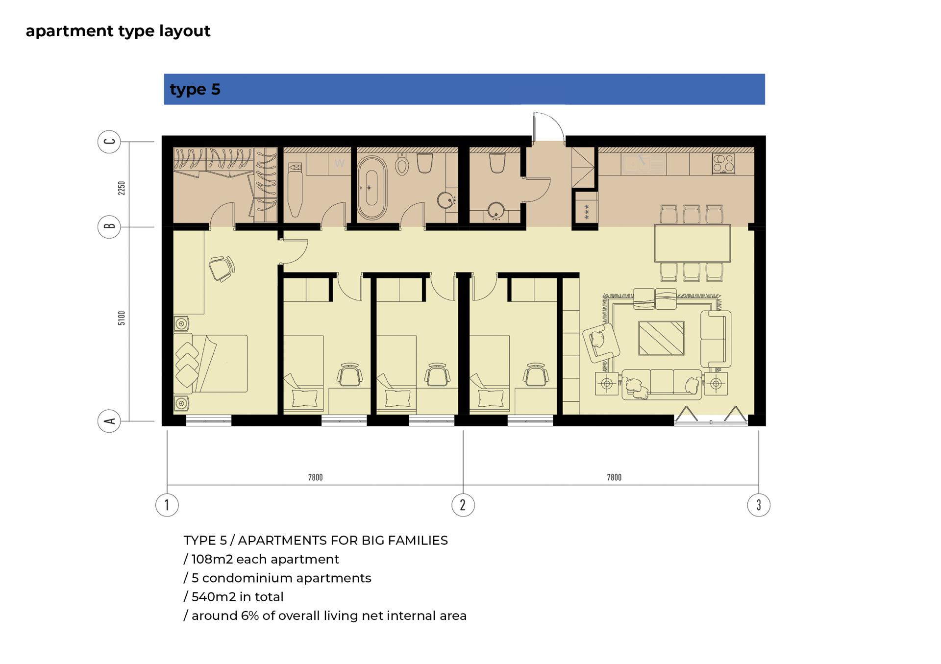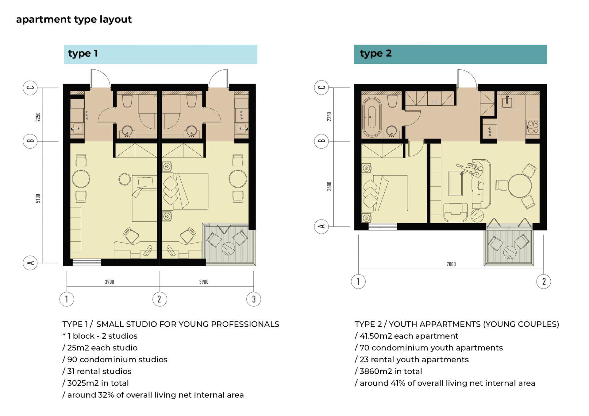 It is also proposed to have different facilities as laundries, playgrounds, gym, bike parking’s, storage spaces that altogether will be useful for residents during their lifetime in the complex as well as to provide common meeting places as courtyards and playgrounds, to help people communicate with each other.