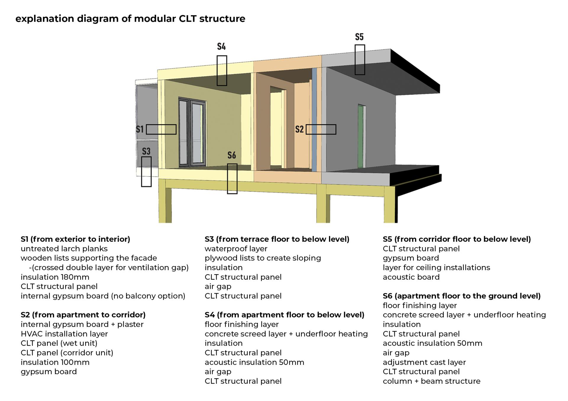 The project will serve as a pilot case to develop and explore the potential of modular prefabricated CLT system modules of medium and multi-story construction to provide environmentally responsible and affordable housing of high quality. It will attempt to make the best possible use of the technical and aesthetic qualities of CLT and to create a wooden building on a large scale with a distinct architectonic expression of its own.