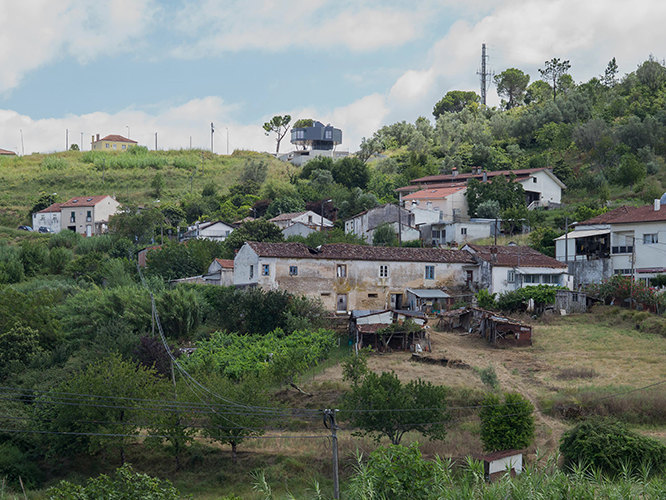 It is a rotating house! The rotating house is the first construction of an allotment located in Banhos Secos - a rural area with a privileged view to the city of Coimbra (Portugal). The existing regulations conditioned the typology of housing (3 bedrooms), the foot print area and the building height. But the option of having an half underground garage to free the ground floor of the house was an architectural option that engender lightness to the house and makes it possible to maintain the visual relation between the public space of the street and the far urban landscape on the opposite side. The rotation of the house around a central axis also provides a dynamic relationship with its diverse context.