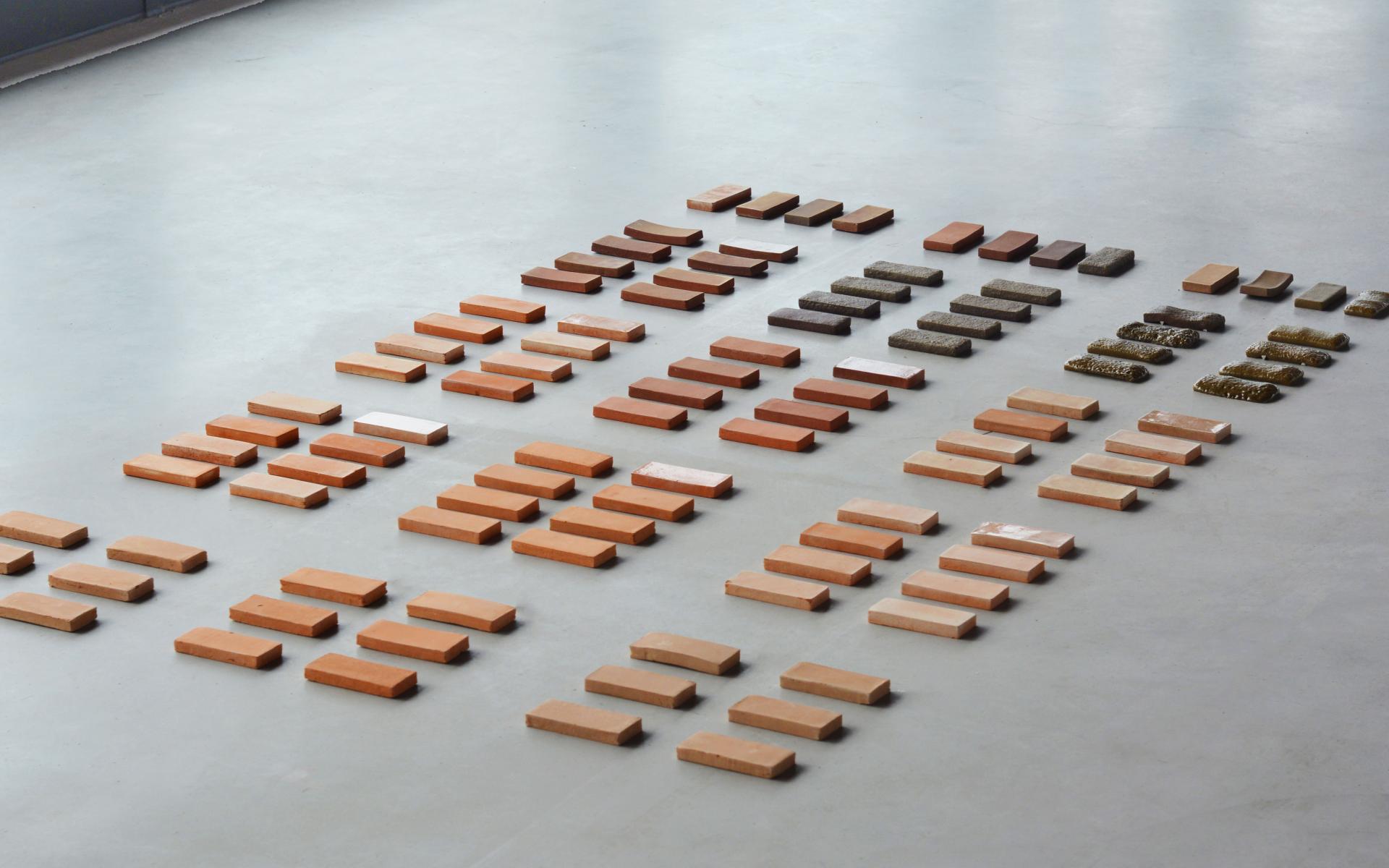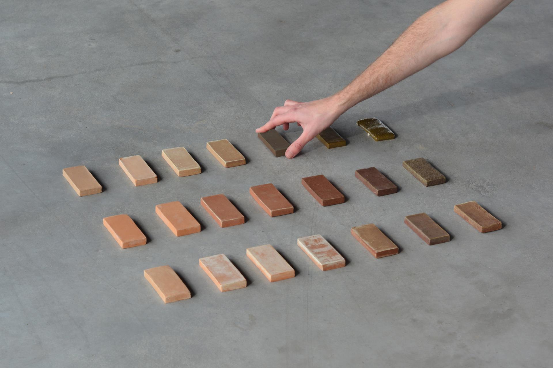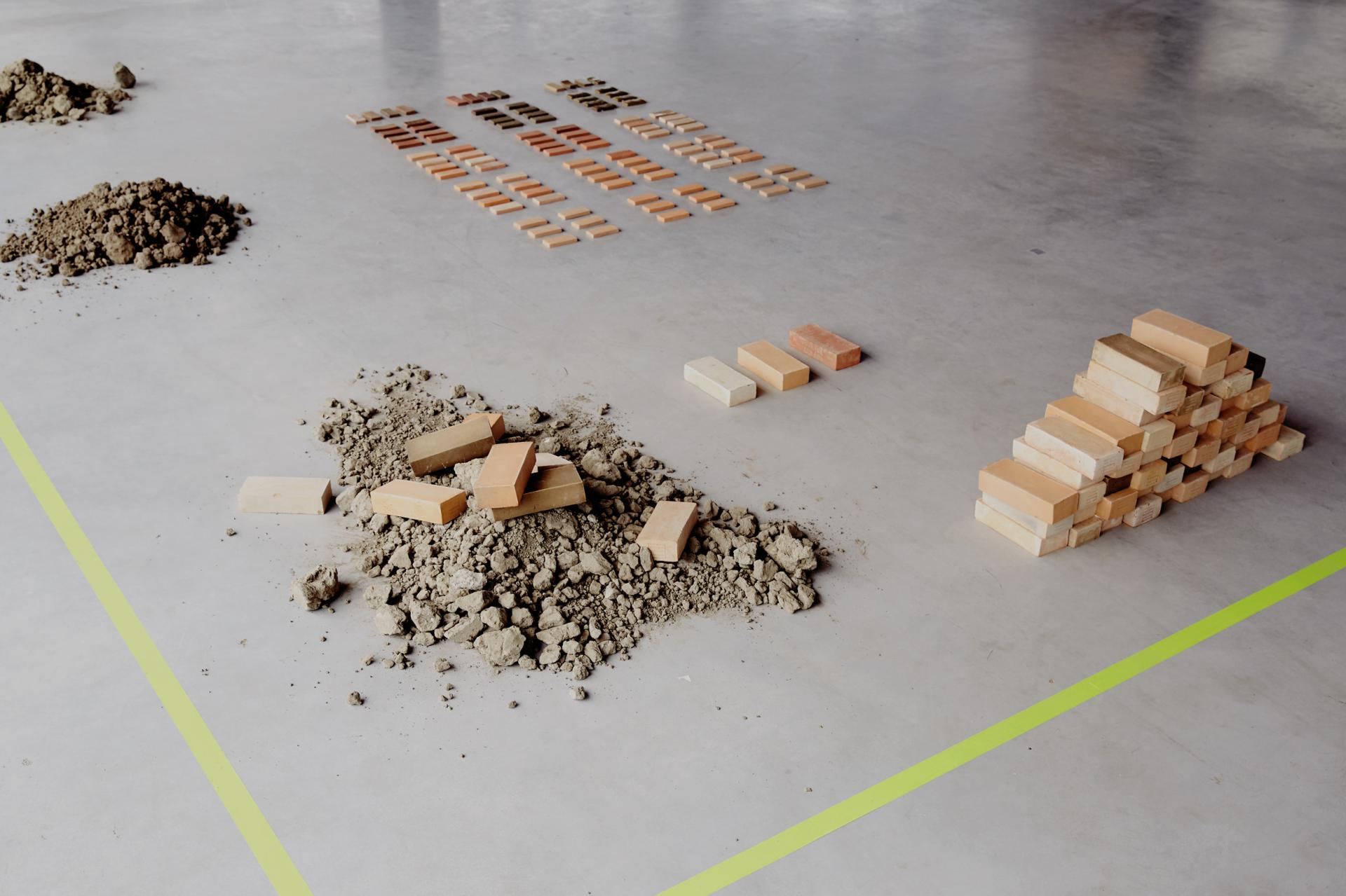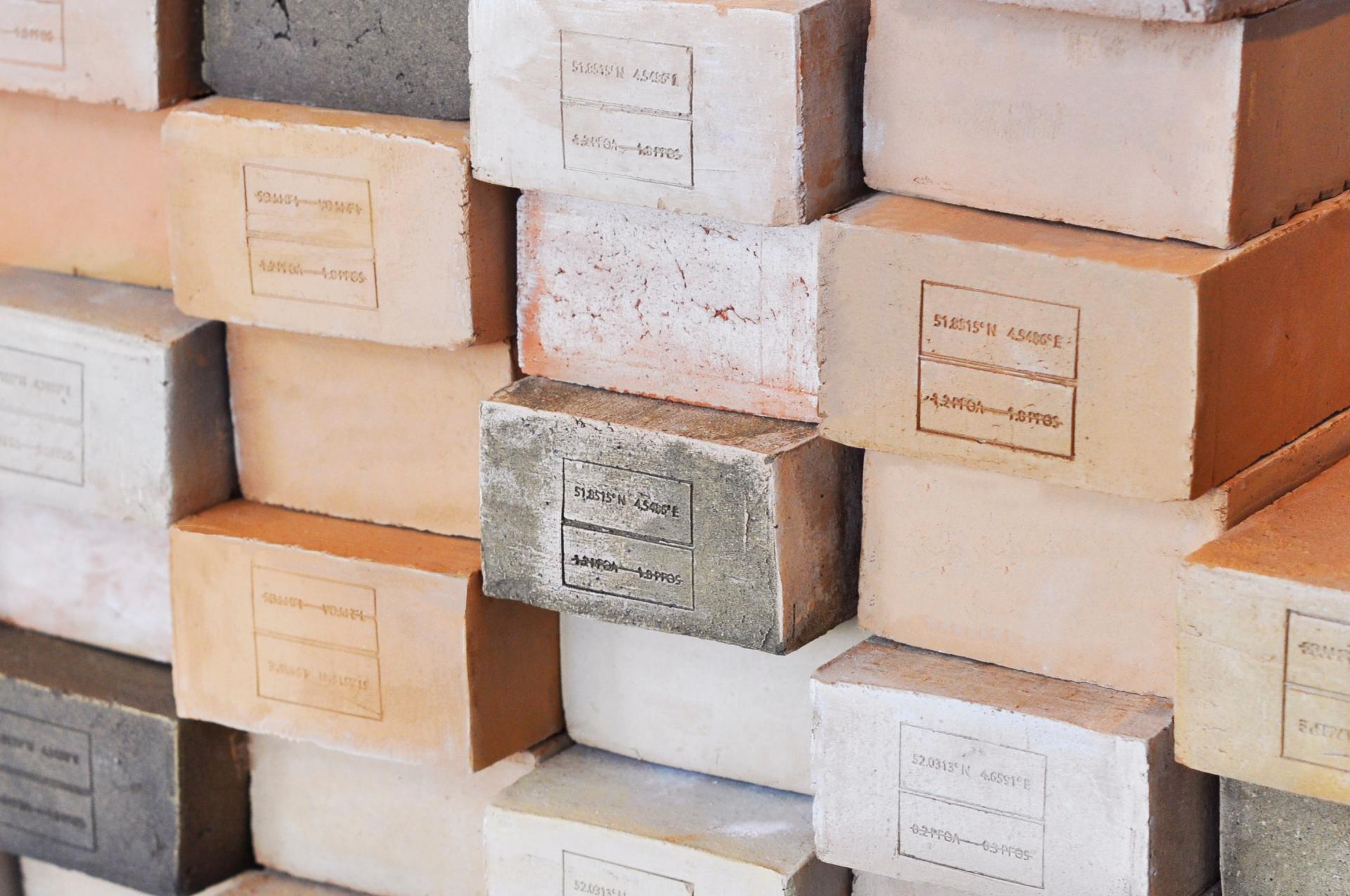 The resulting bricks show a variety of natural hues that reflect the soil they are made of. Depending on location of origin, some soils contain more iron and result in red bricks while others contain more salt and result in greenish yellow bricks. These colors are combined with a stamp stating the coordinates of origin and amount of PFAS the soil once contained. Giving the bricks a lasting reminder of their heritage.