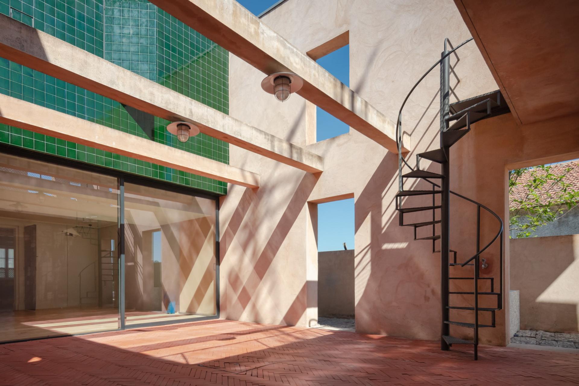 Only the eastern façade gains a new and contemporary image, with a fully glazed base topped by a "blind" wall, lined with Portuguese tiles, and a landscaped flat roof. This façade results from the demolition of the entire interior of the 1980s expansion, creating an exterior patio similar to the "courtyards" typical of vernacular architecture, like an open-air room where all access converges.