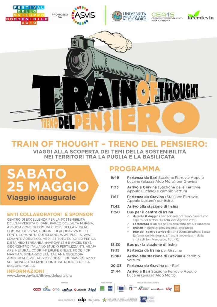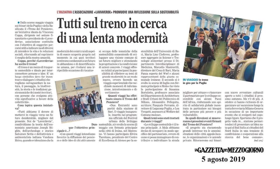 There is no possibility of sustainable development if there is no sharing and cooperation between the stakeholders of a territory (citizenship, economic operators, municipalities and scientific bodies). it is important to develop a strategic vision shared by all these actors that allows them to achieve the common good. The first activity to do is to spread these ideas in an innovative, pleasant, shared and multidisciplinary way, overcoming the obstacles connected with the lecturer - learner relationship and transforming an experience of intellectual engagement into an experience of enjoying the beauty of places and culture. which also gives rise to the desire to preserve them. The organized trips were carried out on the different themes of the 2030 agency between 2018 - 2020, providing for a journey by scheduled train, the arrival in a historical art place, the discussion of the topic with one or more personalities, the tasting of local foods, listening to music and songs by local artists.