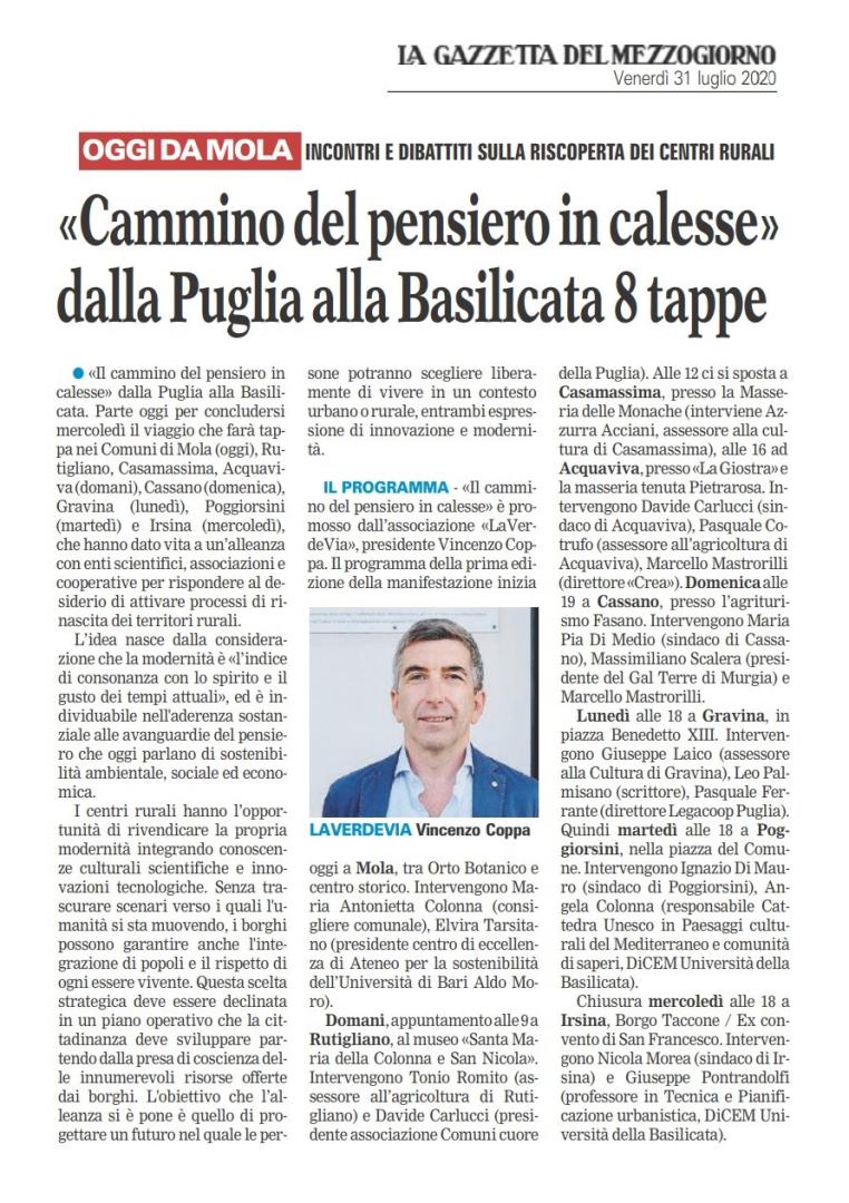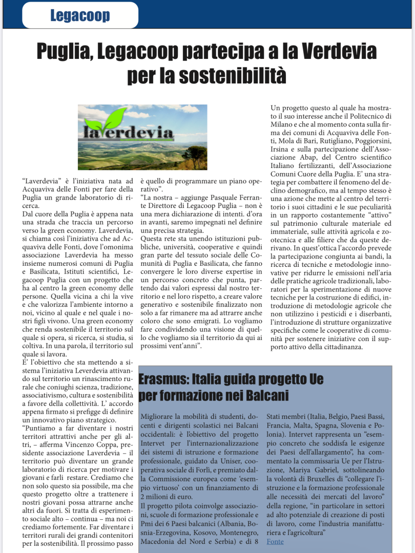 The project was sustained by some founding bodies UNESCO Chair of Basilicata University; Center for Sustainability of Bari University; “LAVERDEVIA”; “Associazione dei Comuni Cuore della Puglia”, CIEC (Italian Scientific Center of Fertilizers); ABAP – A.P.S. “LEGACOOP Puglia”; the Municipalities of Acquaviva; Poggiorsini; Irsina; Mola di Bari; Rutigliano.