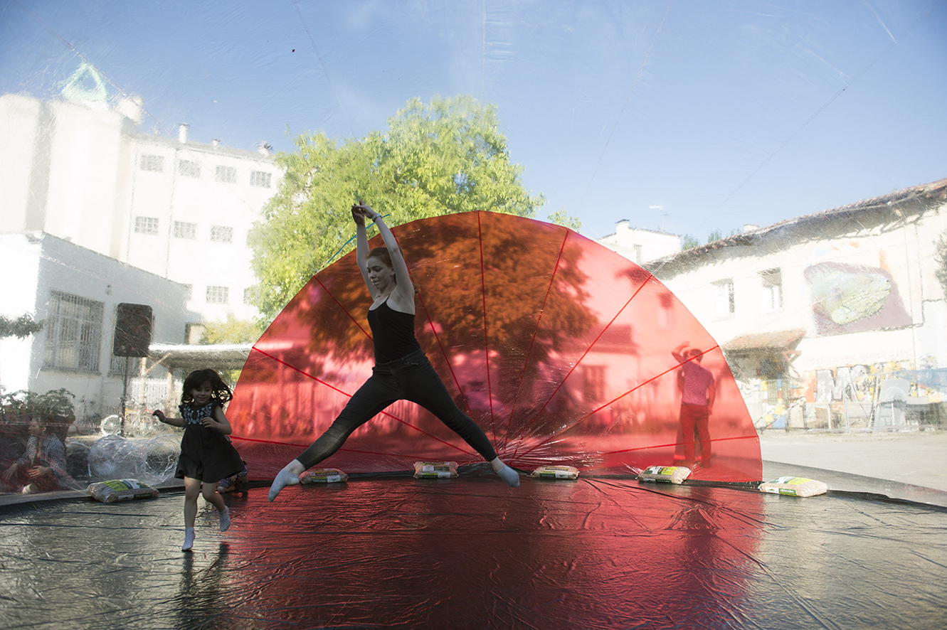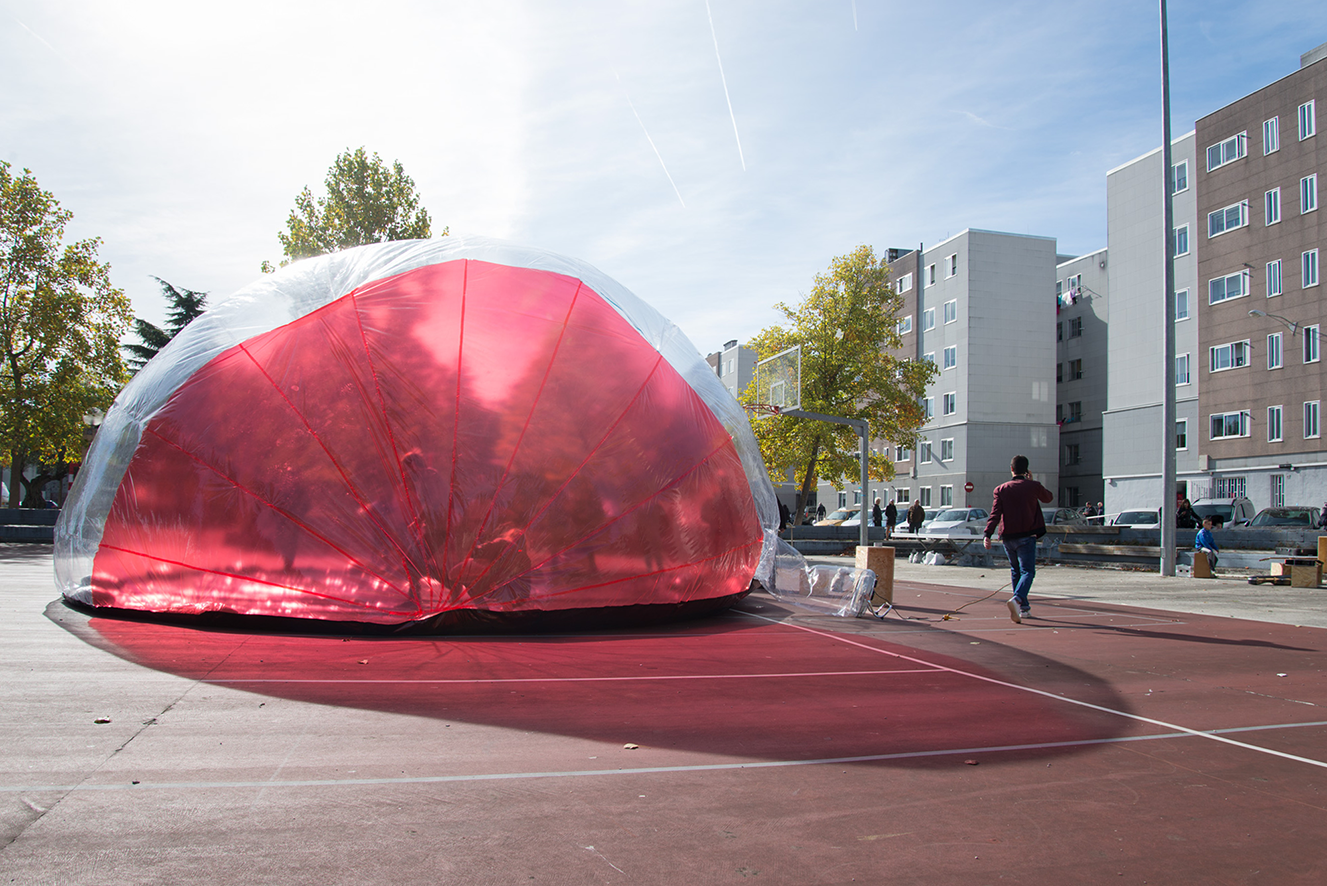 The aim of Repensar la Periferia in Etxabakoitz was to create a dreamlike space different from the existing modernist architecture, and to bring cultural events representative of the diversity of its inhabitants, ideally created with them. The Giant Bubble is a utopian space par excellence, that has been used in architecture since the 1960s – by the architects Buckminster Fuller and Hans-Walter Müller - also echoing in the local context the 1972 Pamplona Encounters in the middle of the Franco dictature. and the architecture created for the occasion by architect José Miguel de Prada Poole as a space of respiration in a middle of a muffled political space.