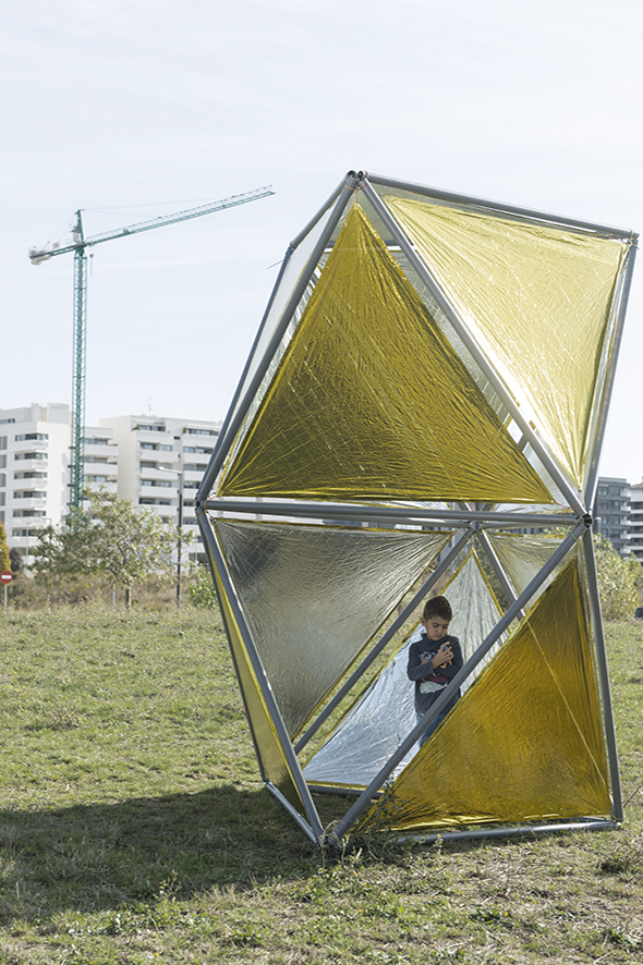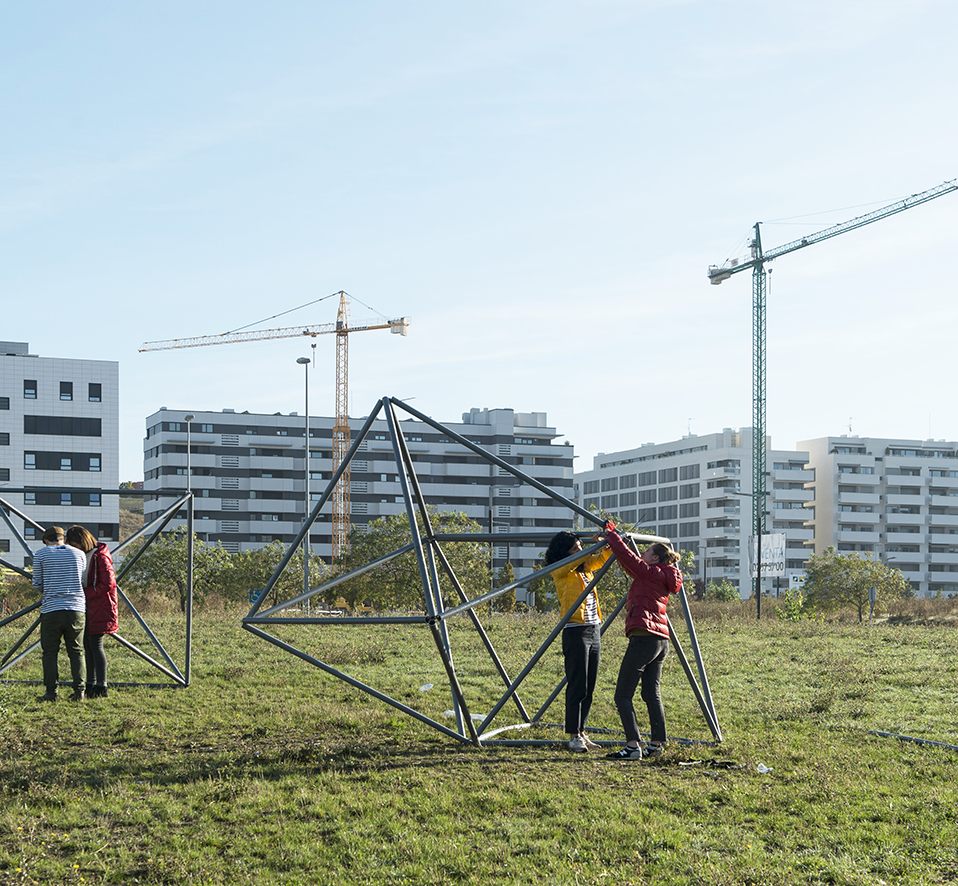 In Soto Lezkairu, the urban plan for this neighbourhood under construction foresees the construction of 6,000 new homes. The unoccupied plots of land with tall grass and advertising panels (promoting the merits of the new housing units for sale next to them) seemed to us to be the ideal terrain to invest in an ephemeral architecture, while these were being built in turn. We imagined light structures - the Poliedros - that would be placed on these still vacant lots. The PVC tubes used to make the structure take up materials used in construction, as an echo of the surrounding building sites. The brand new urban grid of plots imagined for the Soto Lezkairu neighbourhood wipes out a pastoral landscape made up of small agricultural plots and wooded meadows.