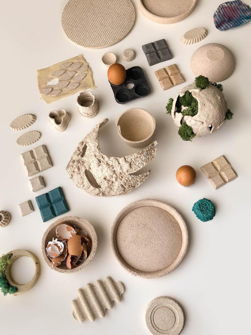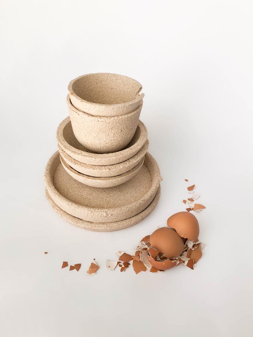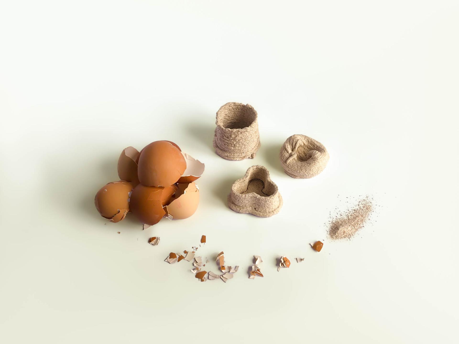 EGG-SHIELD is a concept that proposes to rethink the final destination of products and their waste. It is inspired by the utopia of living in an ´Ecocentric´ world which entails a society whose processes, consumption and disposal of things is always loyal to the planet. Waste is no longer waste, but repurposed as in this case organic residues such as leftover eggshell is harnessed as an asset for the creation of objects that imitate the main purpose of an eggshell: protection. The natural behavior of the material allows it to achieve unique shapes and textures, encouraging the production of new products and the implementation of new processes such as mold-casting and 3D printing. Its circularity is also given by its potential to nourish the soil or be used again as a raw material to produce new things, when its useful life is over.