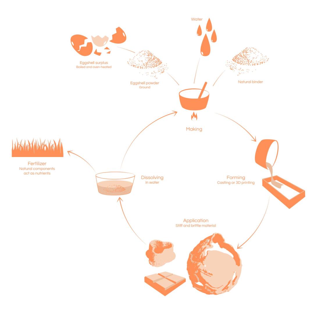 This material-driven project proves throughout the whole process to be a promoter of awareness by critically questioning availability, use and disposal of resources. By shifting from nonrenewable resources to organic waste, EGG-SHIELD proves to contribute to a more sustainable cultural practice. The project reduces the extraction and processing of unsustainable materials because instead it looks into potentials of using eggshell from food/waste industry as a component for a light, cement-or-ceramic-like material.