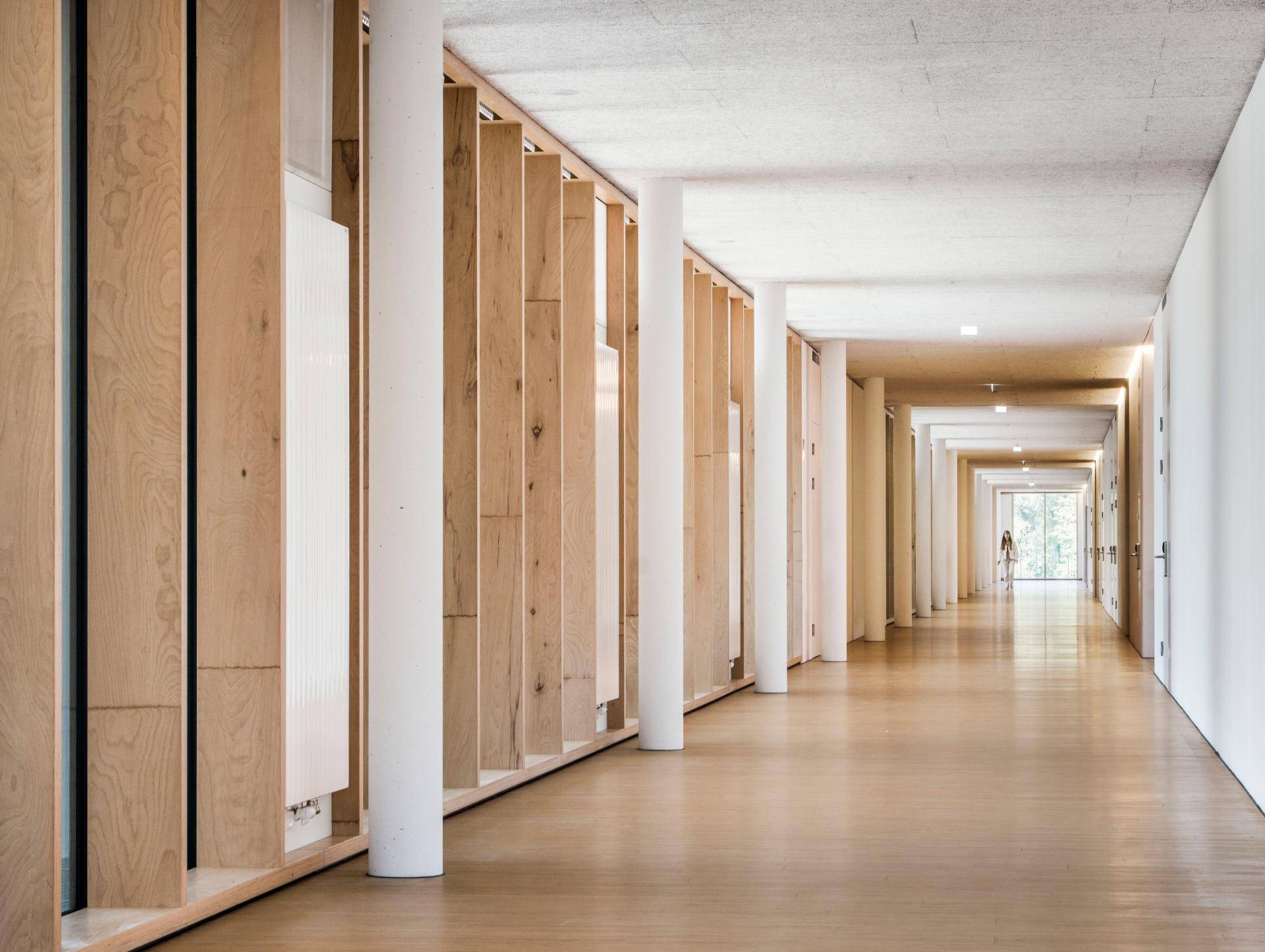 The prevailing atmosphere is one of an open house, in which areas are separated but can be arranged with fluid transitions in order to promote a high degree of interaction. Entry to the main building is via a generously proportioned, covered area on the ground floor that is reminiscent of a square. This continues into the interior as an extended hall.