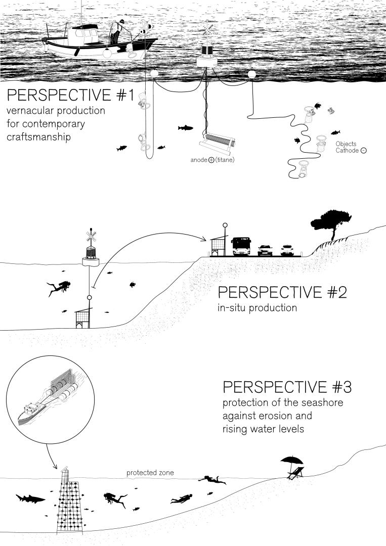 This production method consists of immersing a steel structure (skeleton of the object) connected to a low voltage supply (buoy equipped with solar panels or wind turbines). An electrochemical reaction is triggered. The ocean minerals cluster around the structure. The object creates itself with a material stemming from ocean minerals. At the end of two to three years the result achieved is more resistant that reinforced concrete.