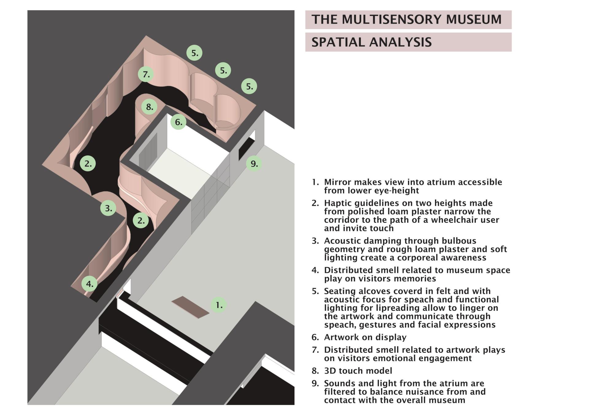 We involved 3 groups of people (with visual, auditory and mobility impairment) in a co-design process with the ambition to design a multisensory museum space that involve the visitors' whole bodily perception when engaging with the art work and during the museum visit. The final design explores the potential of architecture to express issues of inclusion and to support a museum's public functions through an engaging multisensory space.
