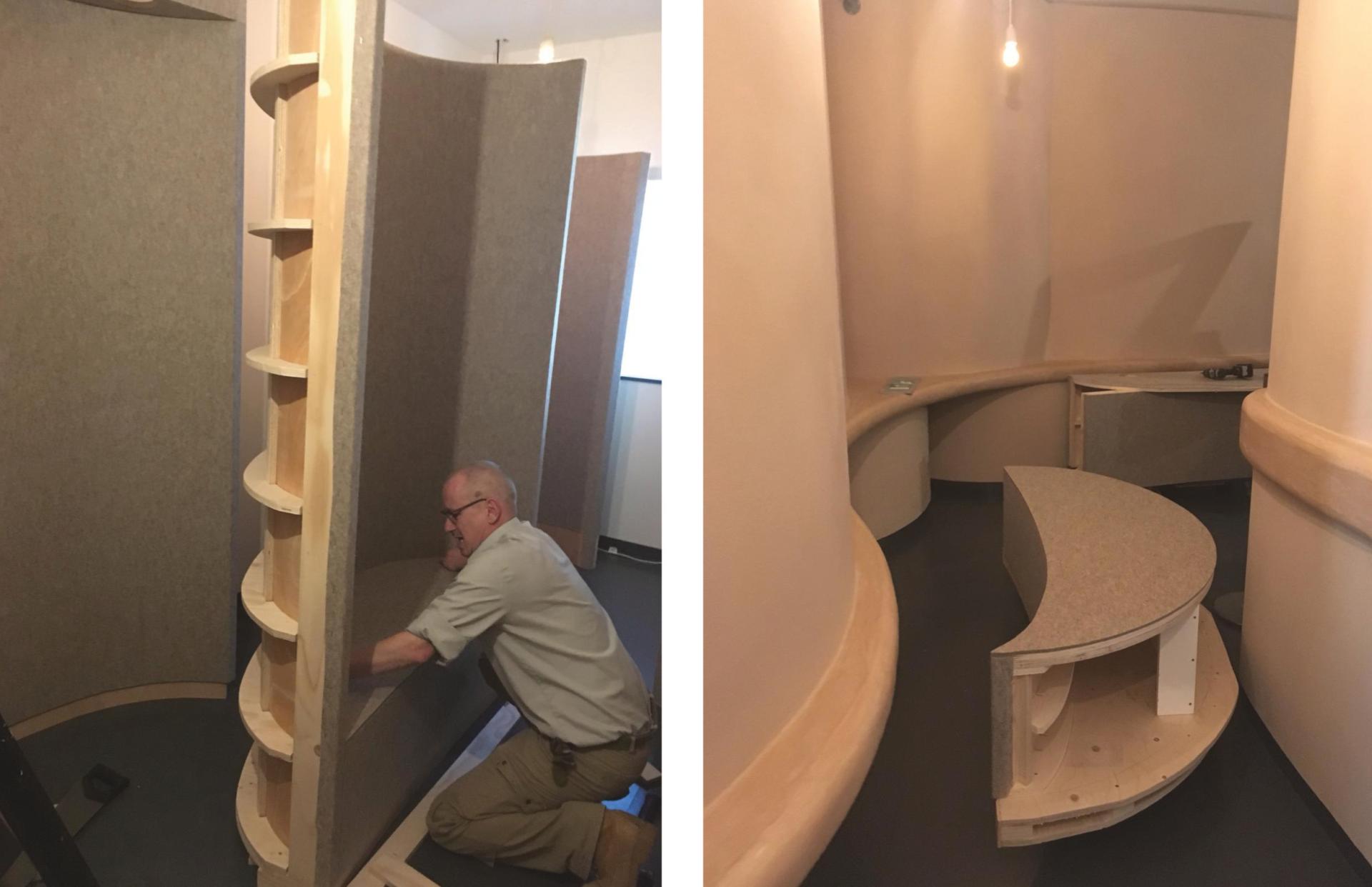The final implementation of the design relied on CNC-milled wooden constructions that are screwed together, and hence can be disassembled. The finishing deliberately uses a limited material palette to make processing afterwards less complex, while achieving a maximum differentiation in textures for acoustic and tactile qualities. Felt for the alcoves is a recycled and recyclable material. Loam plaster for the walls and tactile guide lines is recyclable as well. By experimenting with multiple ways of finishing and additives like sand or natural soaps, this material can both provide a rough texture for acoustic absorption and a very smooth texture, soft to the touch for comfortable tactile guidance. The loam plaster is applied on fiber plaster board which is screwed onto the wooden supports. Whereas support and finish can be disassembled, the separation of the two finish layers remains a challenge. For the lighting we took into account the existing adaptable infrastructure such as light rails and technical false walls.