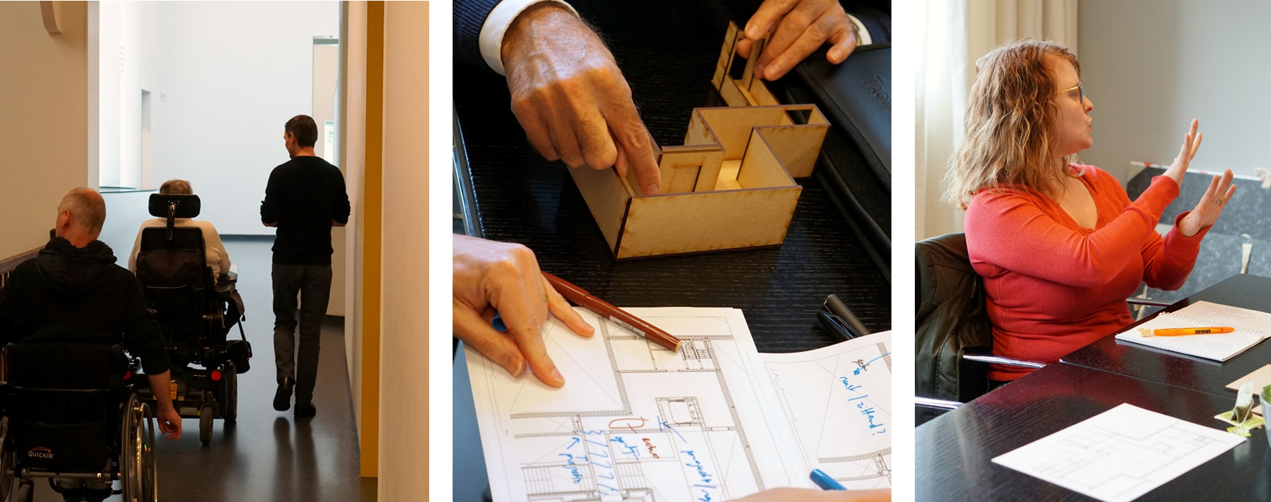 The co-design process involved three groups of people (with visual, auditory and mobility impairments), and was organized in 4 types of sessions. Each group went through the first 3 sessions separately, and a delegate of each group joins the 4th session. Session 1 aimed at gaining an understanding of each other's general spatial experiences and expectations, including the architects' ambitions. A theoretic framework was presented and the space is jointly visited. In session 2, the user/experts were provided with a multitude of representations (amongst which are bare touch models), drawing materials and model making materials. The session started with the user/experts spatially representing their experiences, and from there on move to developing design ideas and representing them in words, drawing or model. The architects only facilitated this creative process by asking questions or providing their skill in representations, but did not make any design move themselves. In session 3, the architects took the lead. They gathered the ideas from session 2 and commented on them towards the whole group. This is for the architects to gain an understanding of the why & how behind the user/experts' design propositions. From there, the architects discussed synergies, contradictions, compromises, ... They formulated ideas on how to tie the multitude of ideas together in one clear spatial concept, in dialogue with the user/experts. In session 4, the delegates present to each other their group's concept and repeat amongst them and with the architects session 3 to reach a joint concept.