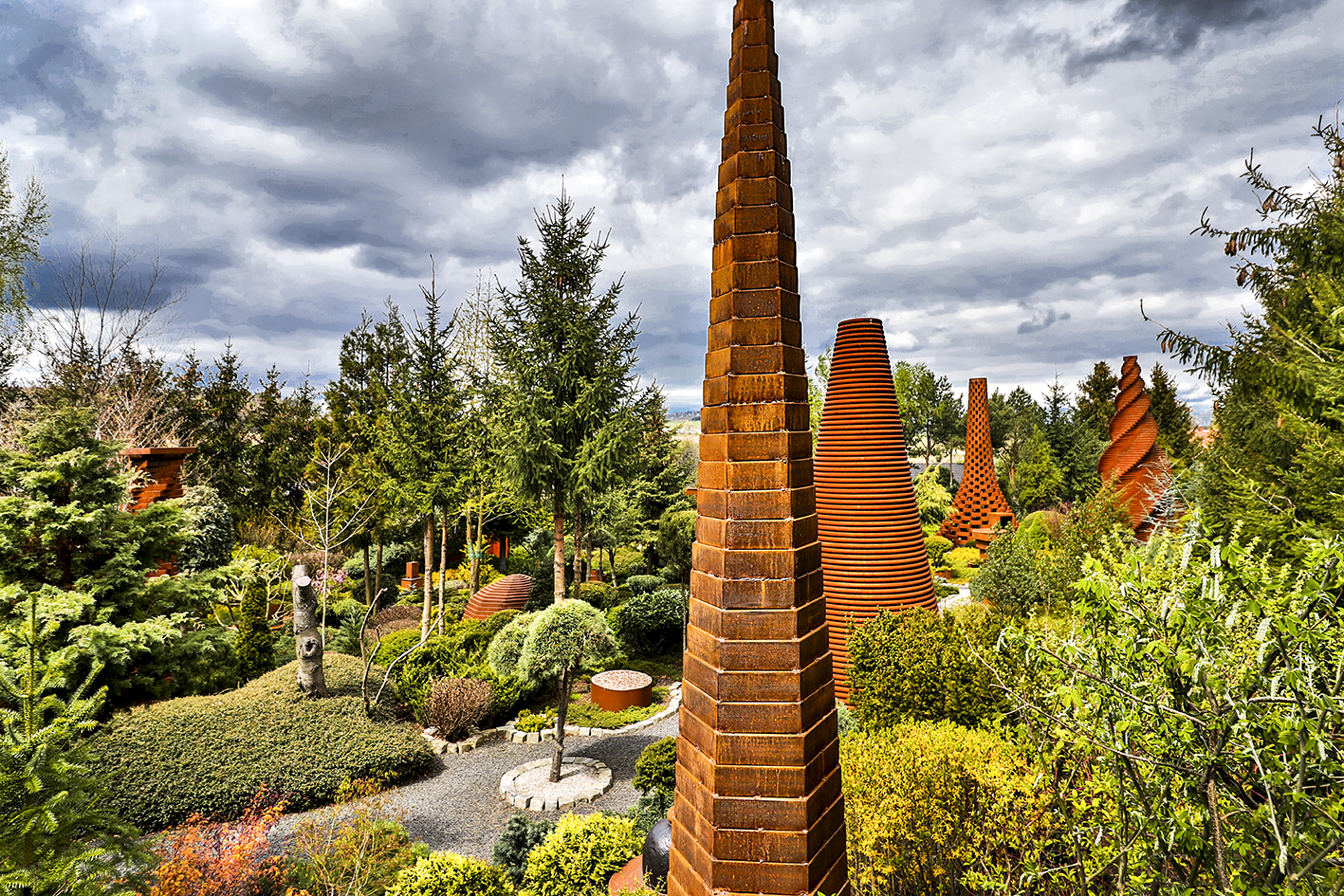 From the artist workshop TowerTopia become a specific test bed for presenting abstract sculptures in a garden. The artist colony is an important trend setter for innovative leisure space not only in Lower Silesia. TowerTopia participates in creating an image of a region that supports building of the new competences on the basis of artistic creation. Namely topiary art, modernization of garden architecture, the use of new materials in the garden context, such as steel, the natural process of destruction of which is part of an ecological approach and a change in the way of thinking about the aesthetics of the garden. It has been also plan to use this specific space, which uses the water containers, for discussion of garden water retention to support the life plant conditions for the coming years. Rainwater storage as a key issue in the climate change will also influence design of small architecture related to gardens, parks and green spaces in cities and villages.