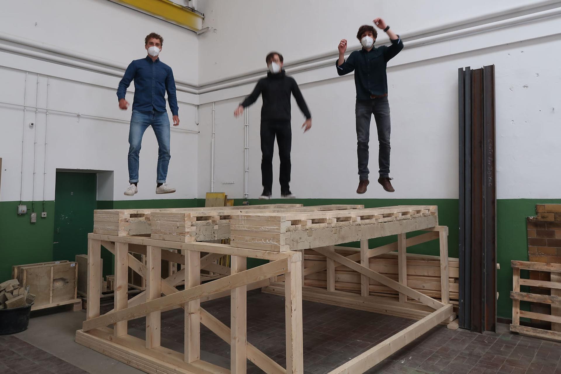 Prototyping the system in 1:1 and under bending, we were surprised to find out that it actually works. The earth infill was solid and did not feature any tension cracks or particles falling down even as jumped around on the slab.