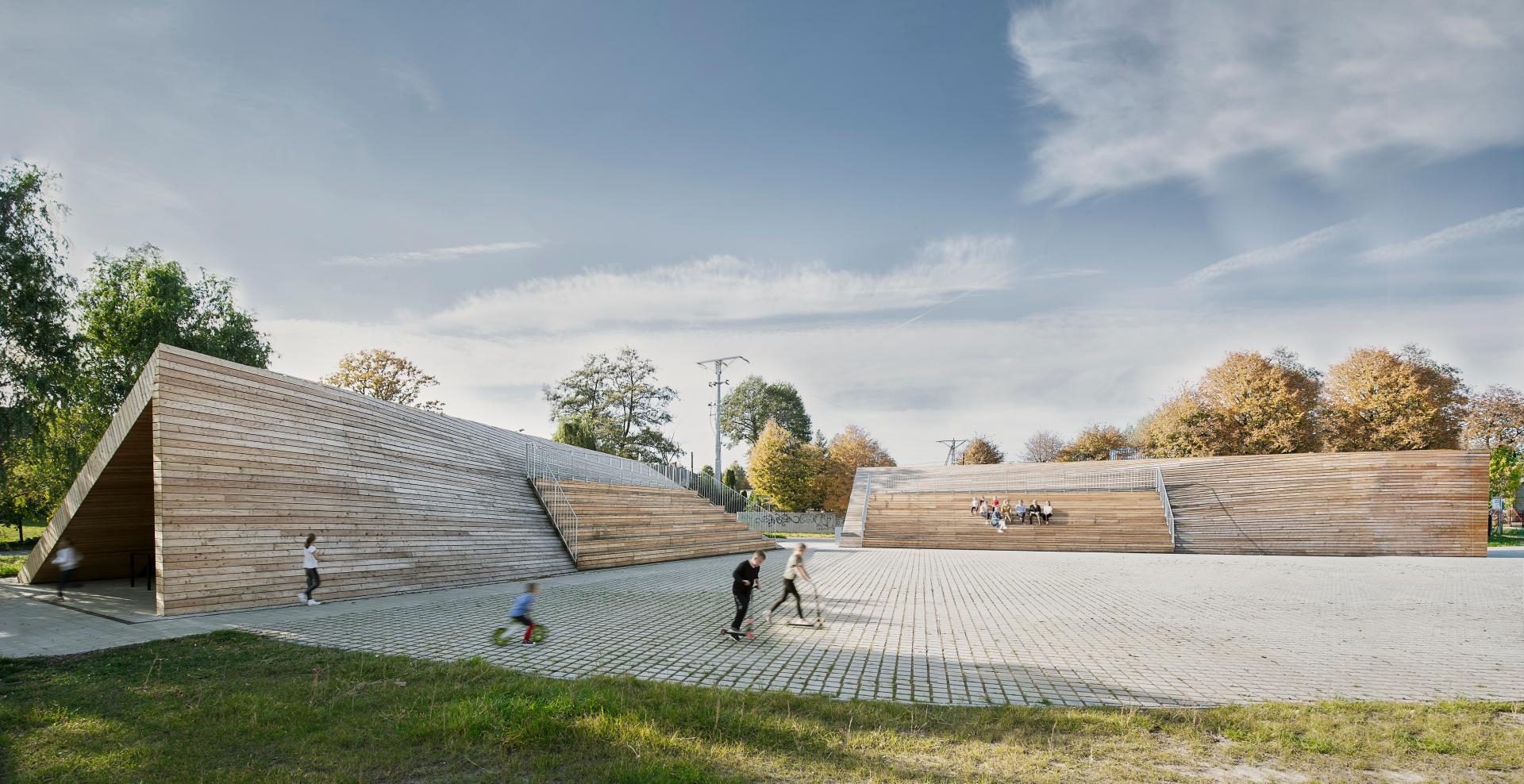 The rhythm of the rafters, lengthening in leaps on one side and shortened on the other, creates a characteristic, twisted roof plane. It fulfills a utilitarian function through the design of the integrated seats, that can be used both during outdoor events as stands and in everyday use as resting places.
