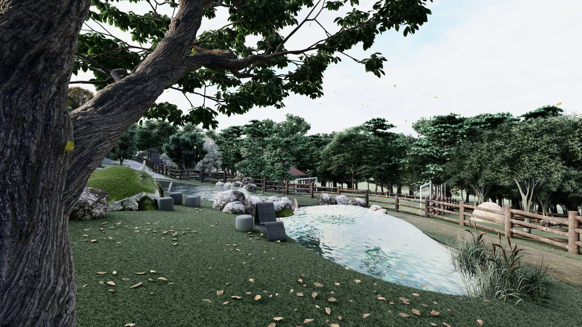 The urban design of the museum is conceived with great emphasis on respect for nature. The surroundings of the museum are overgrown with forest, which is fully preserved in the design. It is proposed to renovate it by treating and preserving the trees and removing the greenery. In the whole area, the original grassy area with meadow plants is proposed to preserve the existing biological diversity. In addition, the museum houses a relaxation area with a lake and a park. In addition to the retention function of rainwater collection and slope water drainage, the lake is also intended to support the biodiversity of aquatic animals. The creation of the lake supports the concept of water retention at the point of impact of precipitation, as only the overflow part is planned for drainage through the sewers.