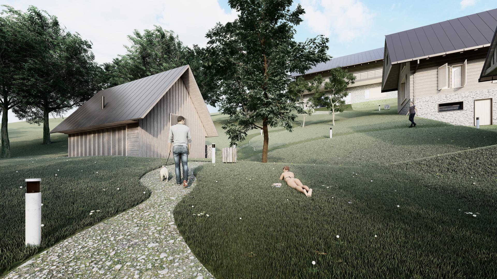 The main building material in the complex is the use of wood. The species is selected for common spruce, which has a large representation in Horehronie. It is proposed to be used for wooden cladding, truss construction, load-bearing columns, large-span beams, and, in the case of shingled roofs, shingles. The wall construction system is designed from CLT panels, which are produced from certified spruce wood from forests, which are planted under the pretext of sustainable management, and which seek to improve all functions of forests for the benefit of the environment. Wooden building materials help to save the energy needed to create a comfortable microclimate, thereby reducing the environmental impact of energy production. The use of wooden materials leads to the planting of additional trees that bind CO2 from the atmosphere. Carbon dioxide remains in the wood throughout the life of the material. Wooden building materials are produced from forests, which are subject to strict rules of the FSC (Forest Stewardship Council) and PEFC (Program for the Endorsement of Forest Certification Schemes).