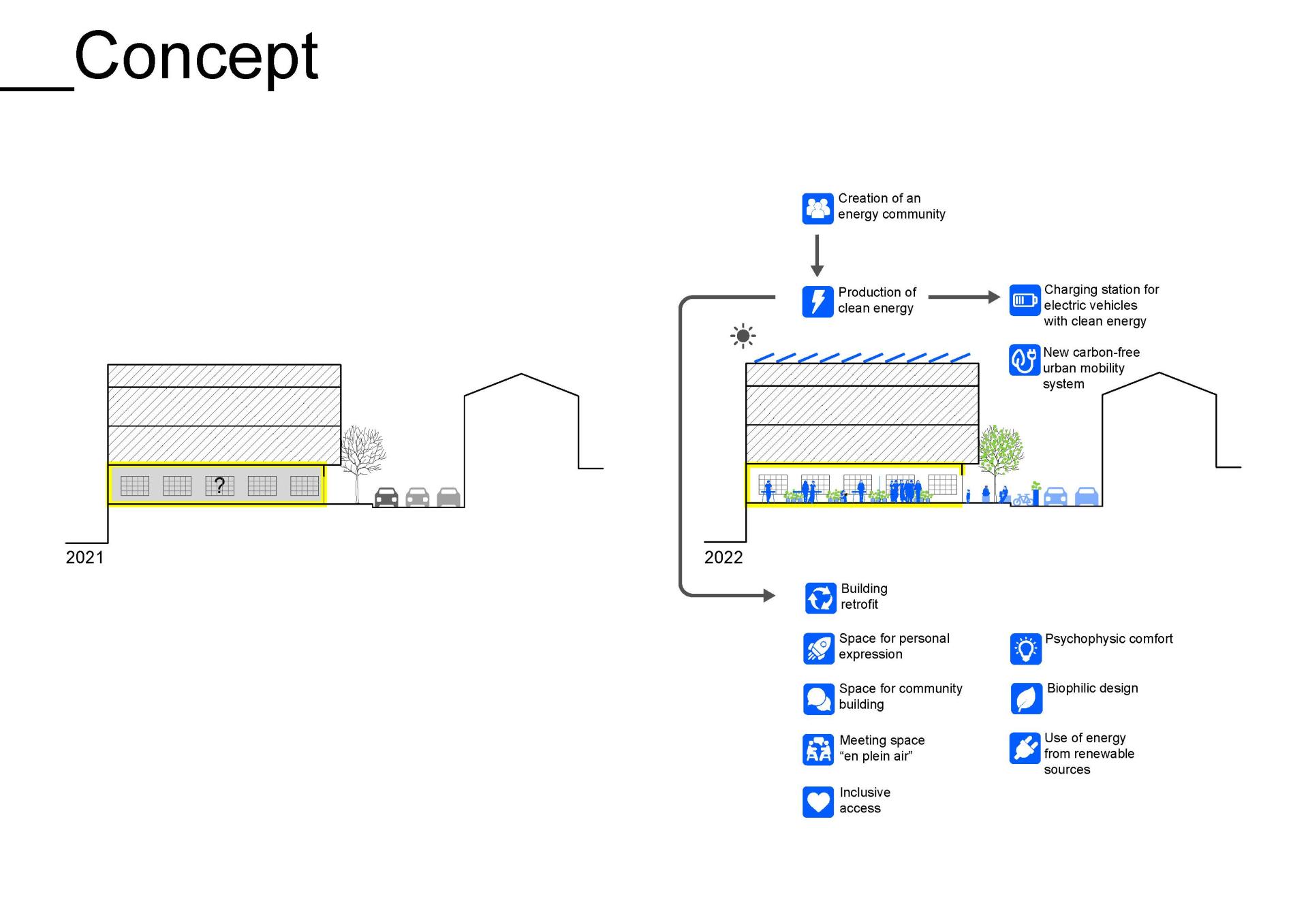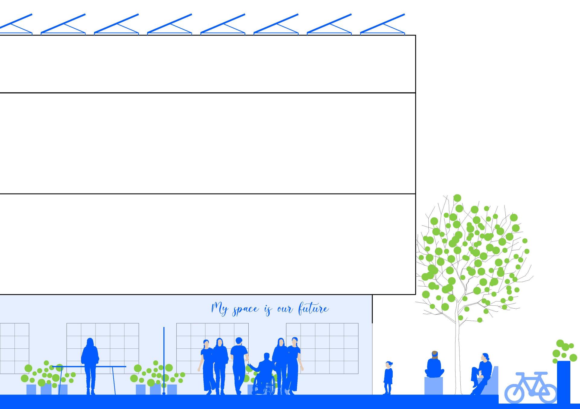 “My space is our future” proposes to establish an energy community of young citizens, that manages the production of clean energy from renewable sources, such as solar panels. Its revenue streams are then invested in the retrofit project of an abandoned space, in order to transform it into a “community hub”. A “community hub” consists of a collective laboratory space for personal exploration and a meeting space for the community. Moreover the produced clean energy is used for charging stations, that support a new shared urban electric mobility system.