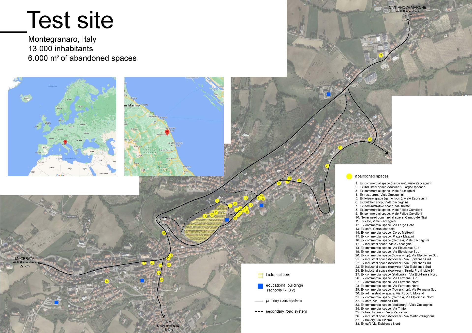 “My space is our future” has an action based approach and uses a test site: Montegranaro, a small Italian urban center, that is experiencing a difficult economical crisis for years. As a matter of fact, nowadays there are about 40 abandoned spaces, previously commercial or industrial spaces.
