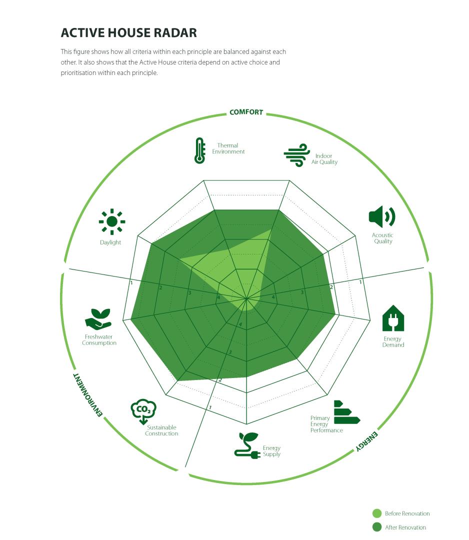 The Active House Radar shows the level of ambition of each of the three main Active House principles: Comfort, Energy, Environment.