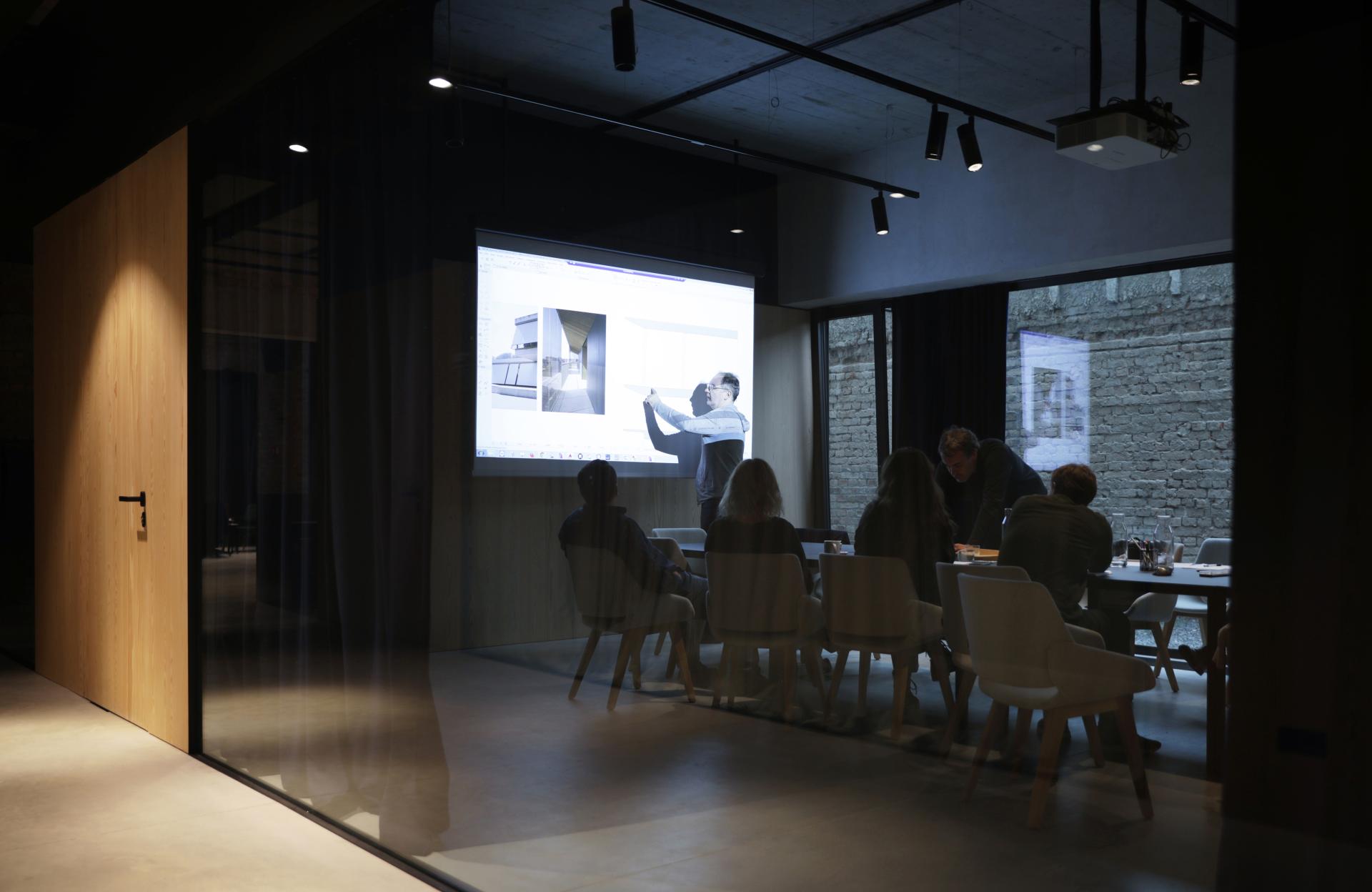 The cinema hall had a three-nave cross-section with a 9m high central volume and two 3m high side aisles. The biggest challenge was converting this space, without any natural light, into a functional workspace. During the reconstruction, the central volume was divided into two floors. The light was introduced into the ground floor by converting the old cinema halls' side aisles into open atriums. On the first floor, the light was provided through the roof – three-meter-wide skylights were placed on the roof.
