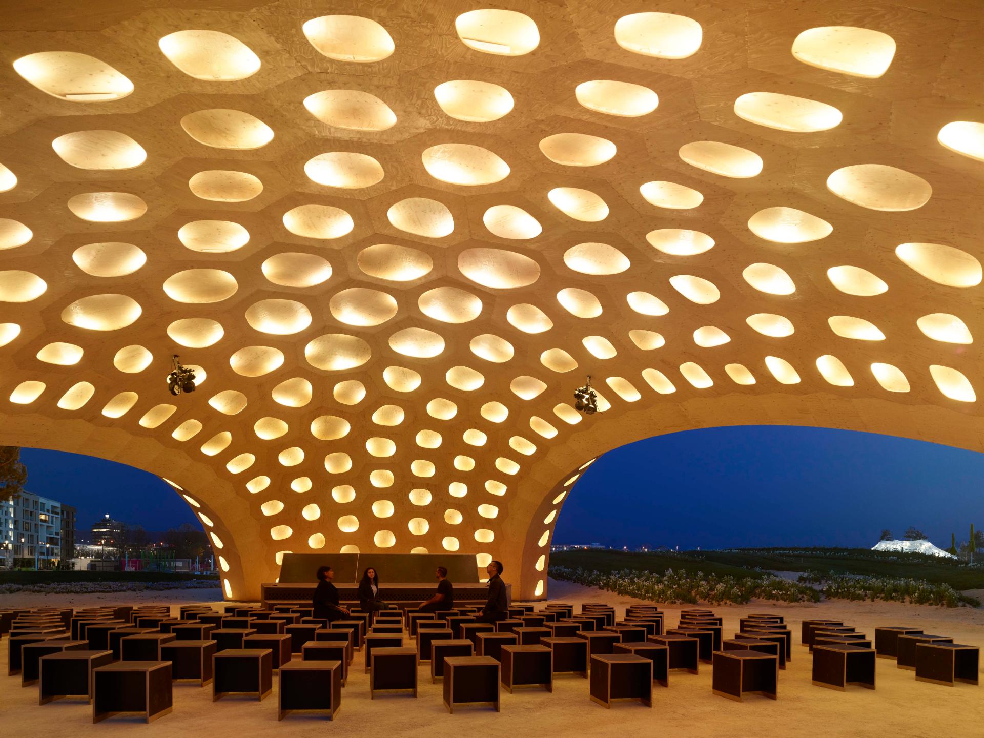 The BUGA Wood Pavilion is located at a central crossroad within the wavy landscape of the BUGA summer island. Three dynamic arches form inviting openings in the main directions and guide visitors into the pavilion’s interior. Hosting concerts and public events, the shell creates a smoothly-curved space that provides exceptional acoustics and generates a unique architectural atmosphere. This is especially true at night, when thousands of LED lights embedded in the shells inner openings light up and bathe the pavilion’s interior in subtle, warm and welcoming light. During the months from April to October 2019 more than 2 million visitors from all over germany and its neighbour countries were visiting the BUGA - with the project's segmented wood shell structure as one of the main attractions. The pavilion's space provided a special environment for a multitude of events: from theater, music and religious celebrations to communal meetings and exhibitions - it's schedule was tightly packed.