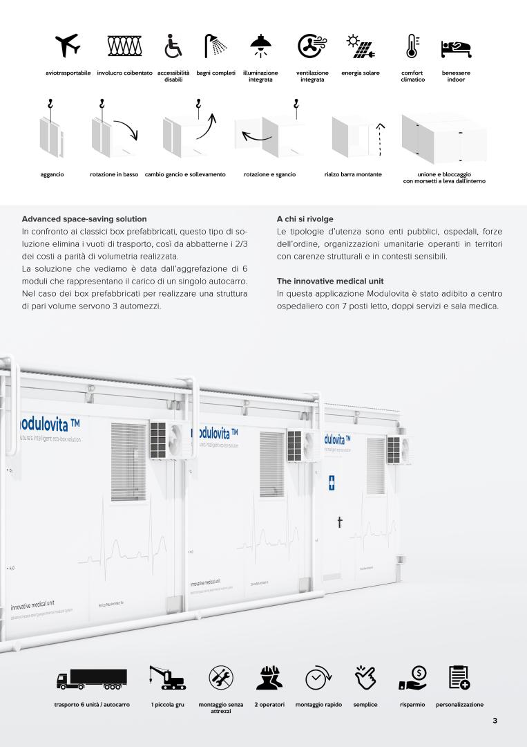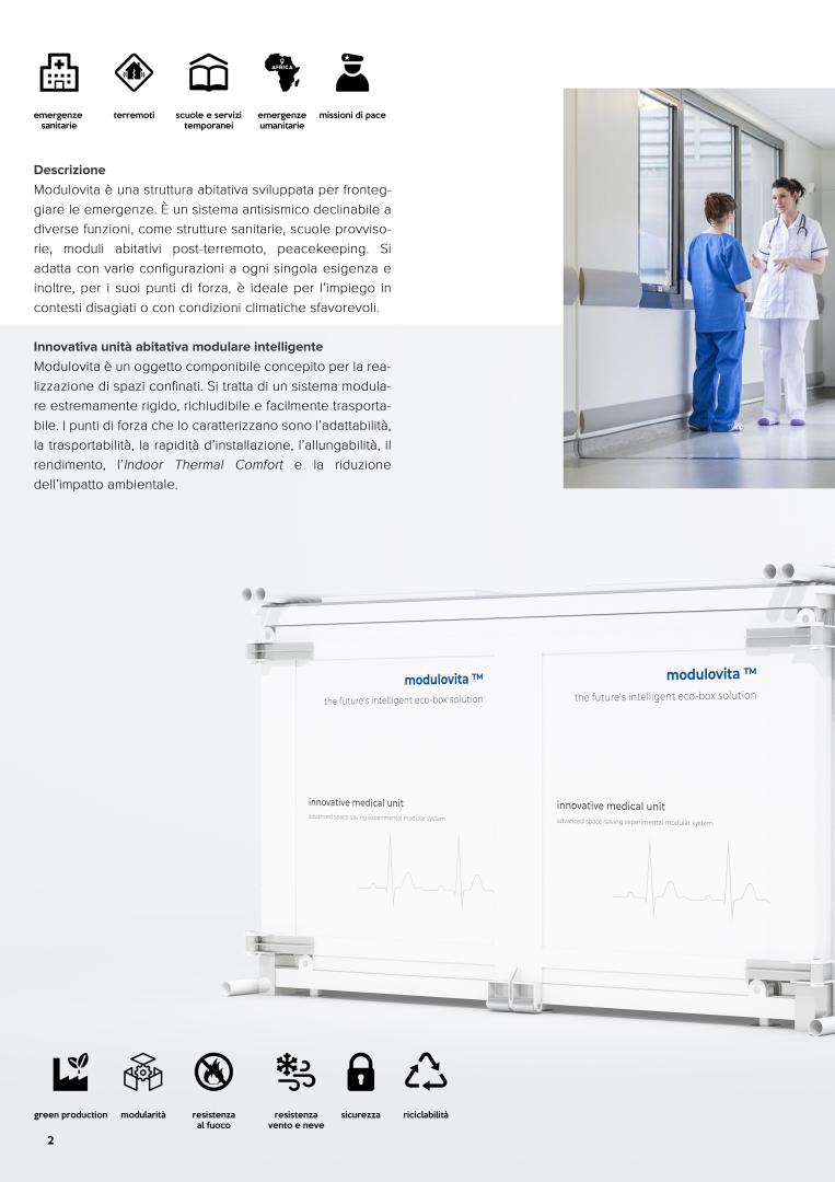 Modulovita is a response to exceptional events and was developed to deal with emergency situations. It is an adaptable and anti-seismic system, suitable for multiple applications, such as health care facilities, temporary schools, post-earthquake housing modules, peacekeeping. It allows customizable configurations on specific needs. It can be installed promptly and is also suitable in difficult contexts or with an unfavorable climate.