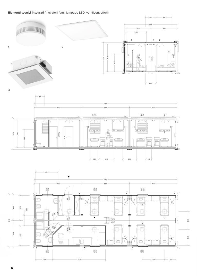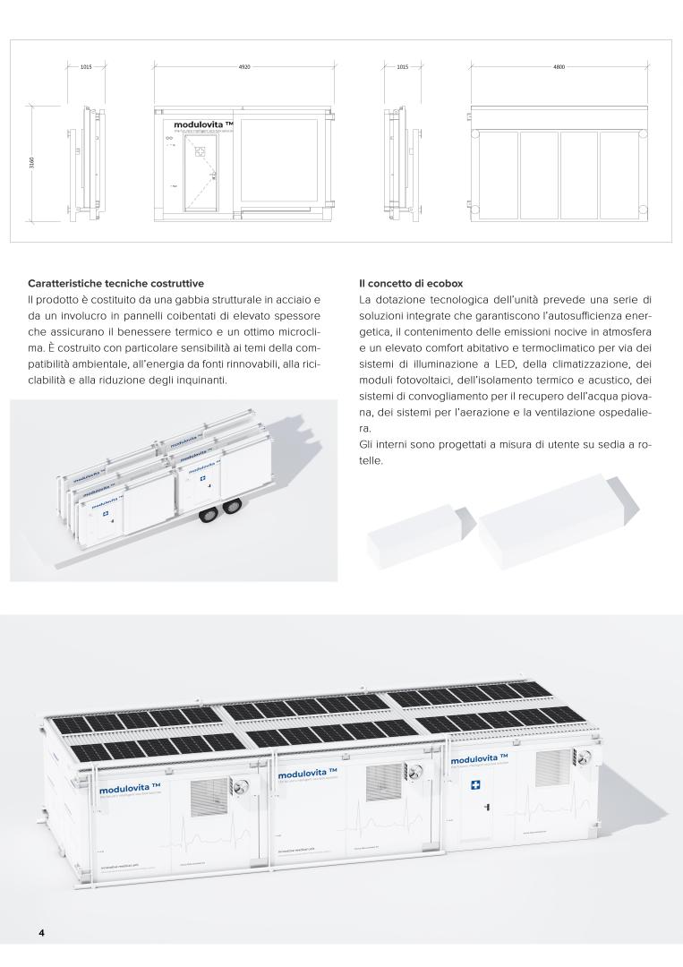 This is an eco-box solution. The technological equipment includes a series of integrated solutions designed to ensure energy self-sufficiency, contain polluting emissions and improve environmental performance, through: LED lighting, innovative air conditioning systems, photovoltaic modules, thermal insulation, recovery and reuse systems. rainwater, integrated systems for aeration and hospital ventilation.