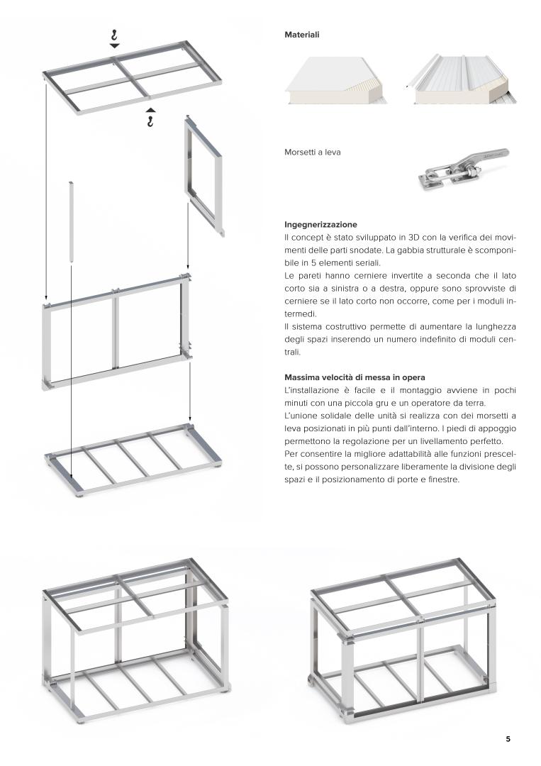 Installation is quick and easy. Assembly requires only a small crane and a ground operator. The operations are completed in a few minutes without using tools. The union of the units takes place with lever clamps positioned internally in several points. The support feet allow adjustment to achieve perfect leveling.