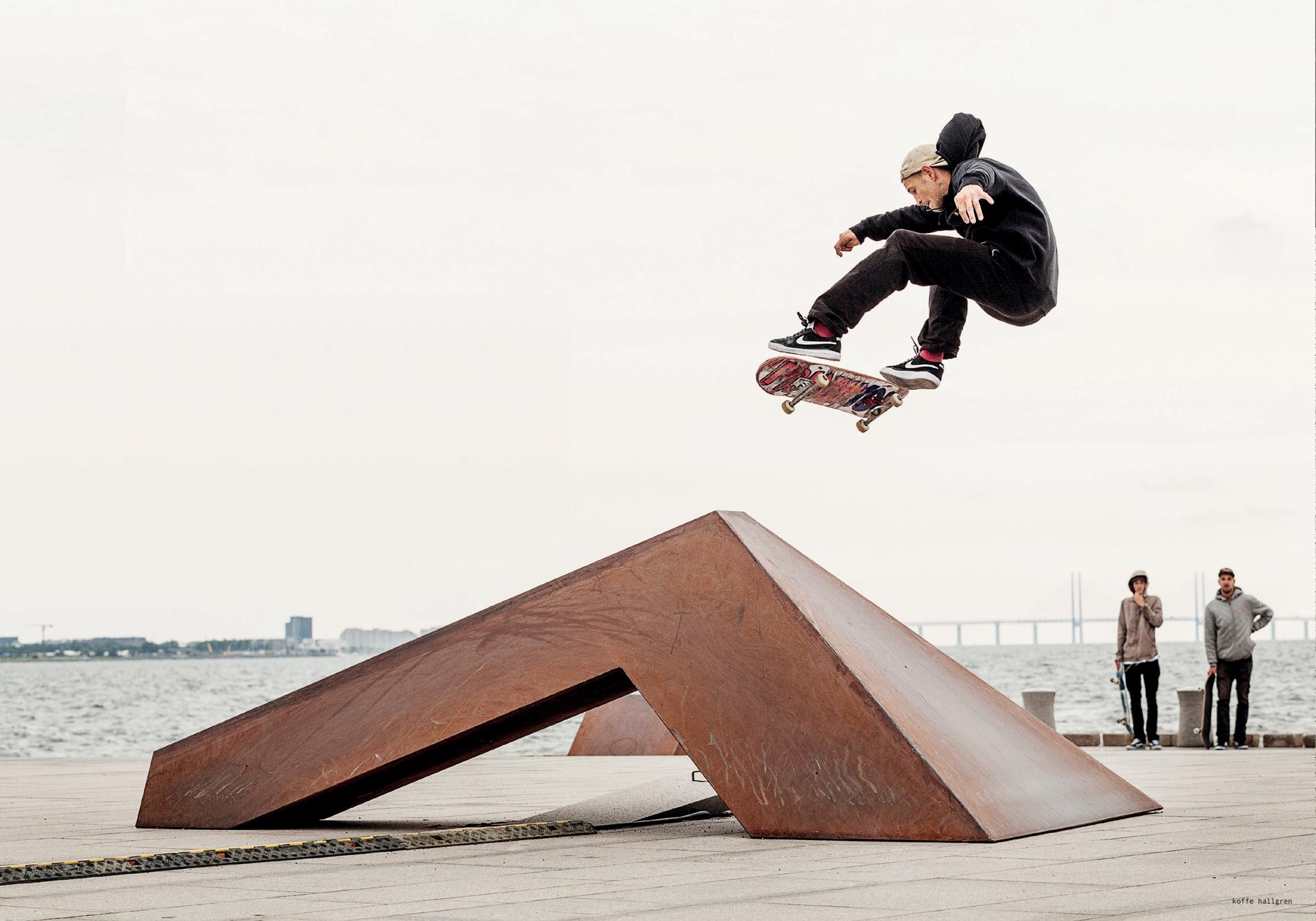There is a red thread in the works of Rich Holland. Rich creates spaces that will allow the creativity of the person’s engaging with these spaces to flourish. The sculptures designed for Malmö are authentic skate objects in the sense that they provide a nod to existing skateboard practices, but with a forward-looking twist. The objects can be placed in different configurations, as well as they themselves can shape-shift depending on what direction they are placed in. The objects allow for skaters of all abilities to be challenged and engaged, as well as providing interesting play objects for those without wheels, or indeed a resting place.