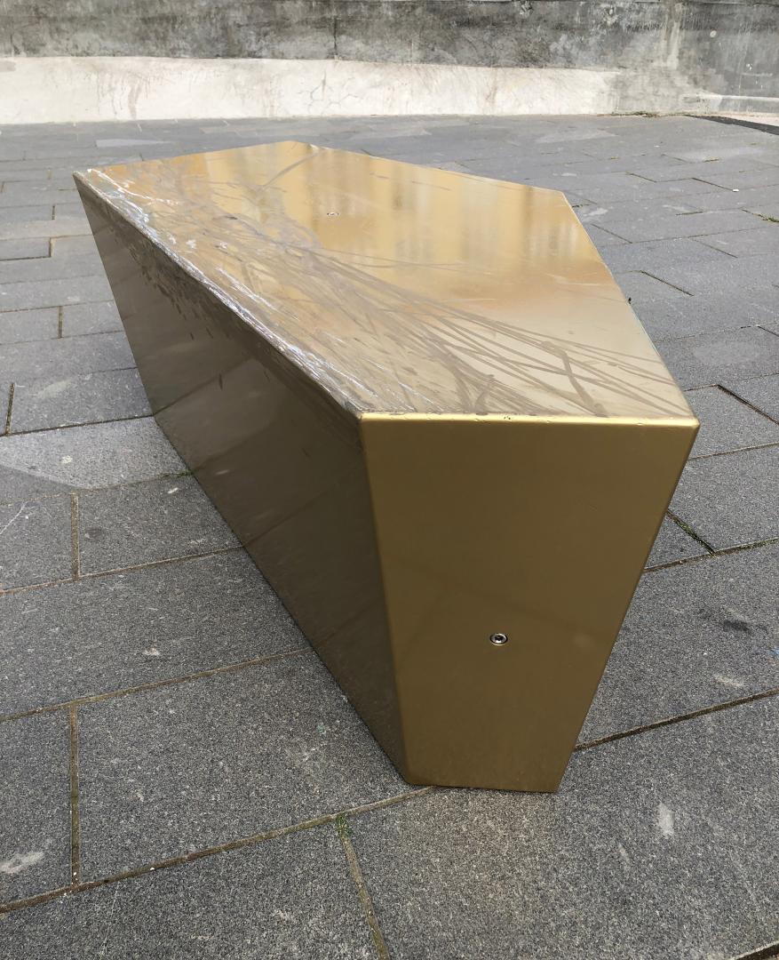 We’re All Golden is a collection of five sculptures. Together the sculptures can be arranged in a variety of ways, each time providing surprising and dynamic flows through the public spaces of Malmö. We’re All Golden invites skateboarders as a primary target audience, however, the way the sculptures are designed also invites other visitors, as a place to rest, meet, climb and view the city through a new lens. The larger collection of sculptures that Malmö uses, originated in Berlin in 2013, as a series of modular sculptures based on ideas of inclusion of skateboarding within the city, steaming from the architecture movement that first appeared in London in 2004.