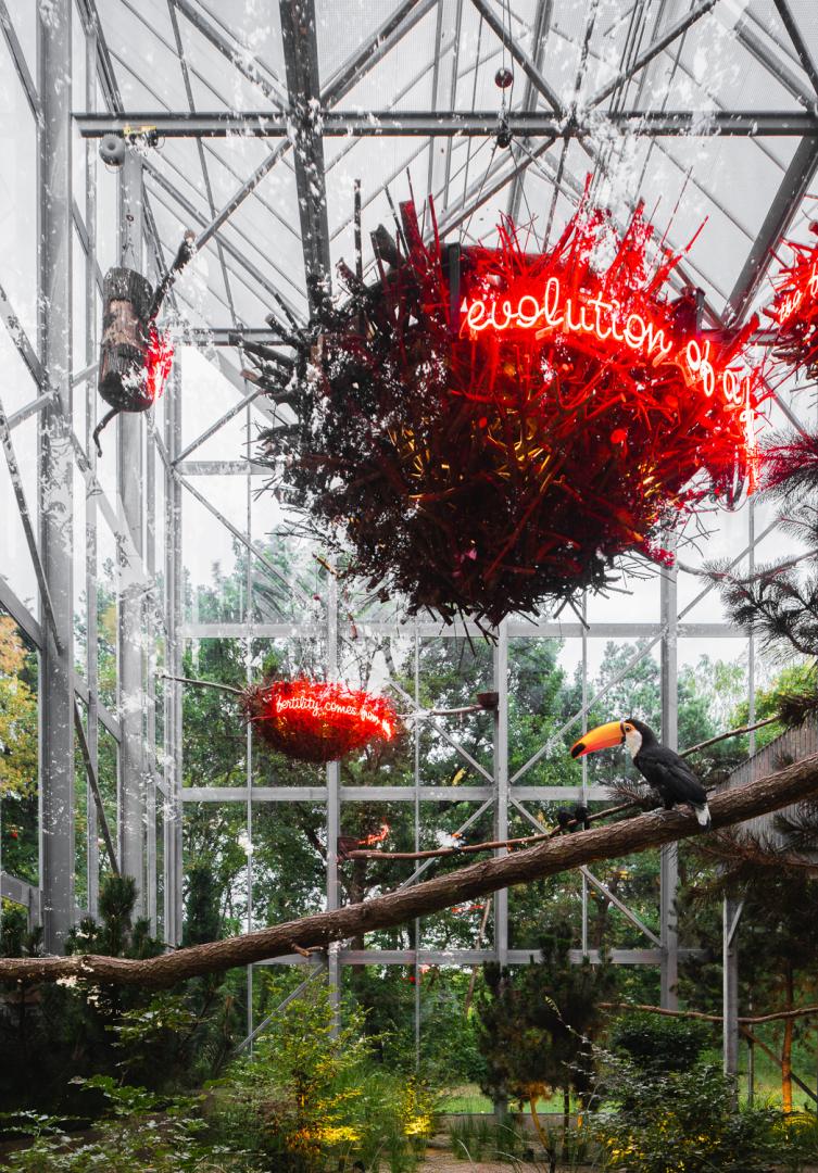 LABIOMISTA also integrates different architectural highlights and heritage elements. The Ark, the entrance to the park and The Battery, Vanmechelen’s studio, are built by Swiss architect Mario Botta. Both buildings resonate in their simplicity and are raised in the same black stone, a reference to the location’s history as a coal mining site. The Battery contains an extraordinary greenhouse (The Looking Glass) and a huge eagle aviary. Villa OpUnDi dates from 1925. Listed as a monument, it exemplifies an eclectic-historical style with features of Mosan Renaissance. Team van Meer architects & co. restored the interior. Furniture and installations are by Vanmechelen. LabOvo, the pavilion in the Cosmopolitan Culture Park is designed by Belgian-Spanish architectural firm Van Belle & Medina Architects. The Cosmopolitan Culture Park was designed by BURO Landschap, a Belgian landscape planning and urban design firm. The animals in the park, which play an essential inspirational role in the artist’s work, represent the diversity that typifies our world. They roam freely through most of the compounds, allowing them to develop their own hierarchical structures and natural ecosystems