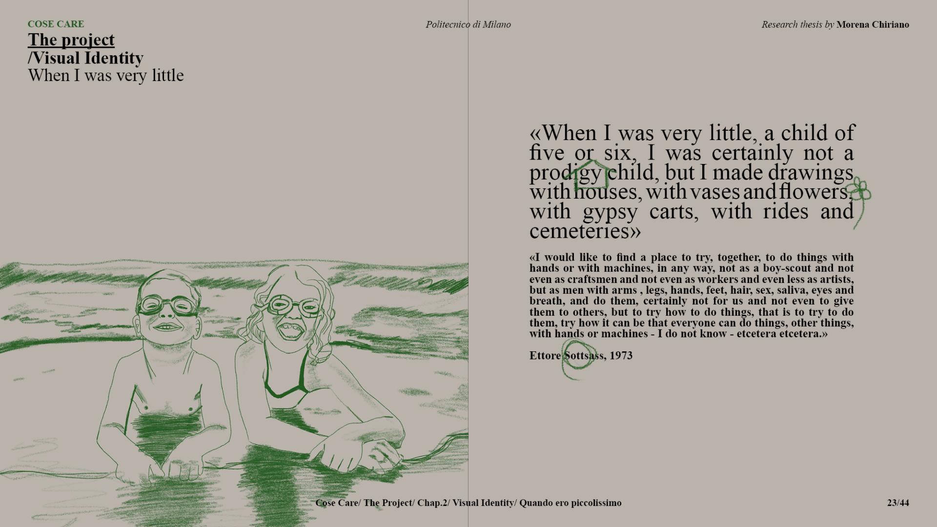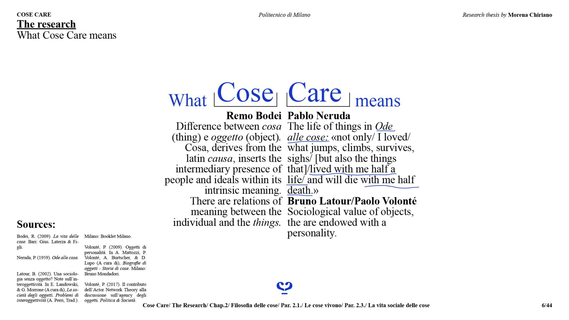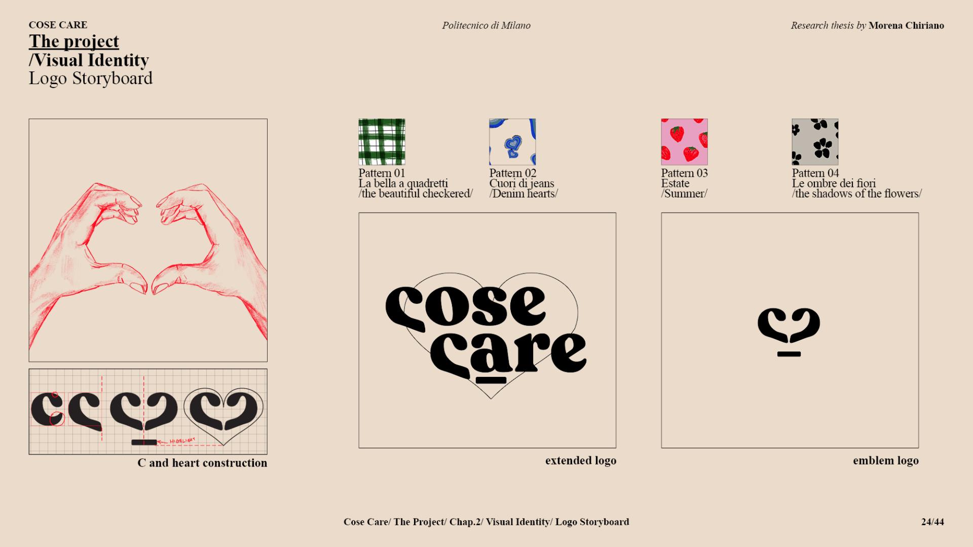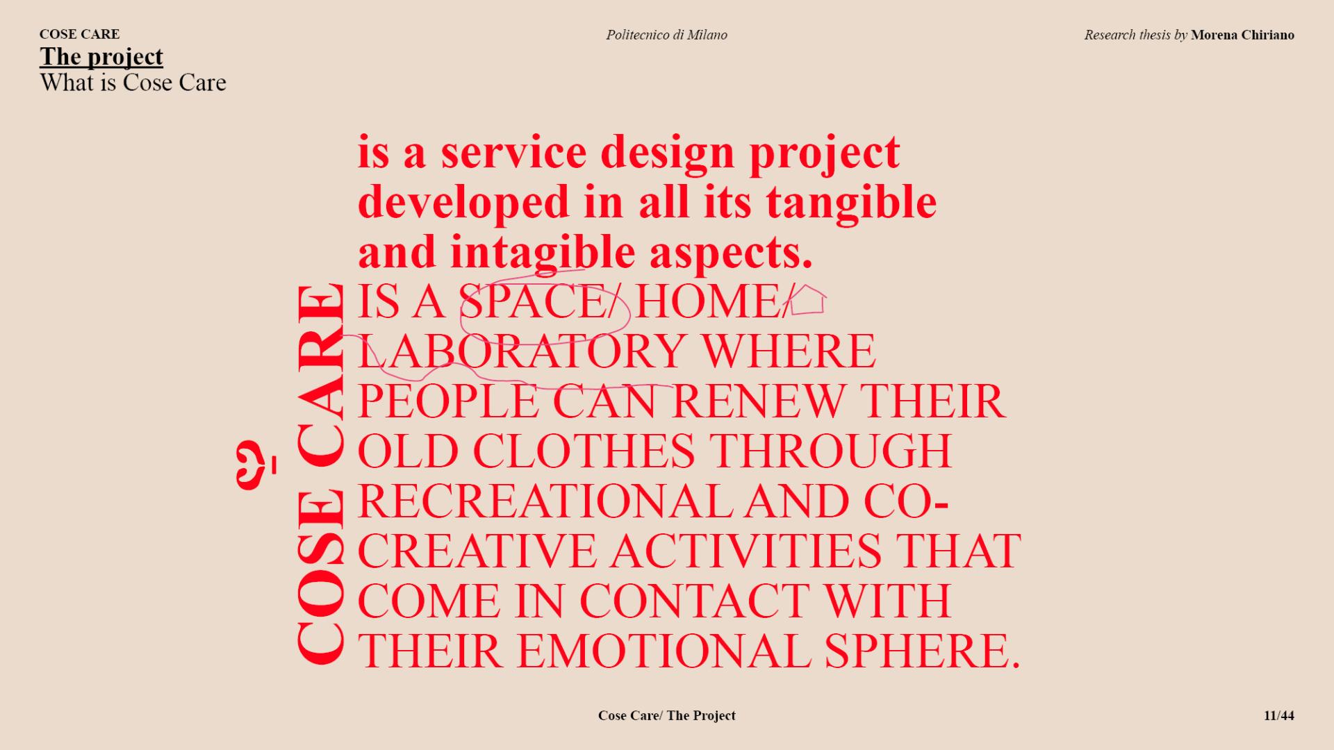 Cose Care is a service design project developed in all its tangible and intagible aspects. It is a home, a space, a laboratory in which people can renew their old clothes through recreational and co-creative activities that come in contact with their emotional sphere. According to the philosopher Remo Bodei we are able to construct relations of meaning with our things (cose) and through the art of repair we are able to enter in contact with them transforming them in beloved things (care).