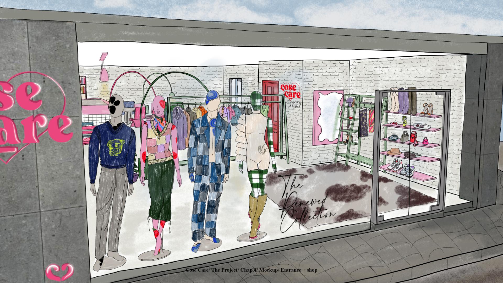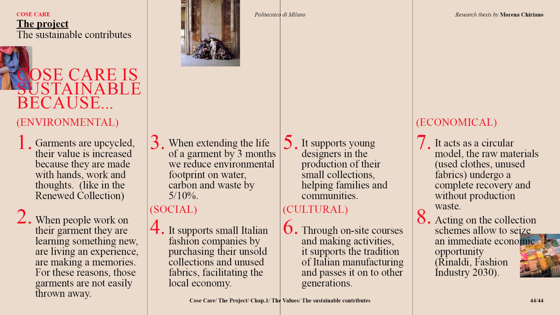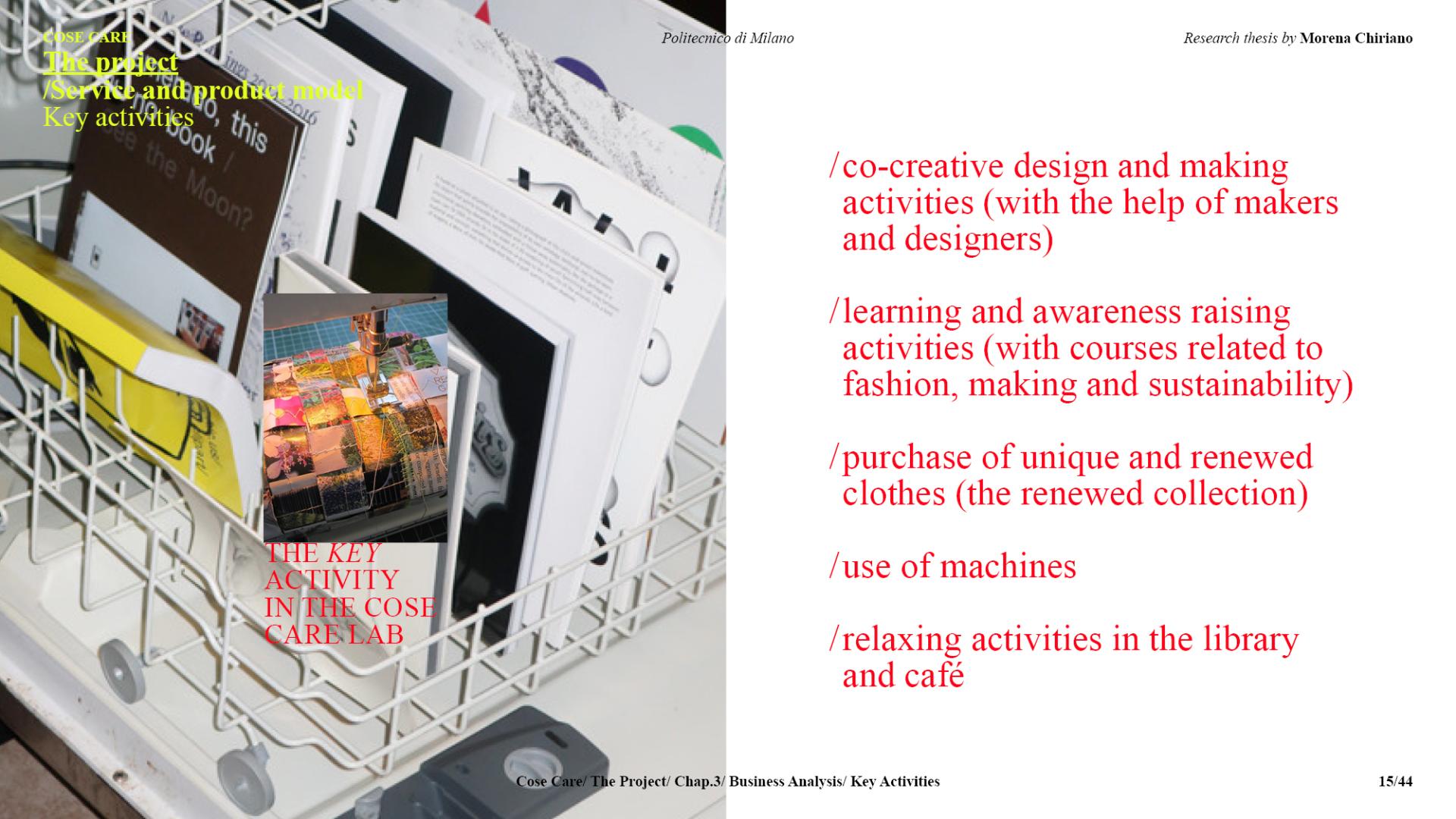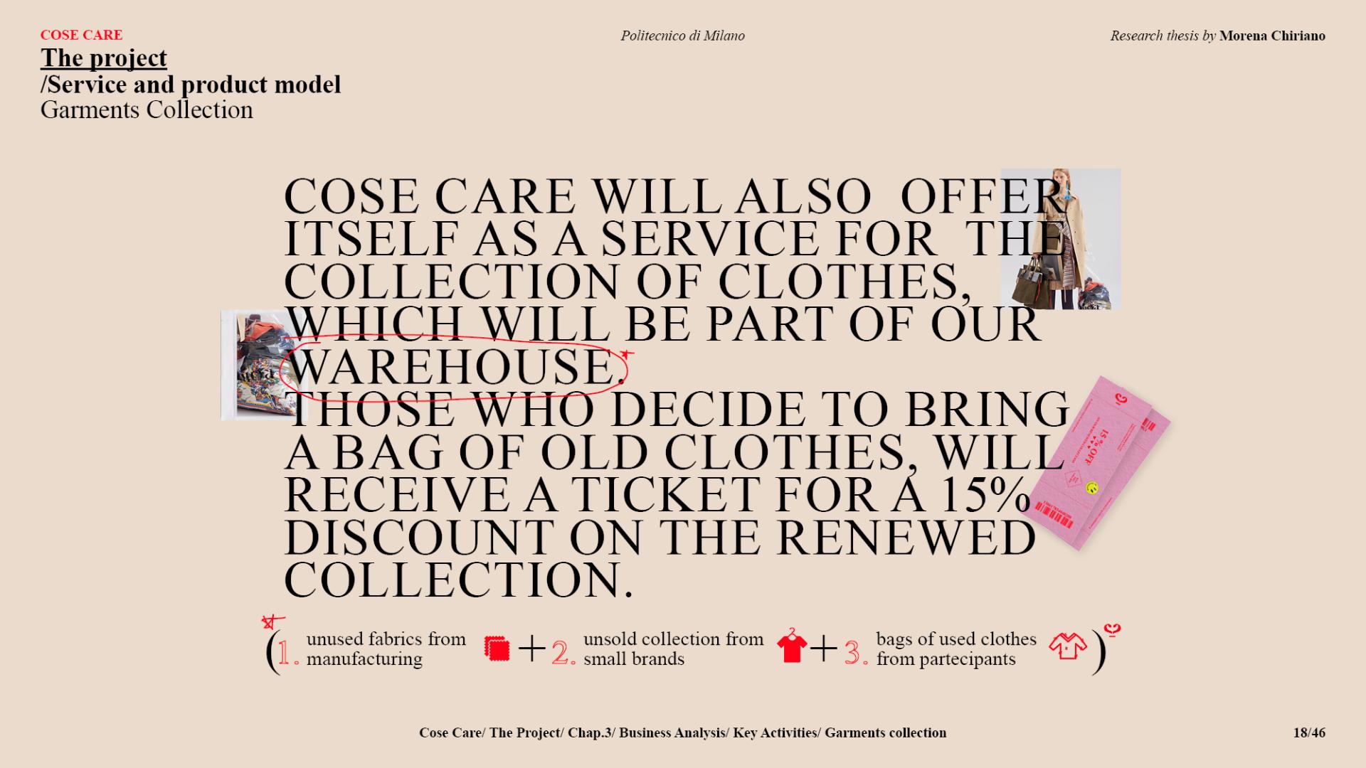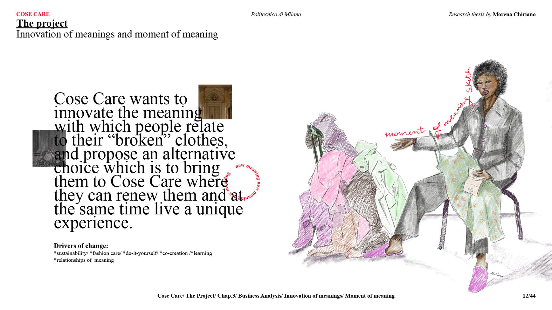 Cose Care wants to find an immediate solution to the problem of fashion waste. Considering different theories about things, and the reasons why people get rid of their things, it was demonstrated that when people construct a relation of meaning with their objects they will not throw them away easily. The idea behind Cose Care is to construct a functional and co-creative enterprise that works in different aspects of sustainability, taking as a reference, but innovating it, the Fab Lab system. Cose Care wants to innovate the meaning (using the theories of business innovation by Roberto Verganti) with which people relate to their broken clothes proposing an alternative choice that is to bring them in Cose Care where they can renew them and at the same time live a unique experience. Cose Care will be constructed as a large space in which it will be possible to finds different areas: a space with tables to work, a machines area (that includes all the different types of sewing and knitting machines), a warehouse, a café area, a library and a boutique. In this large space qualified personnel will be available in the following roles: designers, makers, trend researchers, professors and social media managers. The designers will have the role to guide the participants in the activity of renewal of the garment, by suggesting one of the six different type of renewals: RE-PAIR (the basic option to fix the garment), RE-DECORATE (embellishing the garment adding embroidery, buttons and so on), RE-PRINT (add an artwork), RE-FASHIONED (transforming the garment in a new fashionable one), RE-MIX (combining different garments) and RE-BUILD (that includes everything that can comes in mind). Those operation will be taken in a co-creative way between the partecipant and designers and makers, with the aim of guiding the person in a new relation with the garment, that include a new experience, a new learning, and increaed awareness.