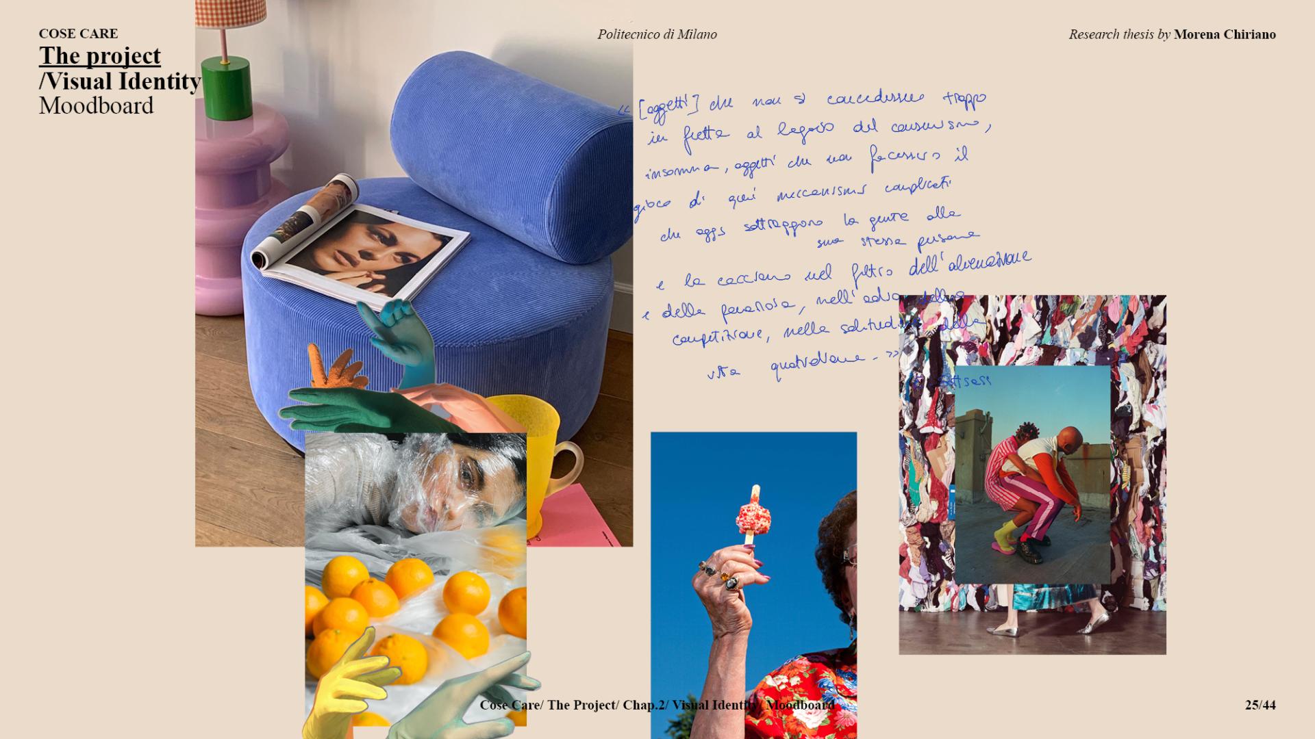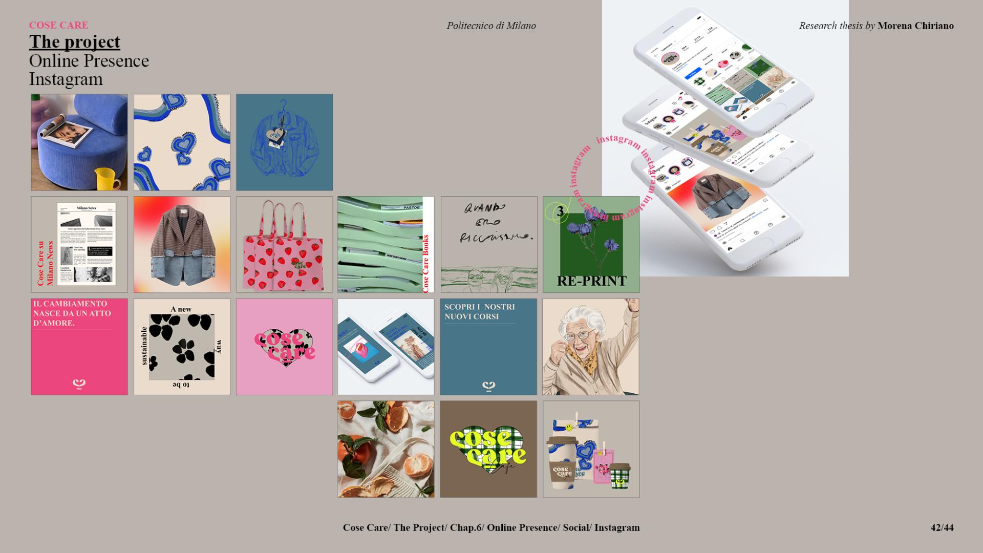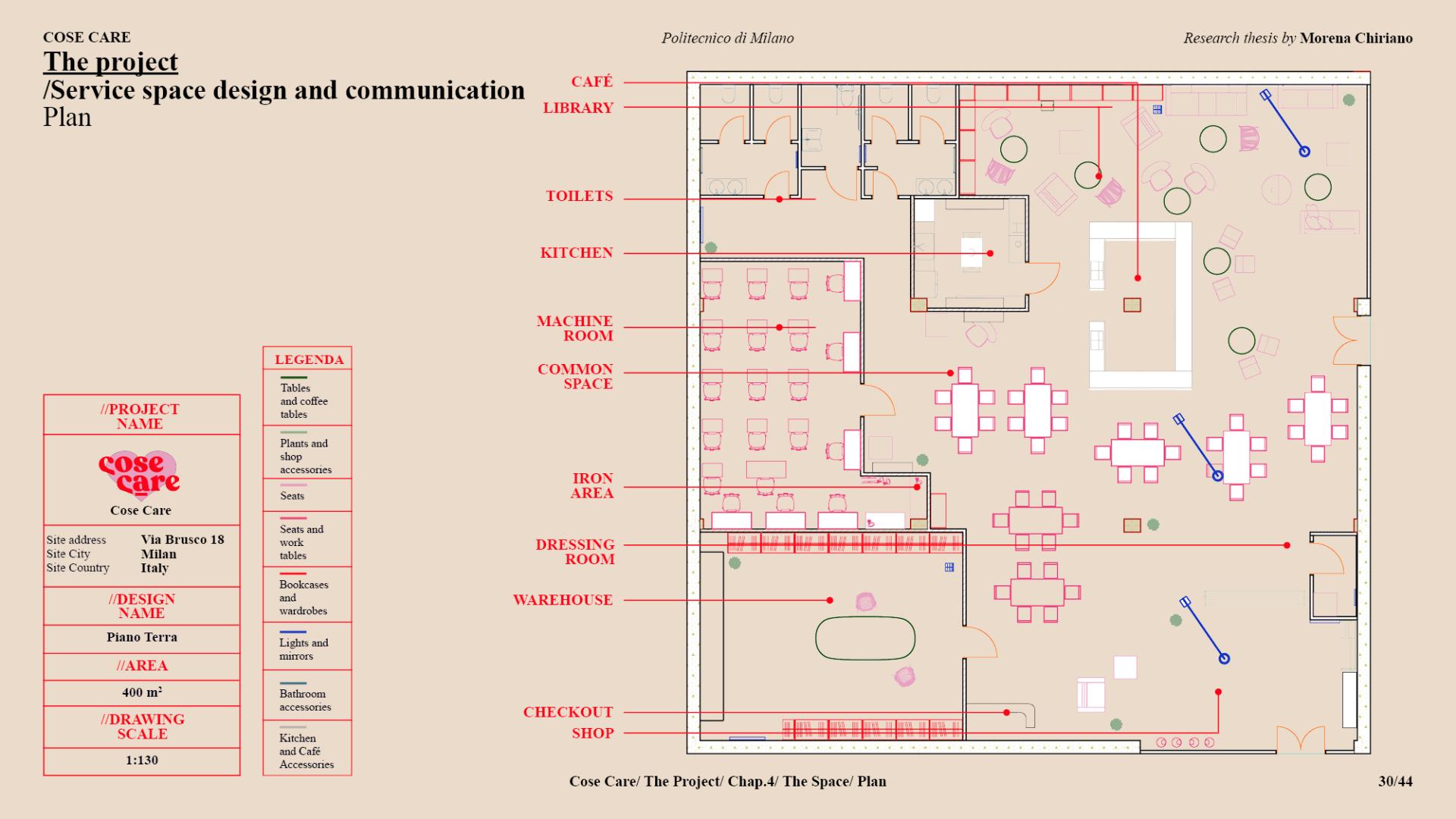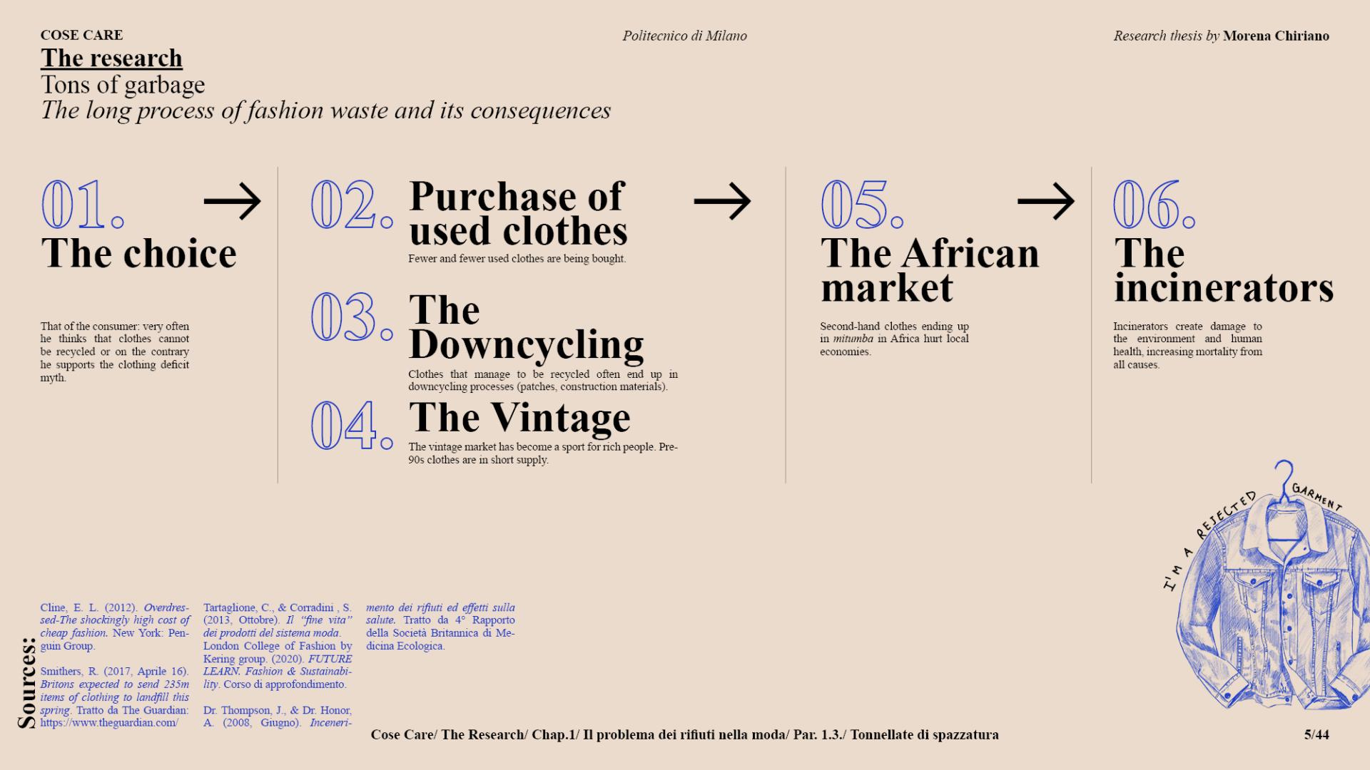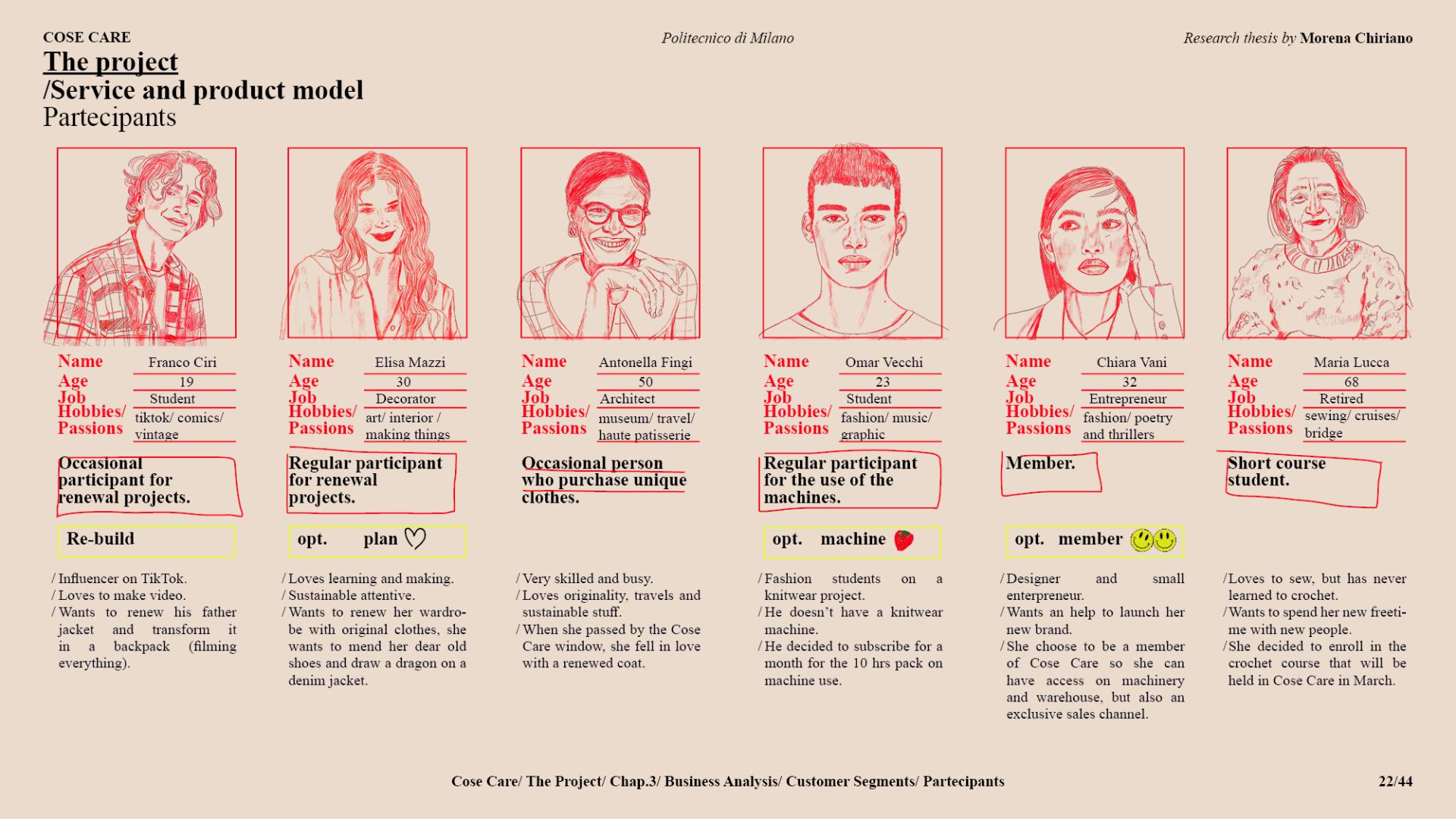 Cose Care wants to find an immediate solution to the problem of fashion waste. Considering different theories about things, and the reasons why people get rid of their things, it was demonstrated that when people construct a relation of meaning with their objects they will not throw them away easily. The idea behind Cose Care is to construct a functional and co-creative enterprise that works in different aspects of sustainability, taking as a reference, but innovating it, the Fab Lab system. Cose Care wants to innovate the meaning (using the theories of business innovation by Roberto Verganti) with which people relate to their broken clothes proposing an alternative choice that is to bring them in Cose Care where they can renew them and at the same time live a unique experience. Cose Care will be constructed as a large space in which it will be possible to finds different areas: a space with tables to work, a machines area (that includes all the different types of sewing and knitting machines), a warehouse, a café area, a library and a boutique. In this large space qualified personnel will be available in the following roles: designers, makers, trend researchers, professors and social media managers. The designers will have the role to guide the participants in the activity of renewal of the garment, by suggesting one of the six different type of renewals: RE-PAIR (the basic option to fix the garment), RE-DECORATE (embellishing the garment adding embroidery, buttons and so on), RE-PRINT (add an artwork), RE-FASHIONED (transforming the garment in a new fashionable one), RE-MIX (combining different garments) and RE-BUILD (that includes everything that can comes in mind). Those operation will be taken in a co-creative way between the partecipant and designers and makers, with the aim of guiding the person in a new relation with the garment, that include a new experience, a new learning, and increaed awareness.