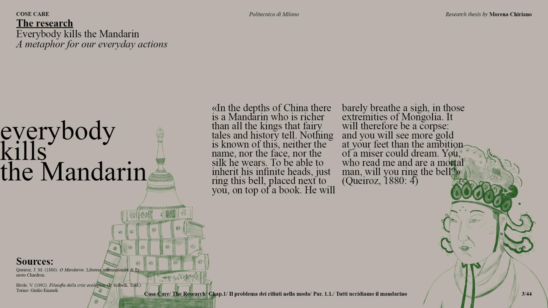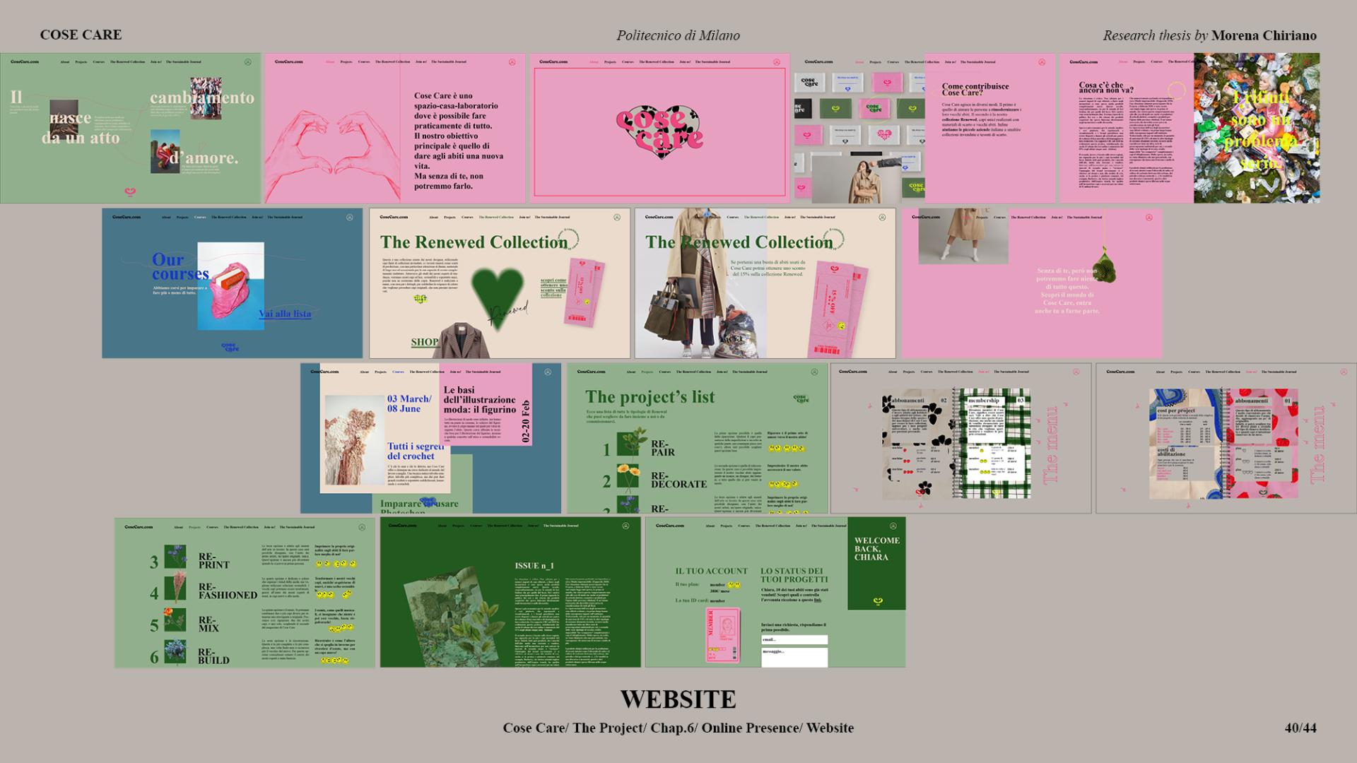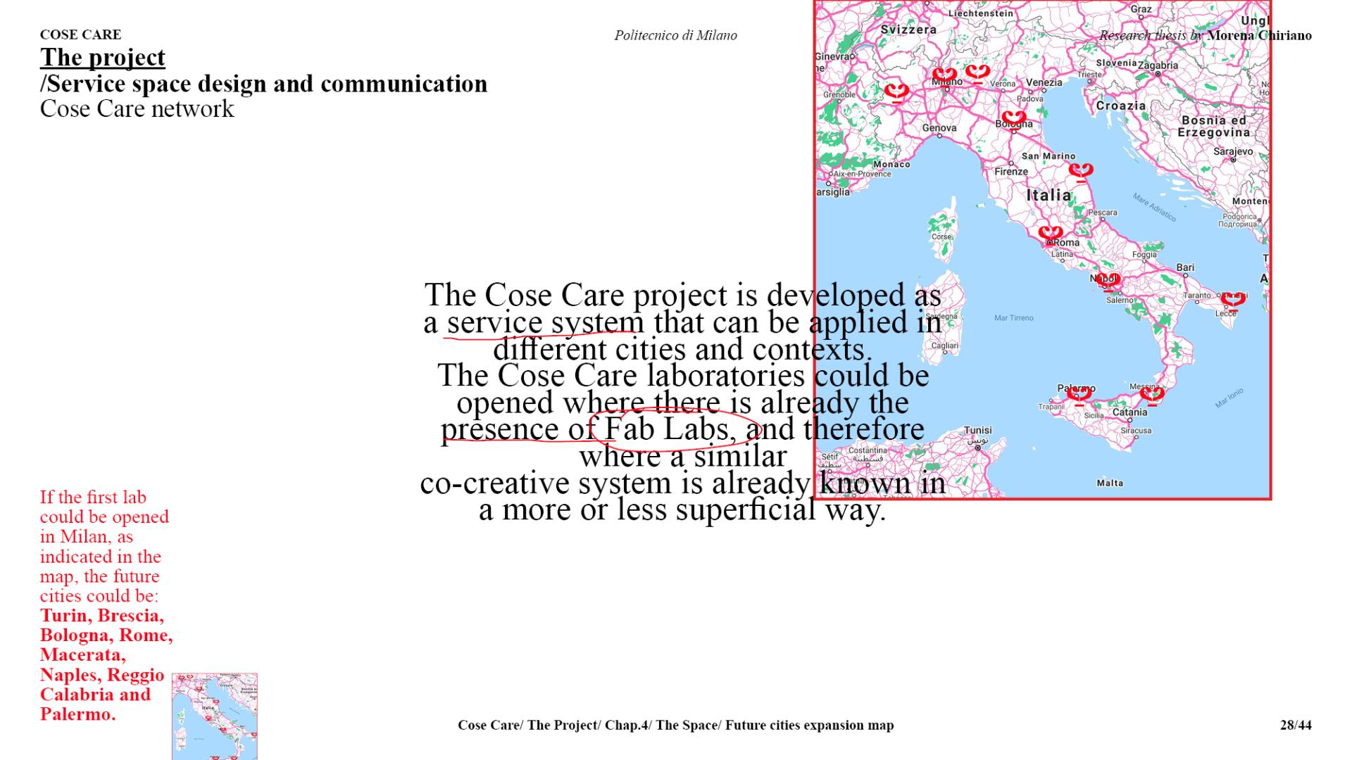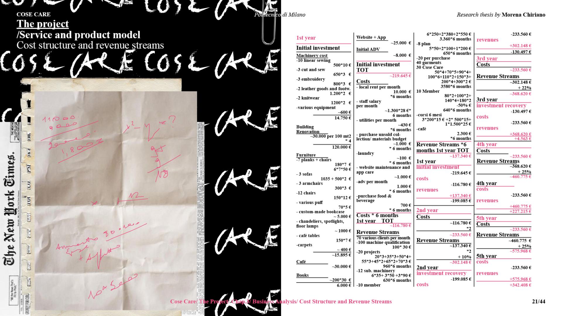 Cose Care is a completely innovative idea because it manages to create a profit (as represented in the business plan that I conceived in the project) by demonstrating that projects that embrace sustainability at 360° can offer new jobs, help businesses in the area, help the cultural heritage of the territory, innovating particular urban areas, but also offering collection services, and much more, while continuing to be projects with a large profit margin. It is very often believed that economics and ecology are two great antagonists, but as demonstrated by the philosopher Vittorio Hösle, economics is the only way to save ecology. Only through economic resources will it be possible to set in motion projects and processes that innovate our way of life, transforming it into a sustainable way of life that is good for the planet. Cose Care takes its cue only from the world of Fab-Labs, from Ramaswamy and Guillart's theories on co-creative companies, and then innovates these systems by proposing a solution that can immediately return a margin for improvement to the problem of fashion waste ( which every year continues to burden due to fast-fashion and the speed of consumption), and which at the same time works on the future by creating awareness and knowledge on sustainability and therefore changing the approach of consumers. On the one hand, Cose Care educates the territory to a new style of consumption, on the other it helps the territory to regenerate itself according to more sustainable and more creative systems, on the other hand helping companies in difficulty in the territory and the designers and creatives of the same. The innovative character is the whole engineered system that manages to generate a series of unique experiences and therefore not only offers new types of products, but new ways of living, spending one's time, living in the community and respecting the planet.