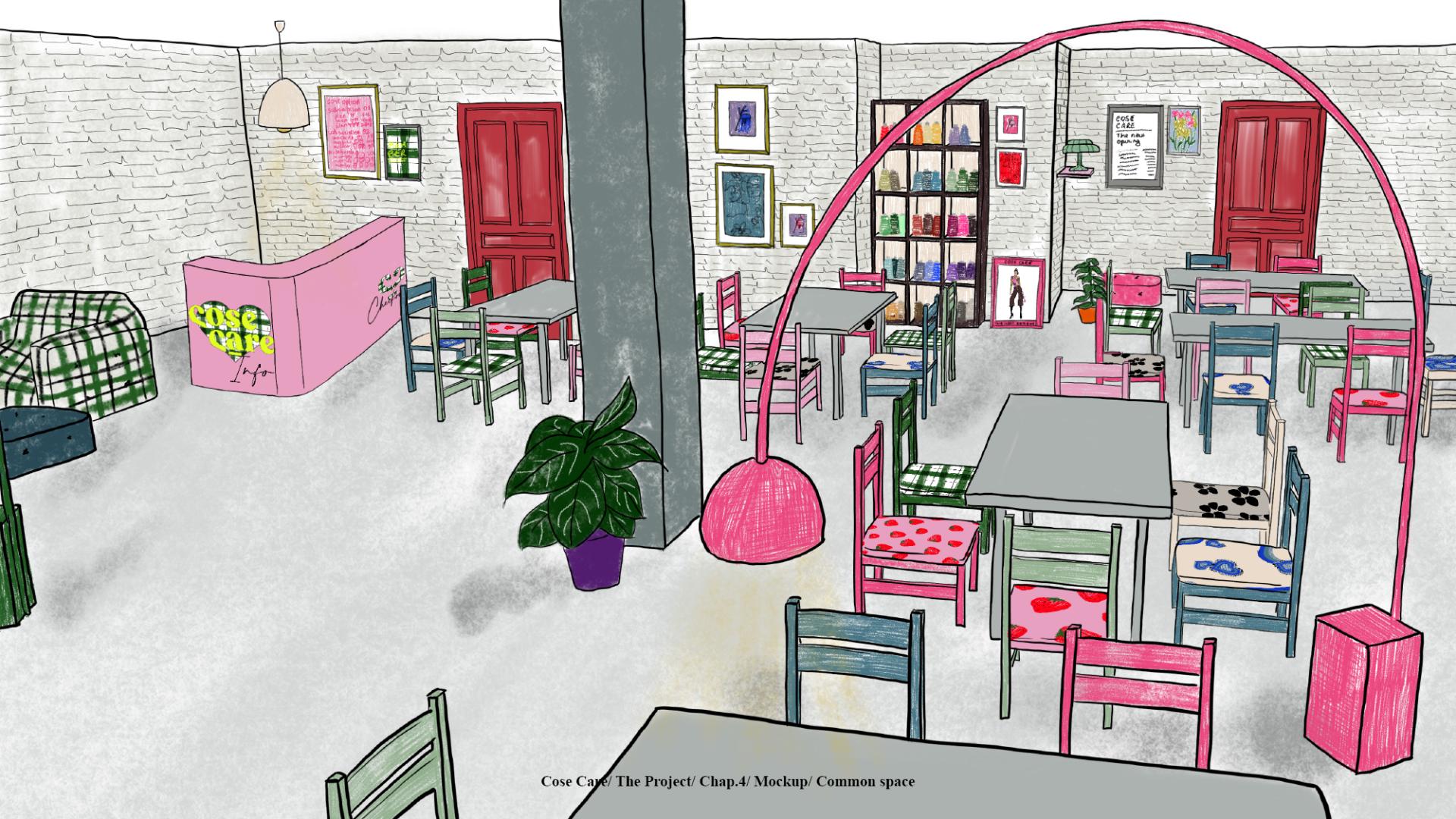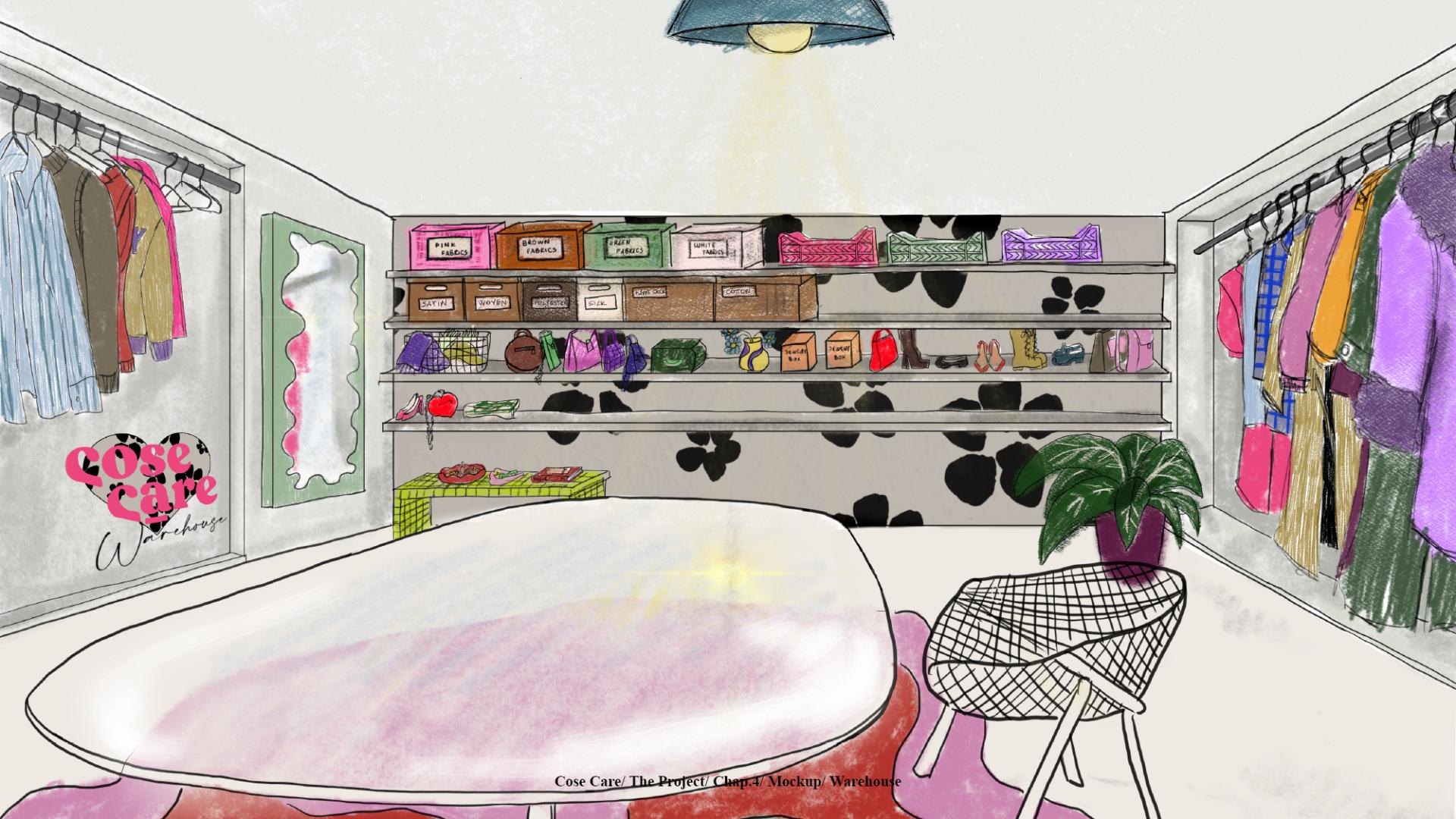 The aesthetics of Cose Care is inspired by a text by Ettore Sottsass in "Molto difficile da dire", in which he, referring to his childhood, recalls the pleasure of "doing things" not for others, not to sell them to someone but simply the pleasure of doing them as human beings; and finally he affirms how pleasant it would be to have a place where you can do things with your hands or with machines and return to that creativity typical of childhood. This is why Cose Care wants to be a place that plays with bright and pastel colors, that recalls children's drawings, a place where you can find yourself at ease and where you can free yourself from the weight of "being an adult" rediscovering a carefree and creative atmosphere. The quality will be central, as well as the aesthetics entrusted to the design, which plays with curved lines, smoothed by pop tones, and by the reference to an almost imaginative, unreal world, but at the same time elegant, never banal. The experience offered by Cose Care is a 360 °, in which it is possible to do "practically everything": from taking a café in the themed cups, to reading a book on fashion and sustainability in the library space, to plunging into a warehouse created as a large walk-in closet, where you can find materials and inspiration for your own renewals or feel and live the experience of designers and makers, and learn how to do things with your hands or with machines. The boutique also wants to offer this experience, with the colorful mannequins with the patterns created for Cose Care, and the large showcase that gives space to completely original clothes, as unique of their kind and above all completely sustainable.