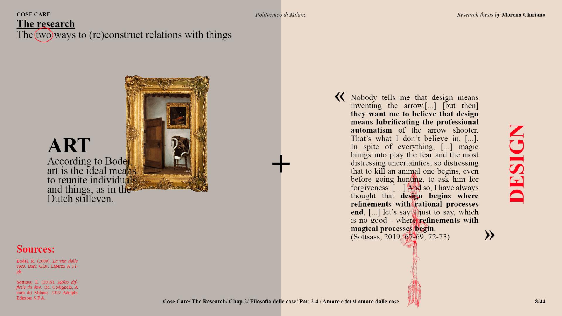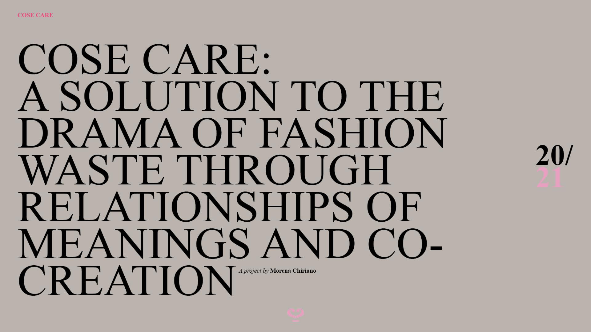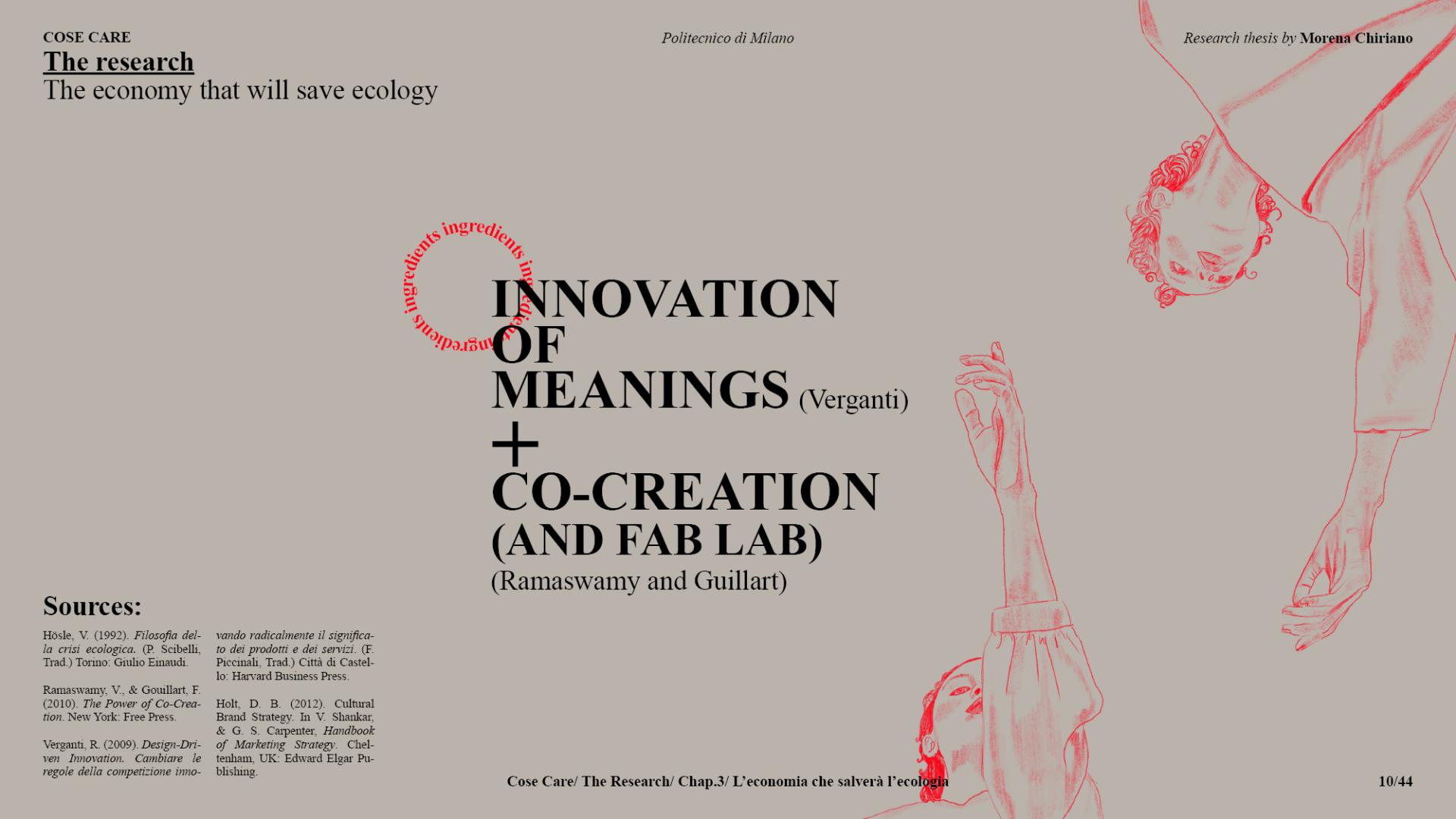 Cose Care is a completely innovative idea because it manages to create a profit (as represented in the business plan that I conceived in the project) by demonstrating that projects that embrace sustainability at 360° can offer new jobs, help businesses in the area, help the cultural heritage of the territory, innovating particular urban areas, but also offering collection services, and much more, while continuing to be projects with a large profit margin. It is very often believed that economics and ecology are two great antagonists, but as demonstrated by the philosopher Vittorio Hösle, economics is the only way to save ecology. Only through economic resources will it be possible to set in motion projects and processes that innovate our way of life, transforming it into a sustainable way of life that is good for the planet. Cose Care takes its cue only from the world of Fab-Labs, from Ramaswamy and Guillart's theories on co-creative companies, and then innovates these systems by proposing a solution that can immediately return a margin for improvement to the problem of fashion waste ( which every year continues to burden due to fast-fashion and the speed of consumption), and which at the same time works on the future by creating awareness and knowledge on sustainability and therefore changing the approach of consumers. On the one hand, Cose Care educates the territory to a new style of consumption, on the other it helps the territory to regenerate itself according to more sustainable and more creative systems, on the other hand helping companies in difficulty in the territory and the designers and creatives of the same. The innovative character is the whole engineered system that manages to generate a series of unique experiences and therefore not only offers new types of products, but new ways of living, spending one's time, living in the community and respecting the planet.