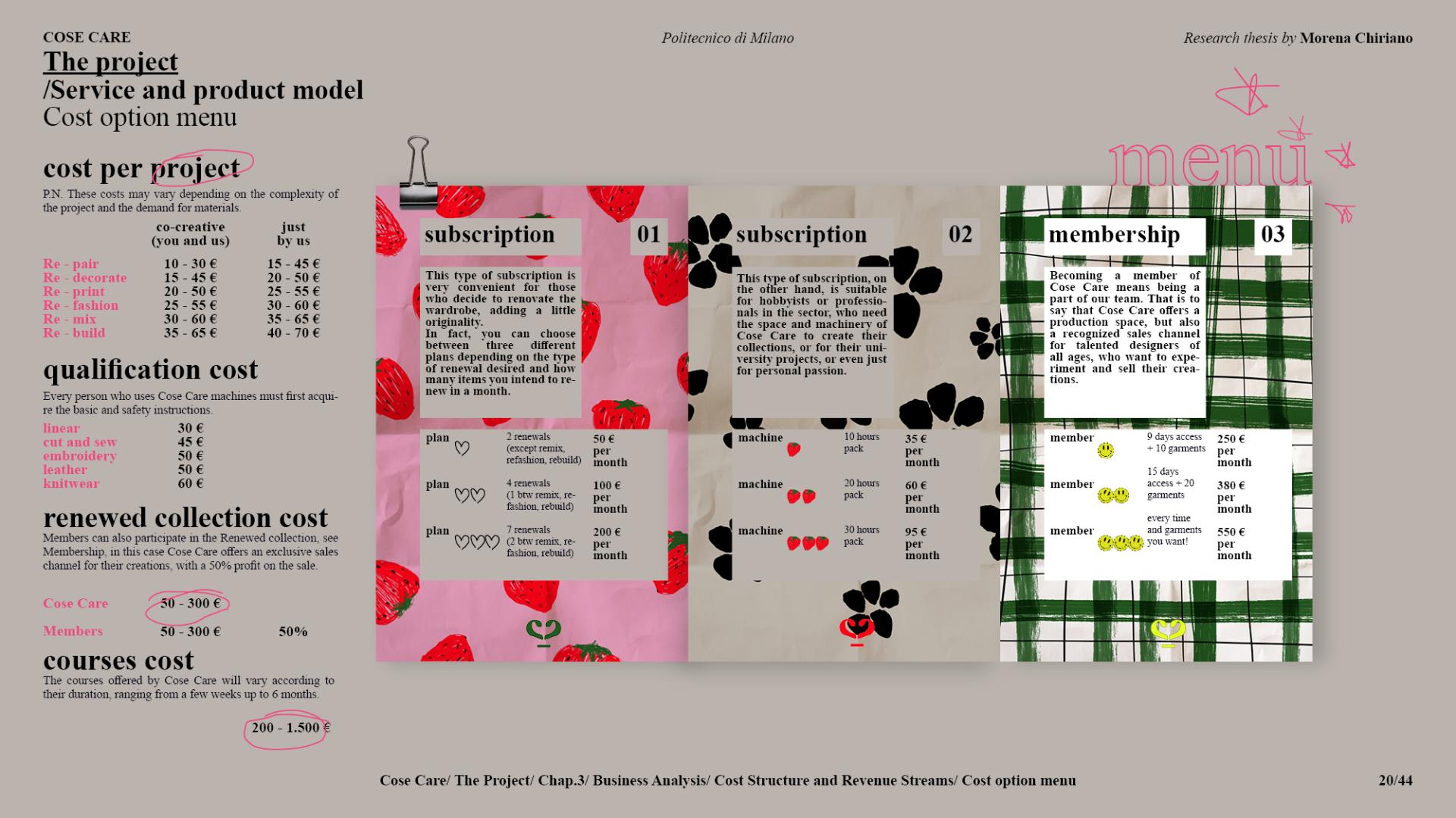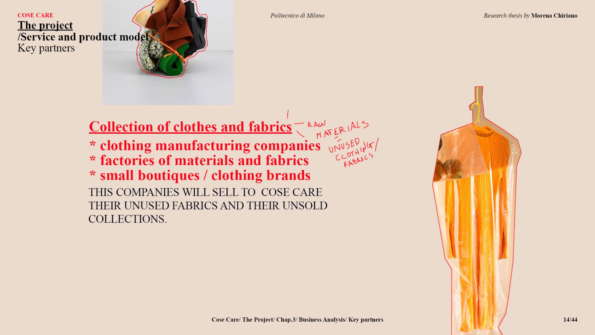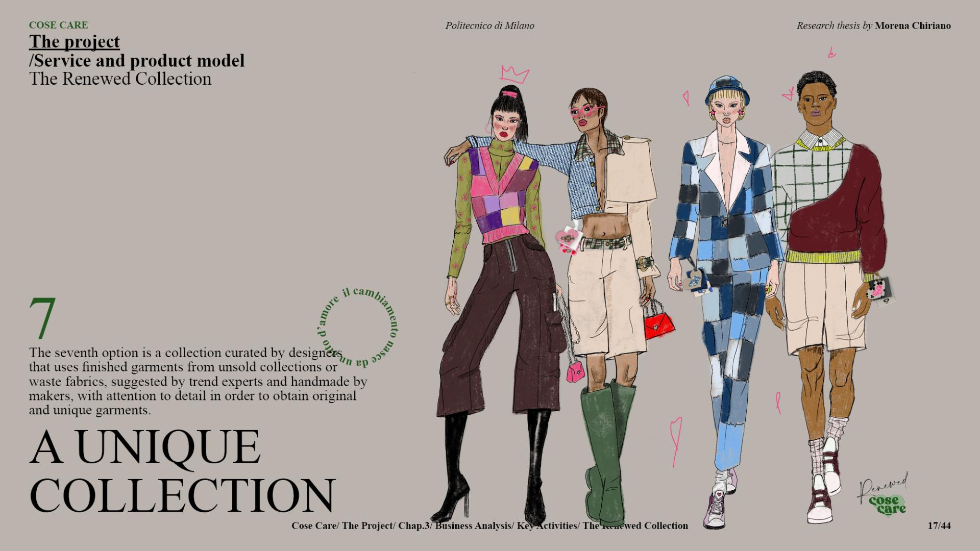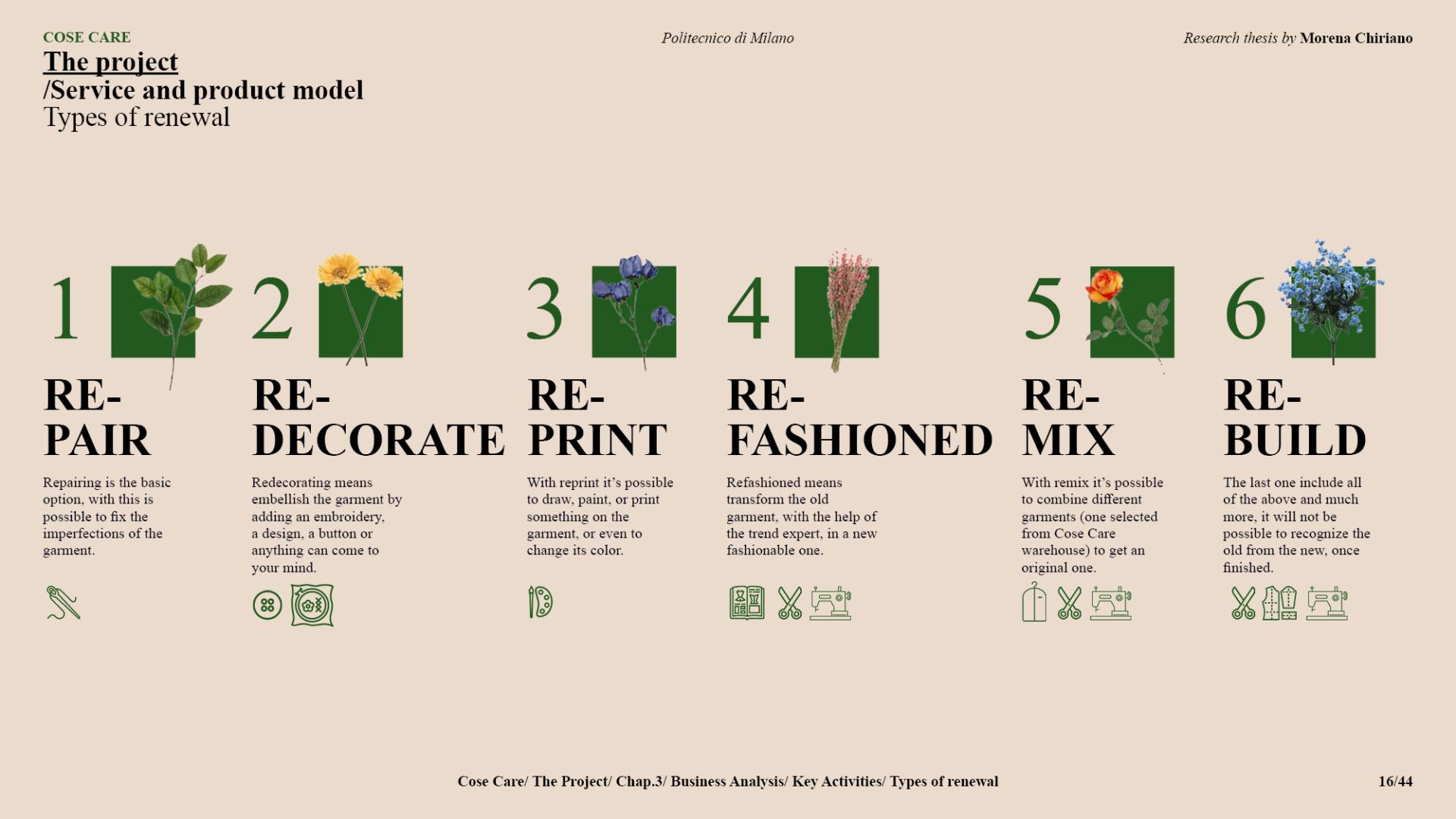 Cose Care wants to find an immediate solution to the problem of fashion waste. Considering different theories about things, and the reasons why people get rid of their things, it was demonstrated that when people construct a relation of meaning with their objects they will not throw them away easily. The idea behind Cose Care is to construct a functional and co-creative enterprise that works in different aspects of sustainability, taking as a reference, but innovating it, the Fab Lab system. Cose Care wants to innovate the meaning (using the theories of business innovation by Roberto Verganti) with which people relate to their broken clothes proposing an alternative choice that is to bring them in Cose Care where they can renew them and at the same time live a unique experience. Cose Care will be constructed as a large space in which it will be possible to finds different areas: a space with tables to work, a machines area (that includes all the different types of sewing and knitting machines), a warehouse, a café area, a library and a boutique. In this large space qualified personnel will be available in the following roles: designers, makers, trend researchers, professors and social media managers. The designers will have the role to guide the participants in the activity of renewal of the garment, by suggesting one of the six different type of renewals: RE-PAIR (the basic option to fix the garment), RE-DECORATE (embellishing the garment adding embroidery, buttons and so on), RE-PRINT (add an artwork), RE-FASHIONED (transforming the garment in a new fashionable one), RE-MIX (combining different garments) and RE-BUILD (that includes everything that can comes in mind). Those operation will be taken in a co-creative way between the partecipant and designers and makers, with the aim of guiding the person in a new relation with the garment, that include a new experience, a new learning, and increased awareness.