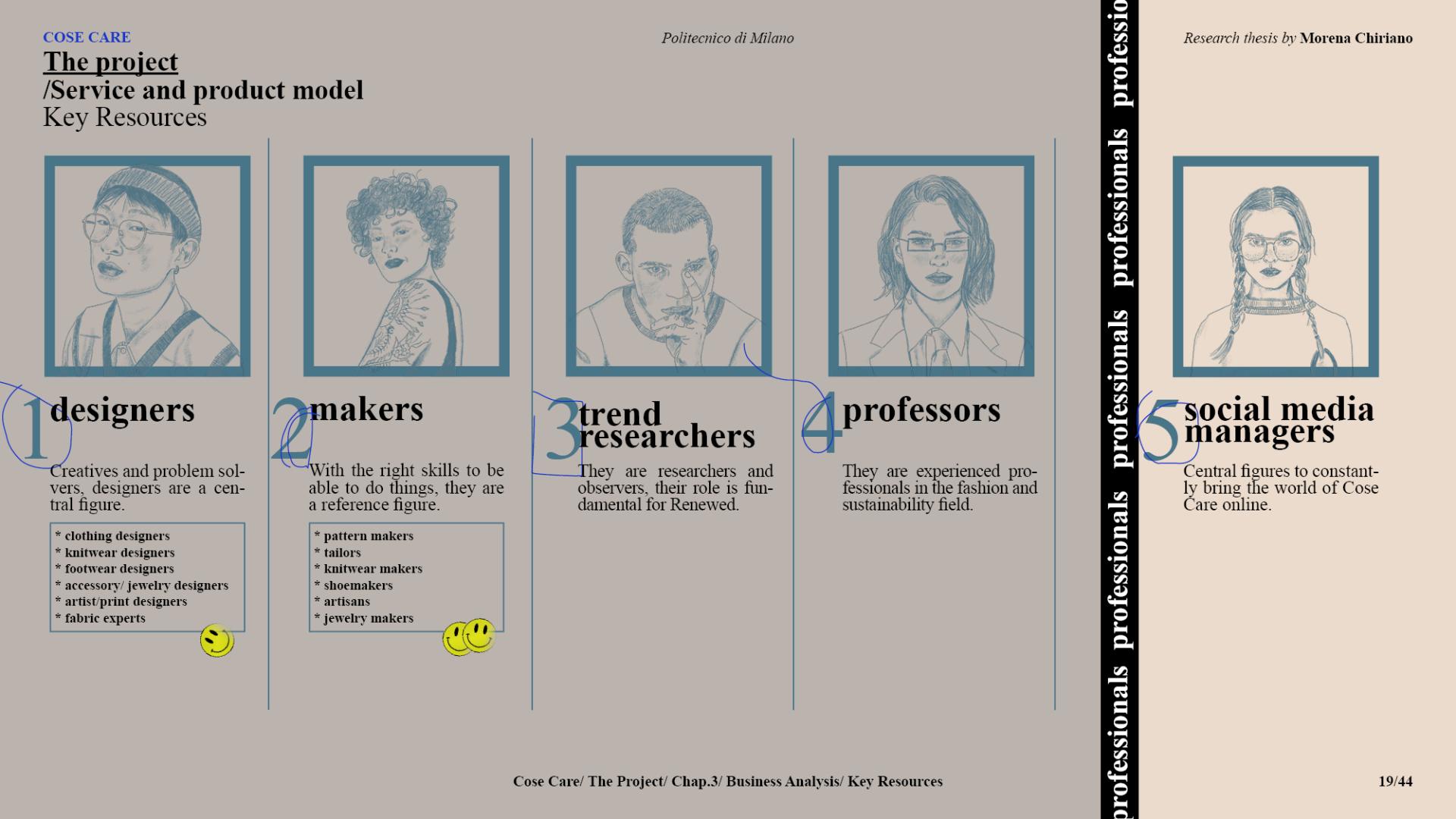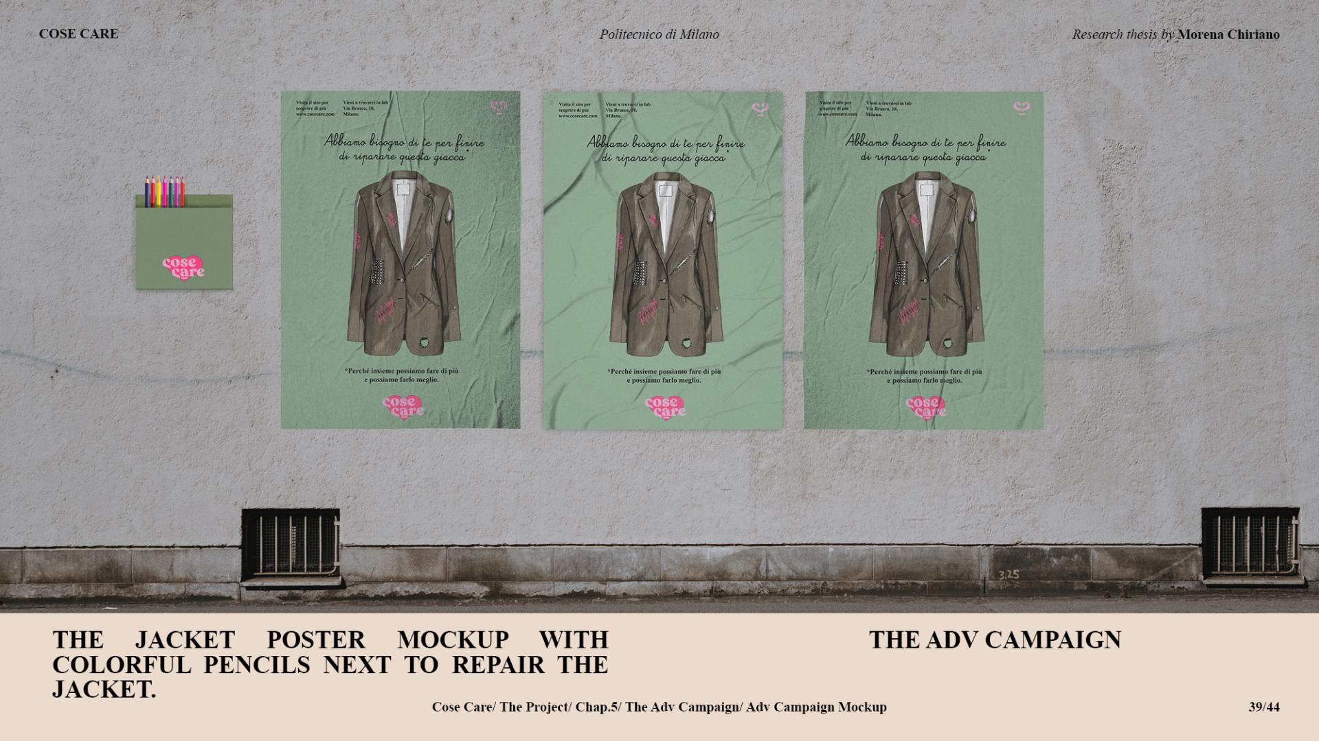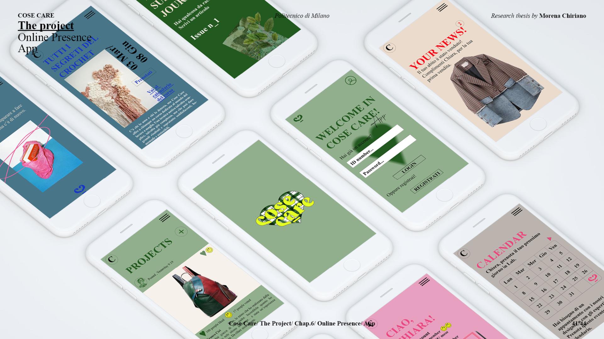 Cose Care wants to find an immediate solution to the problem of fashion waste. Considering different theories about things, and the reasons why people get rid of their things, it was demonstrated that when people construct a relation of meaning with their objects they will not throw them away easily. The idea behind Cose Care is to construct a functional and co-creative enterprise that works in different aspects of sustainability, taking as a reference, but innovating it, the Fab Lab system. Cose Care wants to innovate the meaning (using the theories of business innovation by Roberto Verganti) with which people relate to their broken clothes proposing an alternative choice that is to bring them in Cose Care where they can renew them and at the same time live a unique experience. Cose Care will be constructed as a large space in which it will be possible to finds different areas: a space with tables to work, a machines area (that includes all the different types of sewing and knitting machines), a warehouse, a café area, a library and a boutique. In this large space qualified personnel will be available in the following roles: designers, makers, trend researchers, professors and social media managers. The designers will have the role to guide the participants in the activity of renewal of the garment, by suggesting one of the six different type of renewals: RE-PAIR (the basic option to fix the garment), RE-DECORATE (embellishing the garment adding embroidery, buttons and so on), RE-PRINT (add an artwork), RE-FASHIONED (transforming the garment in a new fashionable one), RE-MIX (combining different garments) and RE-BUILD (that includes everything that can comes in mind). Those operation will be taken in a co-creative way between the partecipant and designers and makers, with the aim of guiding the person in a new relation with the garment, that include a new experience, a new learning, and increased awareness.