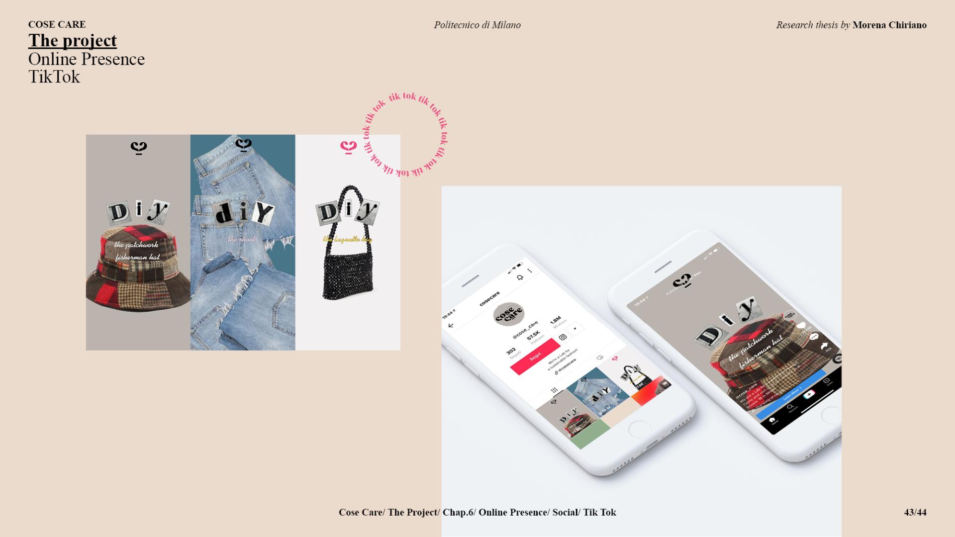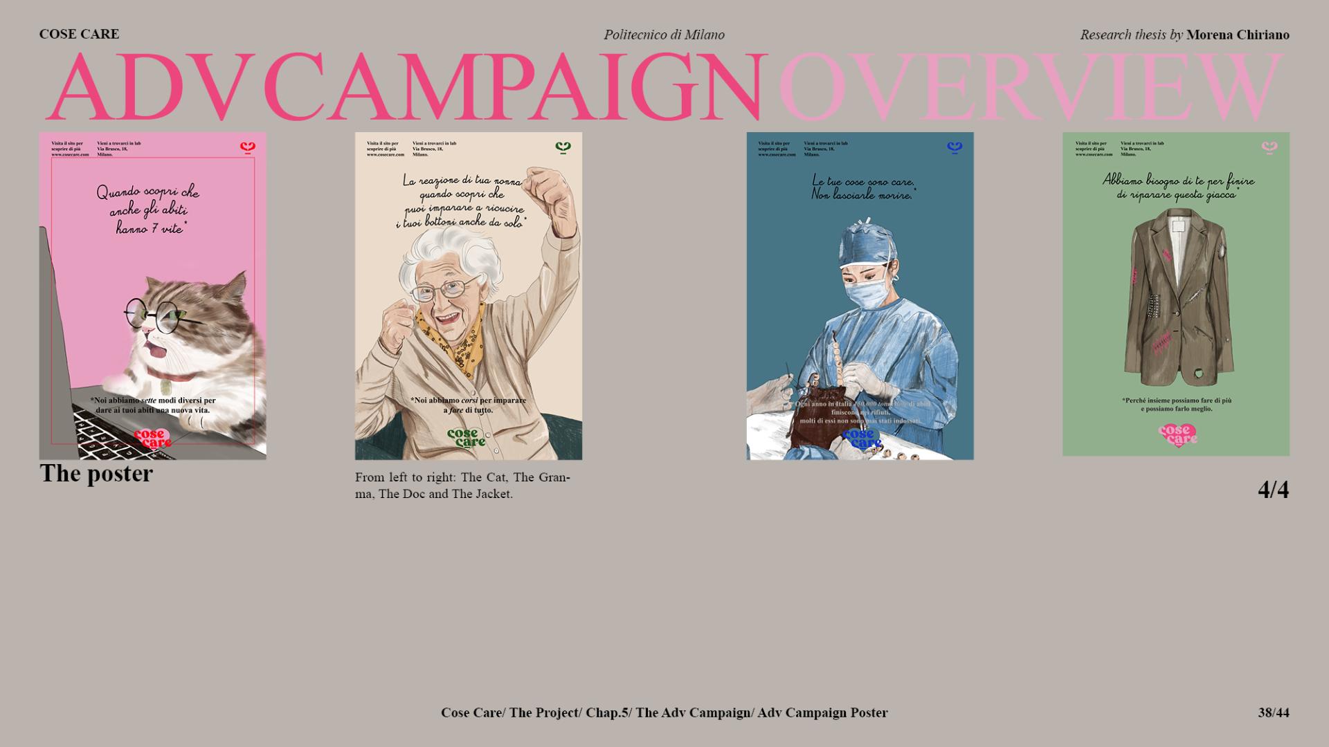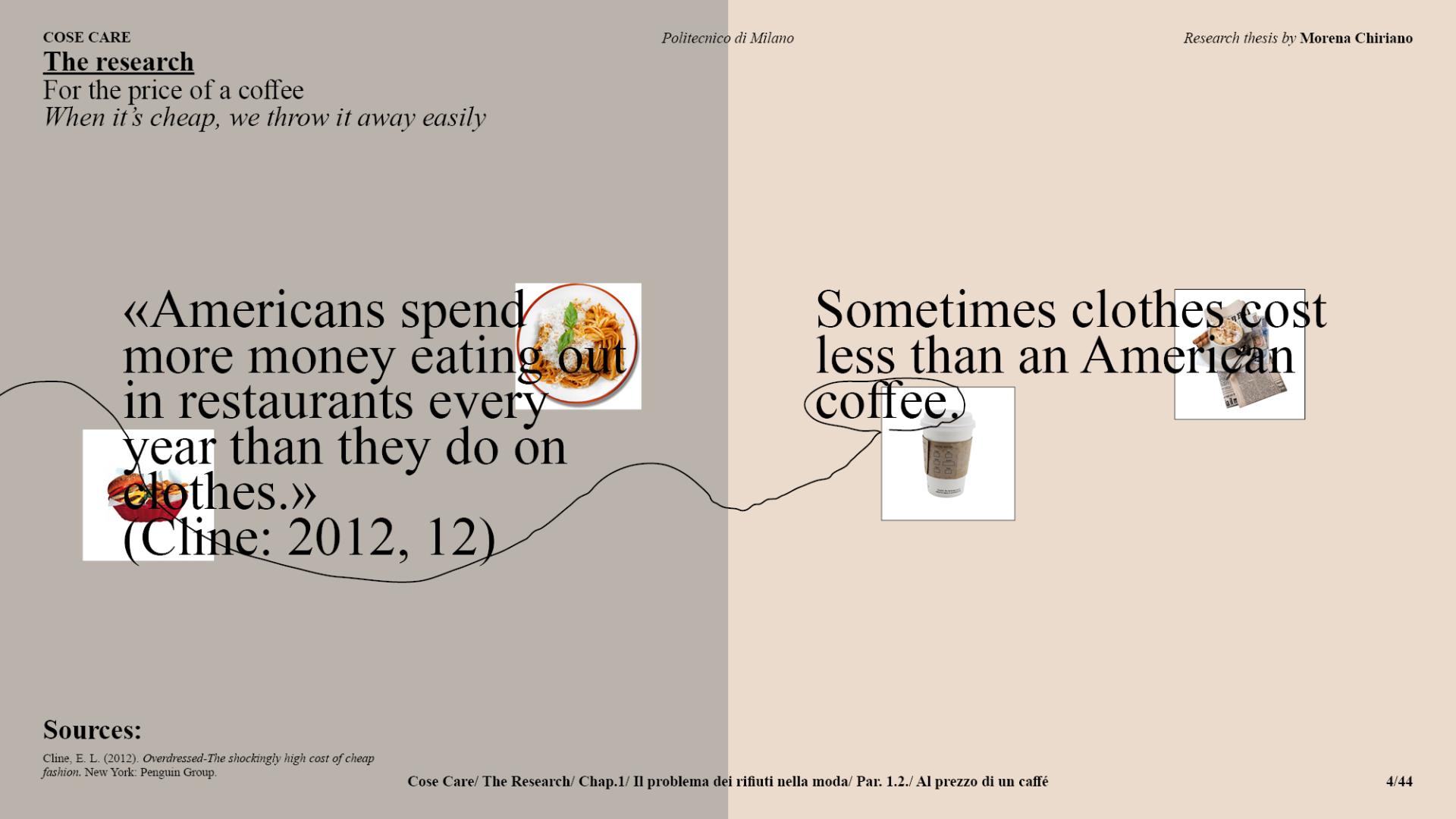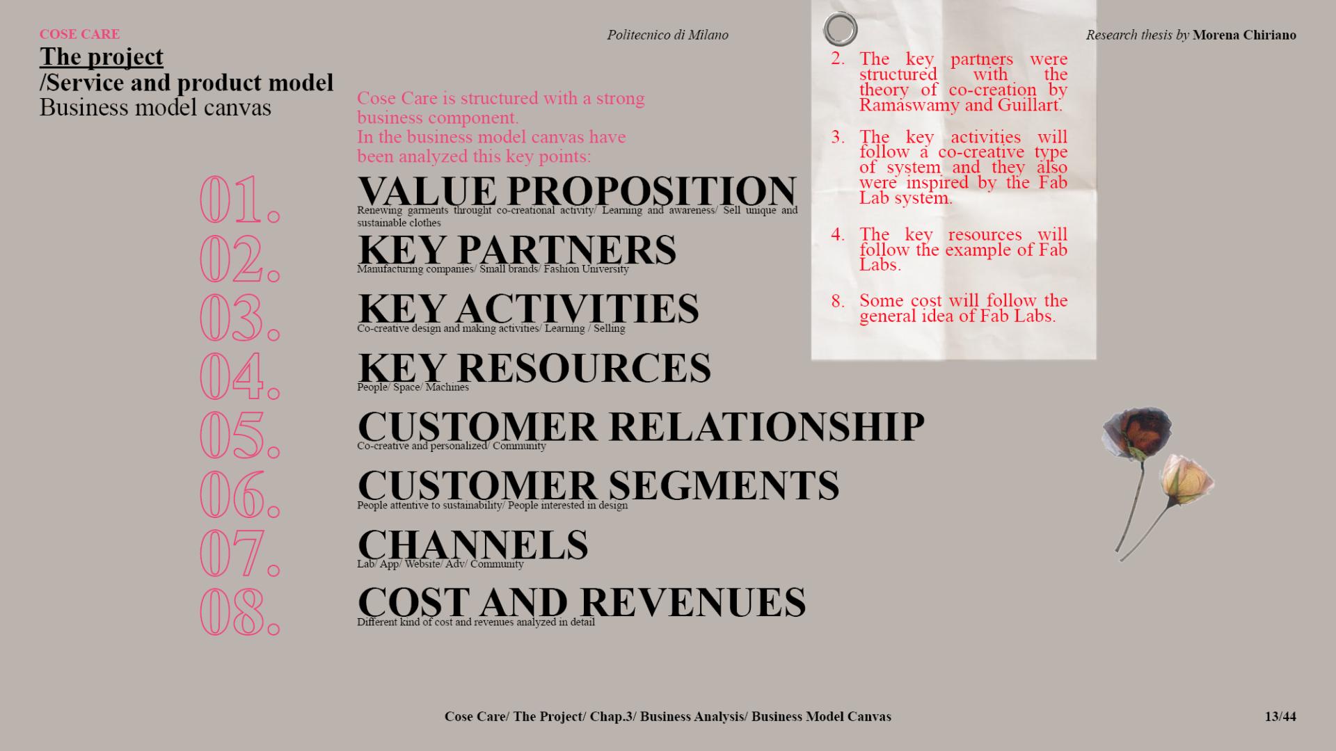Cose Care wants to find an immediate solution to the problem of fashion waste. Considering different theories about things, and the reasons why people get rid of their things, it was demonstrated that when people construct a relation of meaning with their objects they will not throw them away easily. The idea behind Cose Care is to construct a functional and co-creative enterprise that works in different aspects of sustainability, taking as a reference, but innovating it, the Fab Lab system. Cose Care wants to innovate the meaning (using the theories of business innovation by Roberto Verganti) with which people relate to their broken clothes proposing an alternative choice that is to bring them in Cose Care where they can renew them and at the same time live a unique experience. Cose Care will be constructed as a large space in which it will be possible to finds different areas: a space with tables to work, a machines area (that includes all the different types of sewing and knitting machines), a warehouse, a café area, a library and a boutique. In this large space qualified personnel will be available in the following roles: designers, makers, trend researchers, professors and social media managers. The designers will have the role to guide the participants in the activity of renewal of the garment, by suggesting one of the six different type of renewals: RE-PAIR (the basic option to fix the garment), RE-DECORATE (embellishing the garment adding embroidery, buttons and so on), RE-PRINT (add an artwork), RE-FASHIONED (transforming the garment in a new fashionable one), RE-MIX (combining different garments) and RE-BUILD (that includes everything that can comes in mind). Those operation will be taken in a co-creative way between the partecipant and designers and makers, with the aim of guiding the person in a new relation with the garment, that include a new experience, a new learning, and increased awareness.