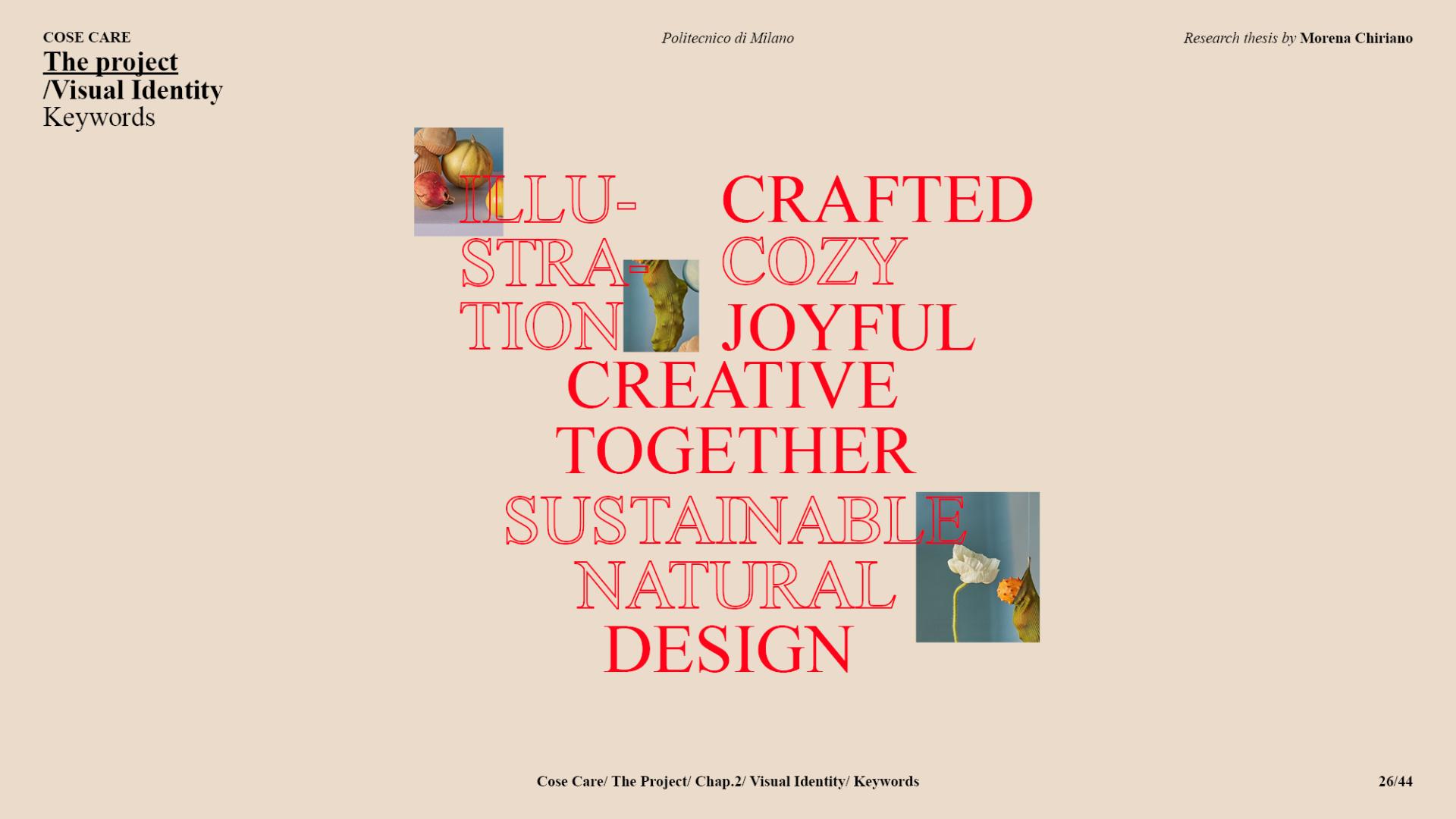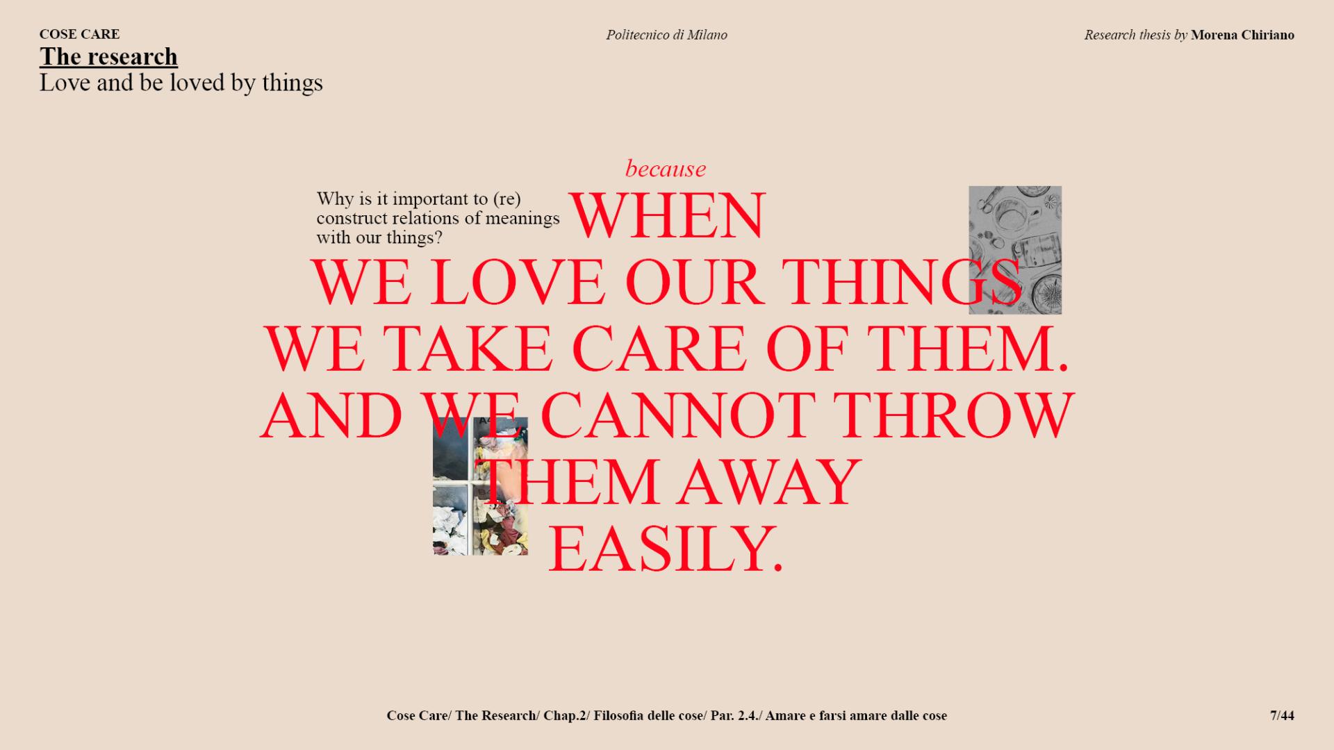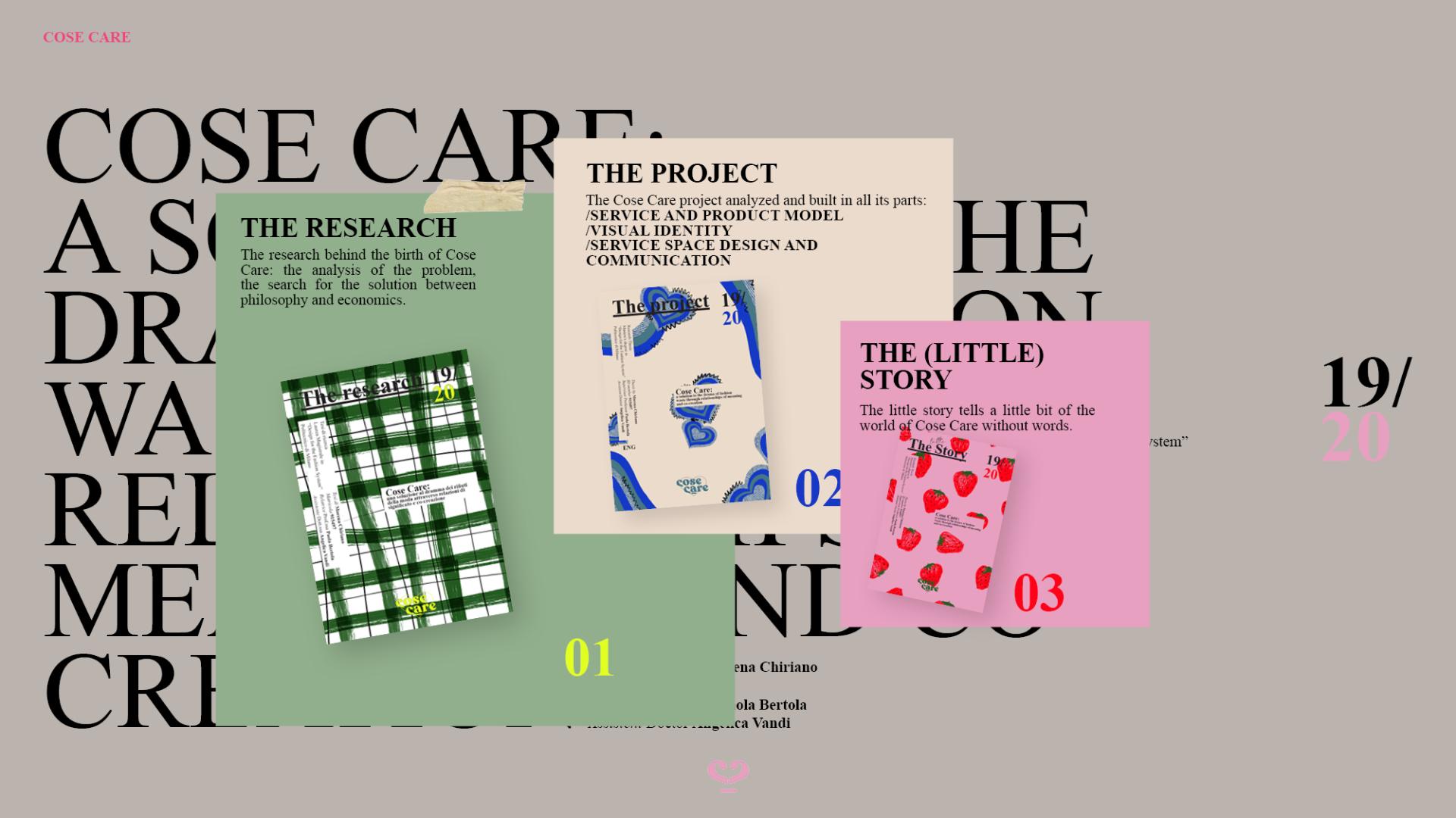 Cose Care is a service design project developed in all its tangible and intagible aspects. It is a home, a space, a laboratory in which people can renew their old clothes through recreational and co-creative activities that come in contact with their emotional sphere. According to the philosopher Remo Bodei we are able to construct relations of meaning with our things (cose) and through the art of repair we are able to enter in contact with them transforming them in beloved things (care).
