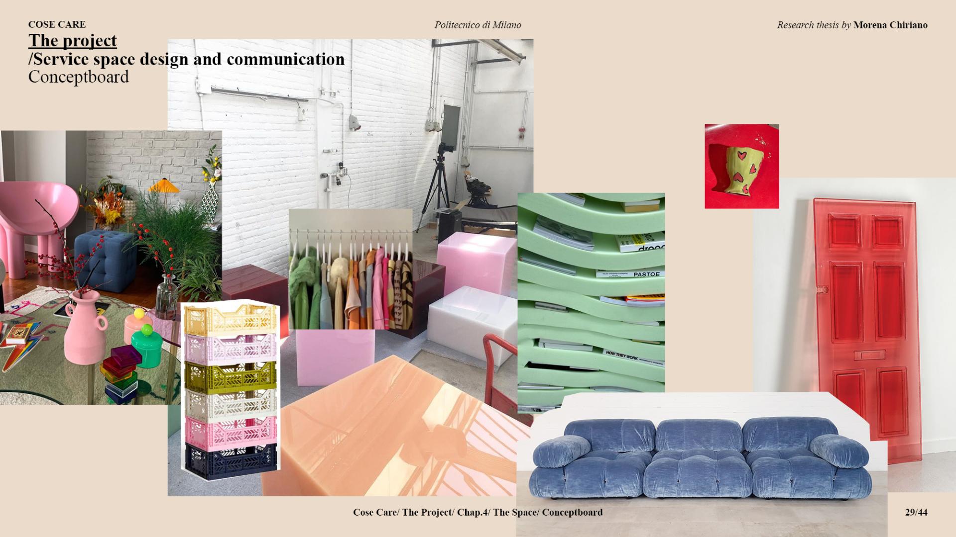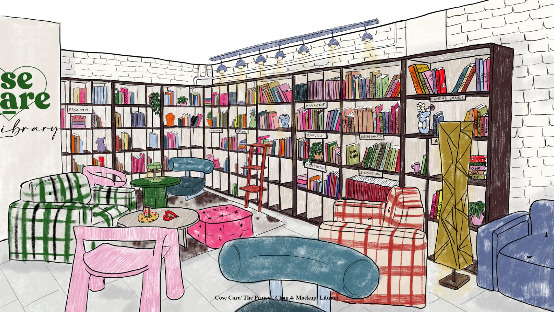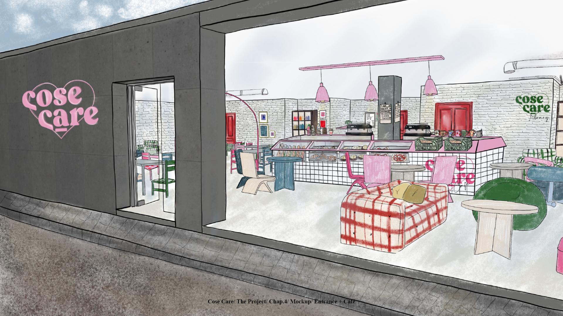 The aesthetics of Cose Care is inspired by a text by Ettore Sottsass in "Molto difficile da dire", in which he, referring to his childhood, recalls the pleasure of "doing things" not for others, not to sell them to someone but simply the pleasure of doing them as human beings; and finally he affirms how pleasant it would be to have a place where you can do things with your hands or with machines and return to that creativity typical of childhood. This is why Cose Care wants to be a place that plays with bright and pastel colors, that recalls children's drawings, a place where you can find yourself at ease and where you can free yourself from the weight of "being an adult" rediscovering a carefree and creative atmosphere. The quality will be central, as well as the aesthetics entrusted to the design, which plays with curved lines, smoothed by pop tones, and by the reference to an almost imaginative, unreal world, but at the same time elegant, never banal. The experience offered by Cose Care is a 360 °, in which it is possible to do "practically everything": from taking a café in the themed cups, to reading a book on fashion and sustainability in the library space, to plunging into a warehouse created as a large walk-in closet, where you can find materials and inspiration for your own renewals or feel and live the experience of designers and makers, and learn how to do things with your hands or with machines. The boutique also wants to offer this experience, with the colorful mannequins with the patterns created for Cose Care, and the large showcase that gives space to completely original clothes, as unique of their kind and above all completely sustainable.
