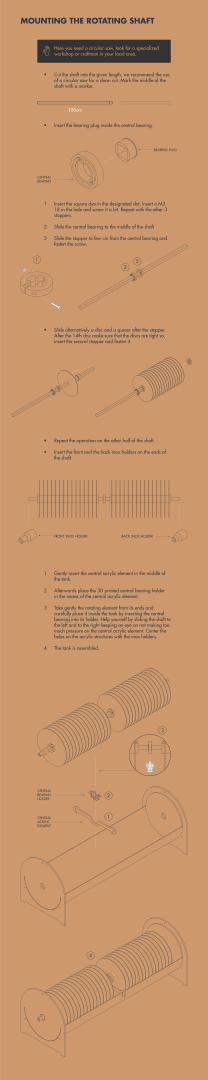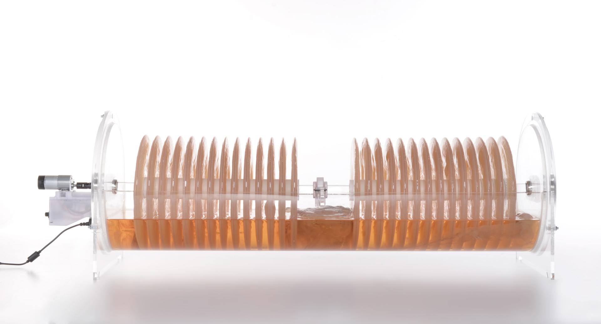 As global interest and acknowledging MC’s potential, the need for efficient and optimized production and cultivation methods becomes more acute. The most common production method is currently based on static fermentation: nourishing liquid and a SCOBY are inserted in a static tank for the duration of the fermentation cycle (7-21 days) after which the jelly which develops on the top surface is harvested. However, this method is highly laborious and requires a large cultivation surface. Instead, scientists have identified another method called ‘rotating disk bioreactor’. It is made of an array of disks mounted on a rotating shaft immersed into the nourishing liquid. In this way MC grows directly on the disks optimizing the volume as well as the oxygenation stimulating the growth. Moreover, monitoring and adjusting the fermentation is easier. Based on this principle, the InnoCell design team developed the InnoCell Bioreactor (IB) consisting of a module that is open-source in order to be reproducible by anyone and adaptable to smaller and bigger production scales. The IB is made of accessible materials and components that enable anyone interested to make one own and use it to produce MC extending circular aims on social levels. People would in this way, have the access and possibility to use byproducts to grow food or materials and to further experiment. MicroCell aims at finalizing the open-source website providing all the guidelines and instructions to make the IB. Moreover, Fablabs would be contacted in order to introduce the potential of making DIY compostable materials with own IB in order to serve as physical accessible platforms fostering knowledge democratization. In this way, citizens would be empowered to reproduce and/or iterate and adapt IB modules, to know MC substances and potentially initiate new projects. Also, InnoCell partners in other EU countries, local corporations and consortia will be invited to consider implementation scenarios based on IB.
