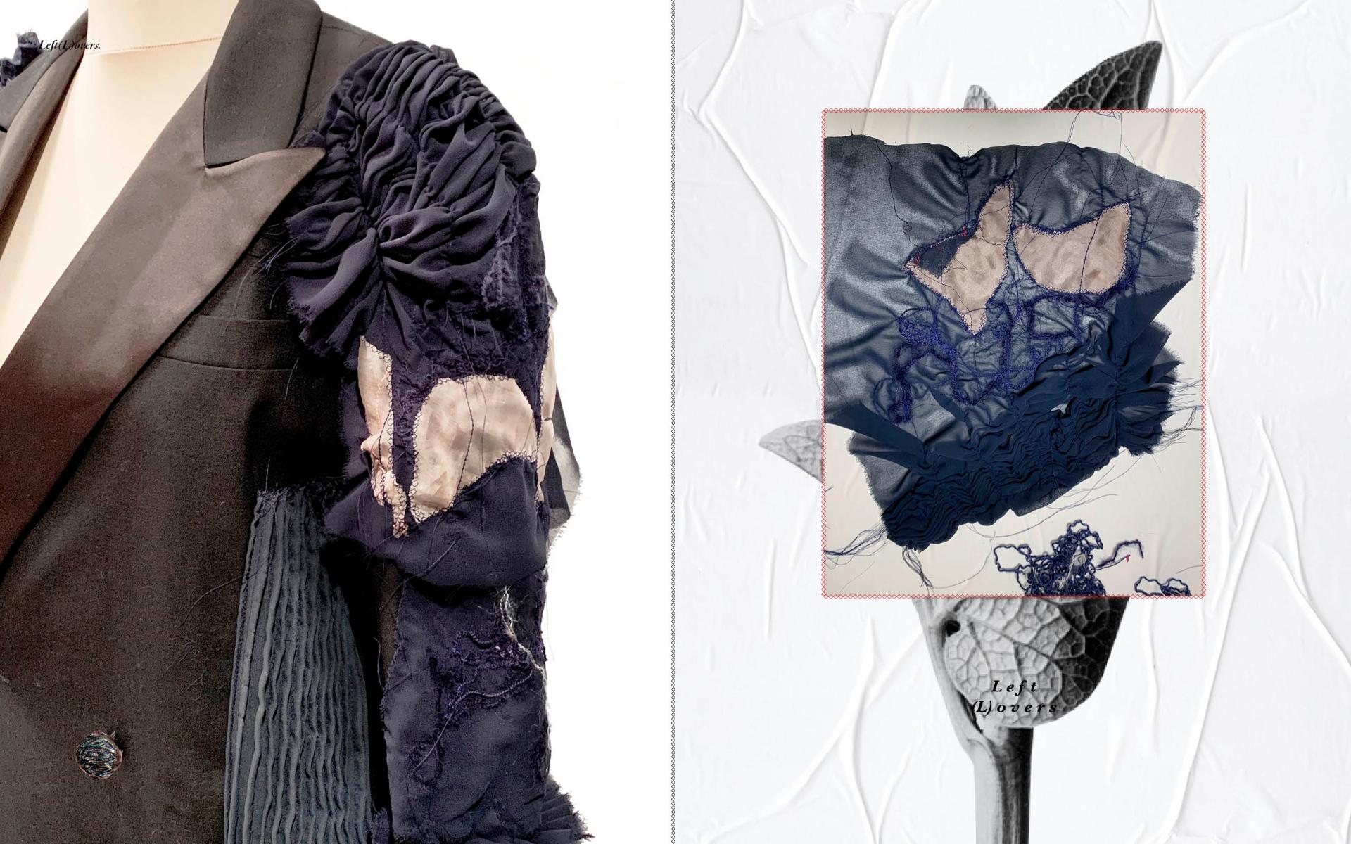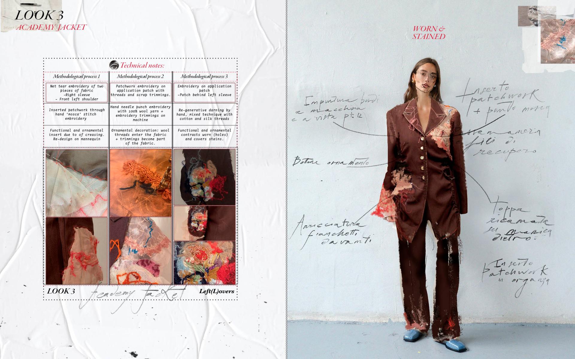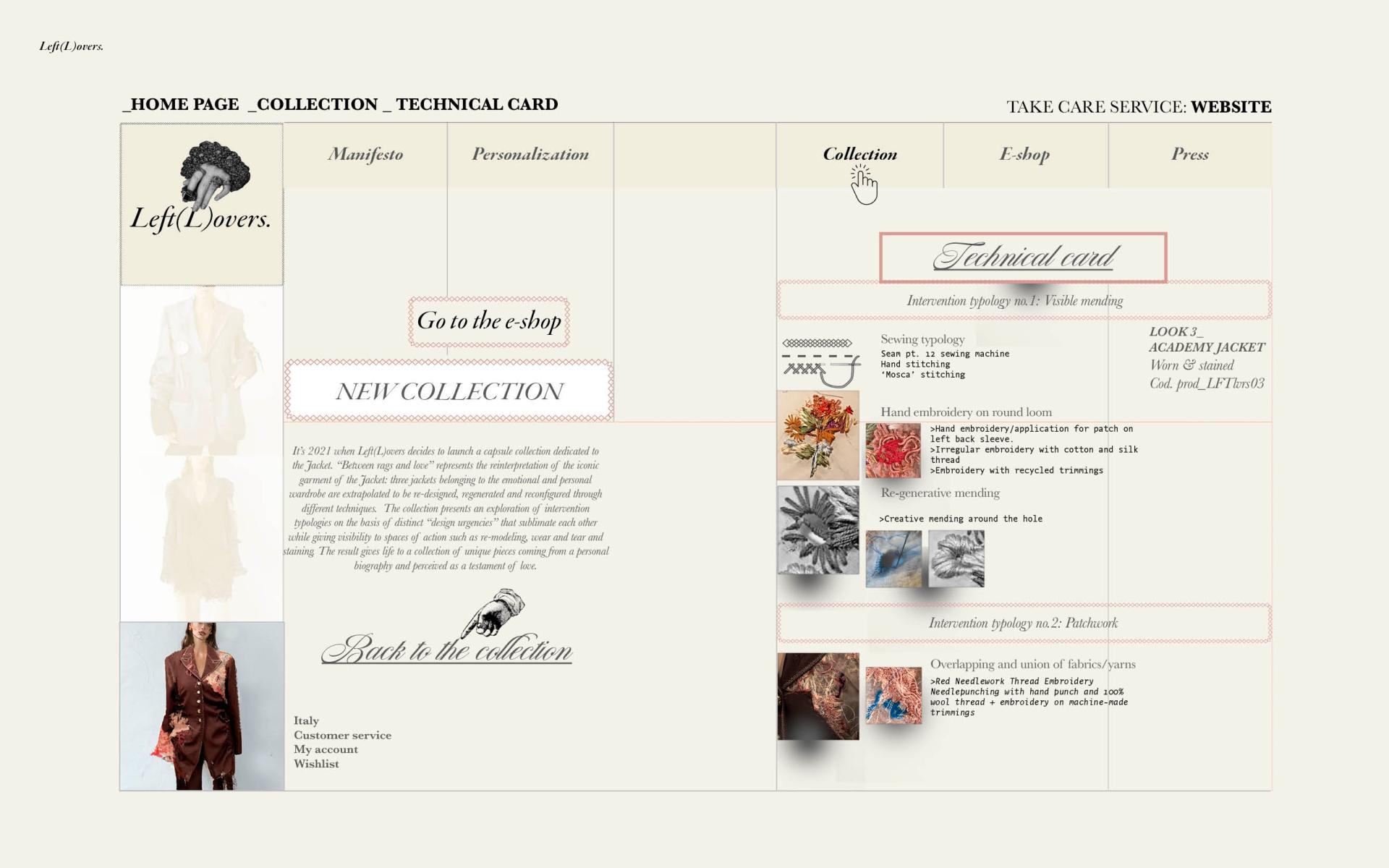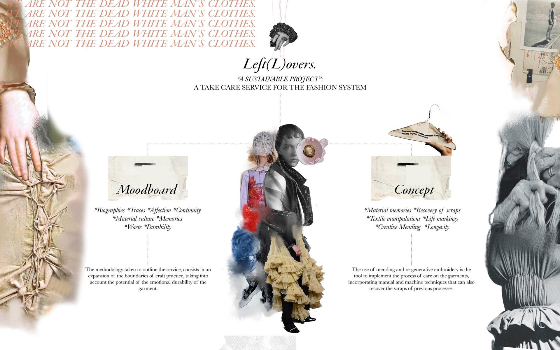 Born as a thesis project, Left(L)over is a true Call to Action for a more sustainable fashion. It is a system that is configured in a take-care service operating on pre-loved clothing through craftivism operations; It uses re-generative mending and other craft-based approaches to implement the process of care on the garments. Left(L)overs incorporates both manual techniques and machine work to recover the leftovers of used garments taking into account the emotional connection with clothing.