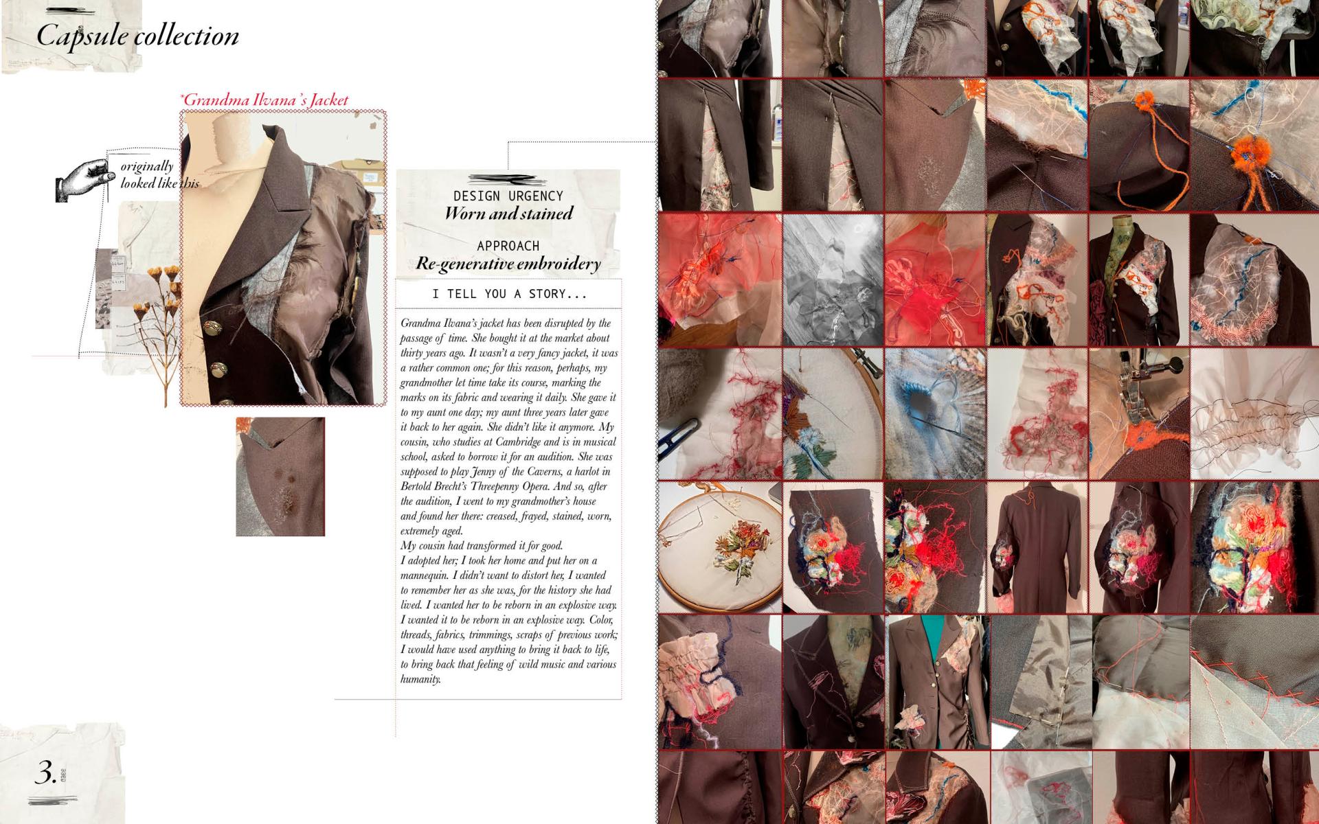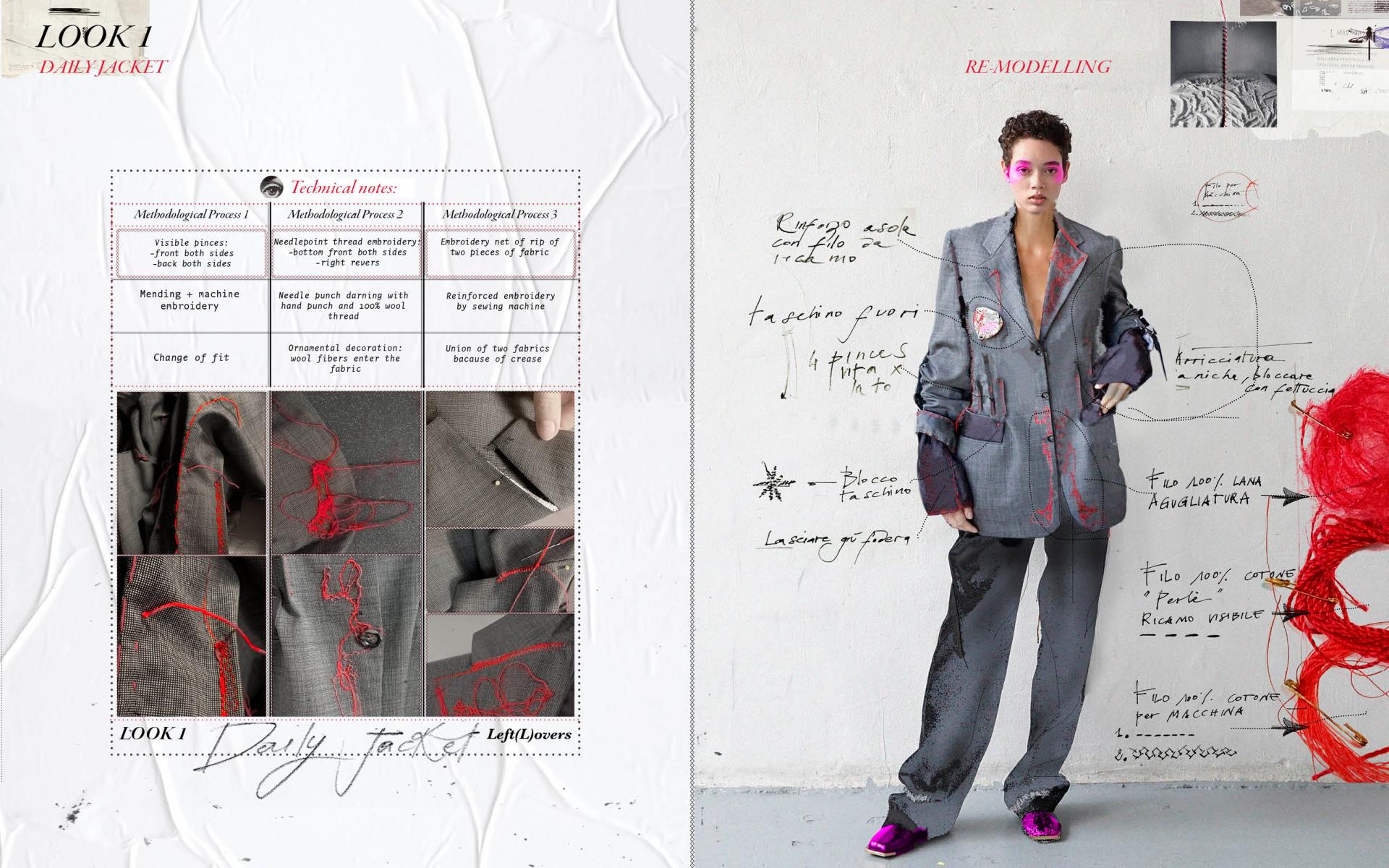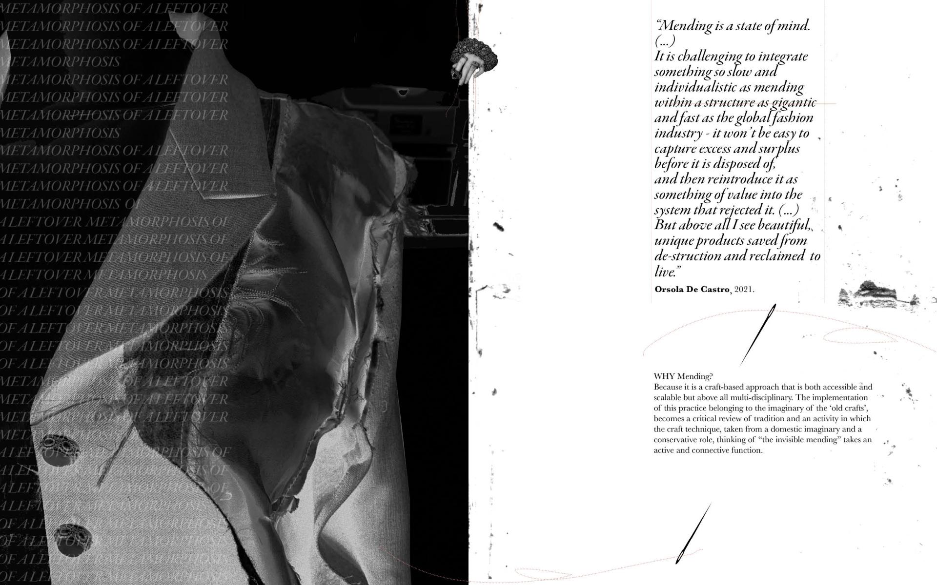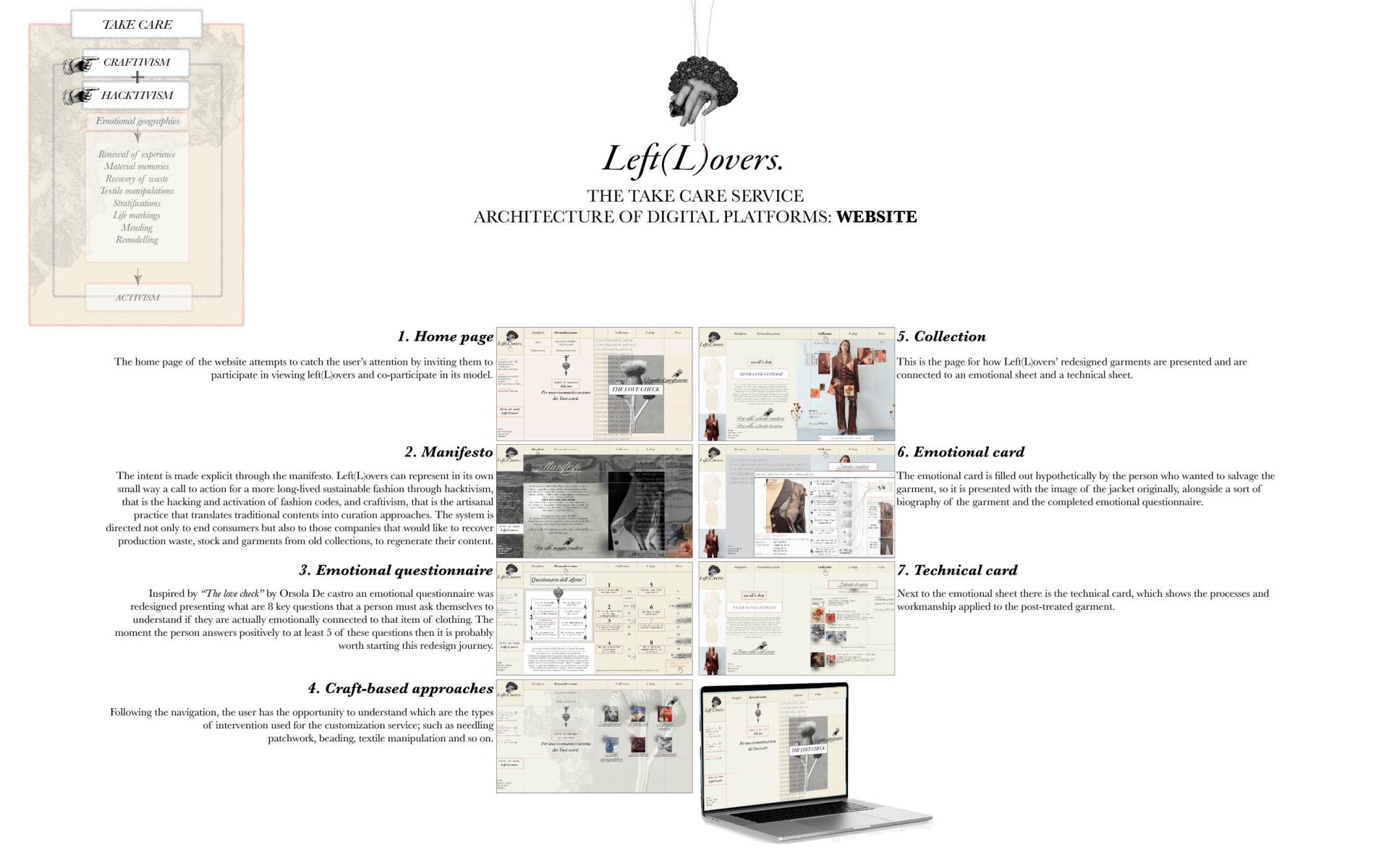 Born as a thesis project, Left(L)over is a true Call to Action for a more sustainable fashion. It is a system that is configured in a take-care service operating on pre-loved clothing through craftivism operations; It uses re-generative mending and other craft-based approaches to implement the process of care on the garments. Left(L)overs incorporates both manual techniques and machine work to recover the leftovers of used garments taking into account the emotional connection with clothing.