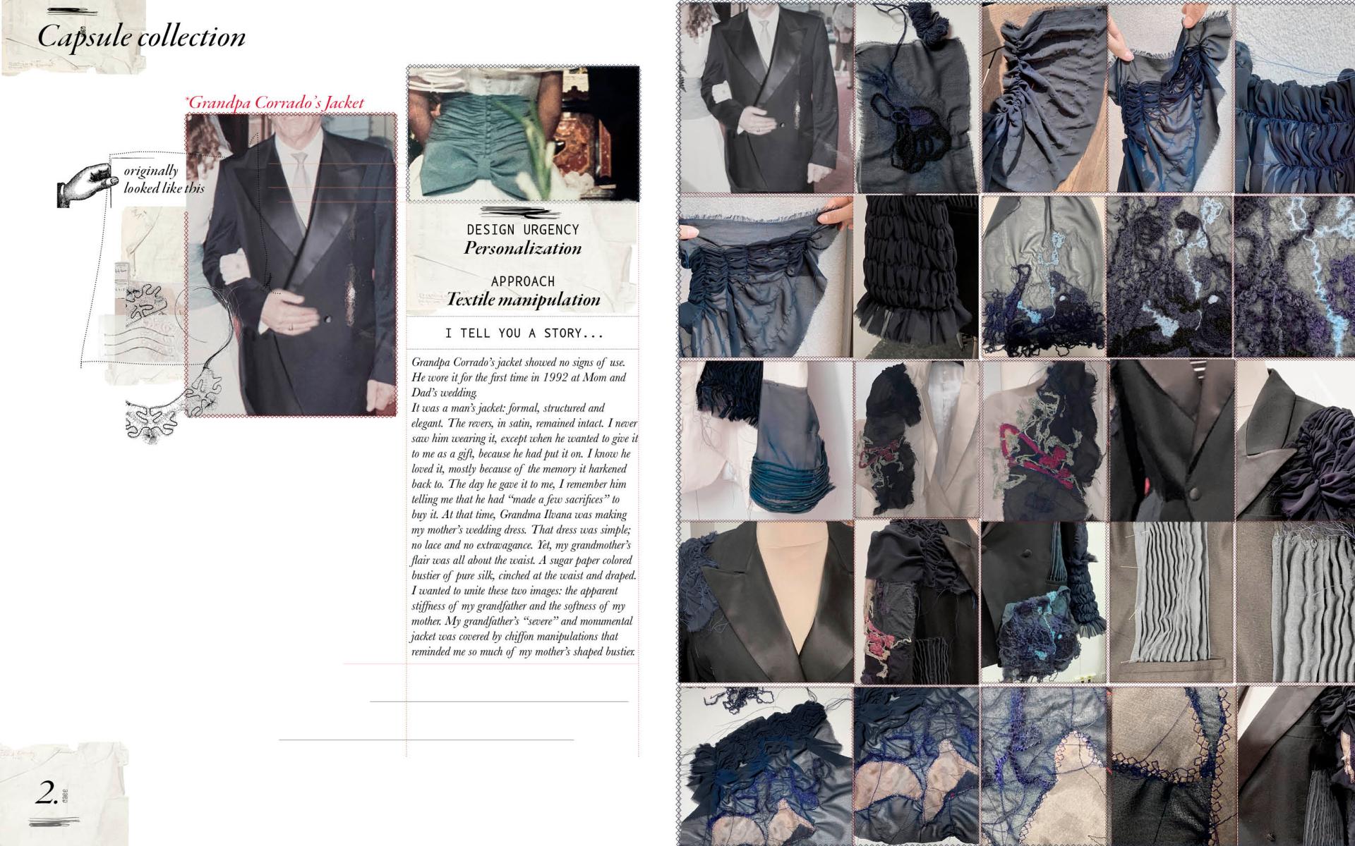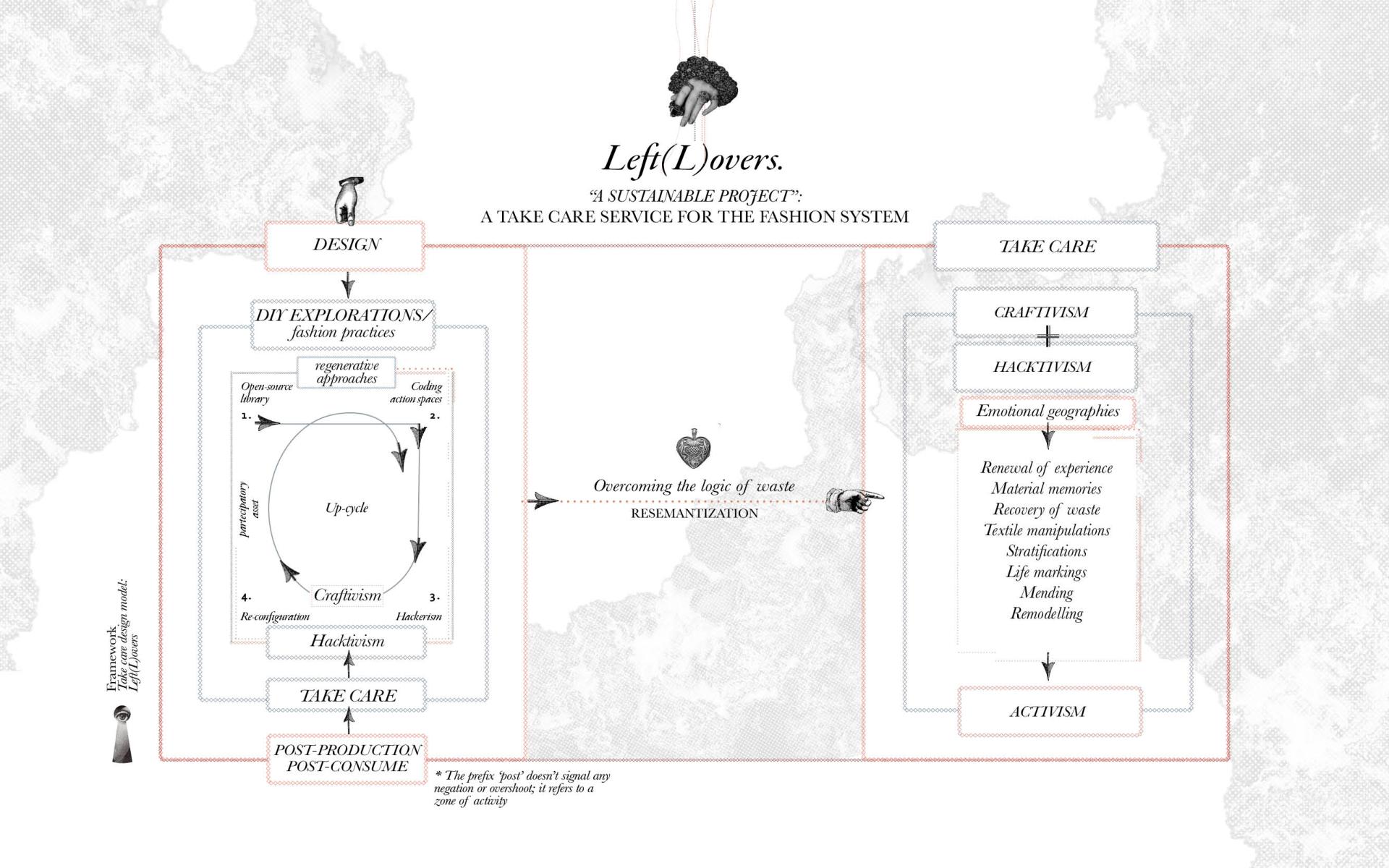 Left(L)overs is therefore a design-based service that with a vision of care seeks to map out sustainable and long-lived trajectories to remedy the early disposal of clothing. In terms of Sustainability, Left(L)overs contrasts the linear model buy-throwaway, enhancing and re-generating the emotional attachment user-product.