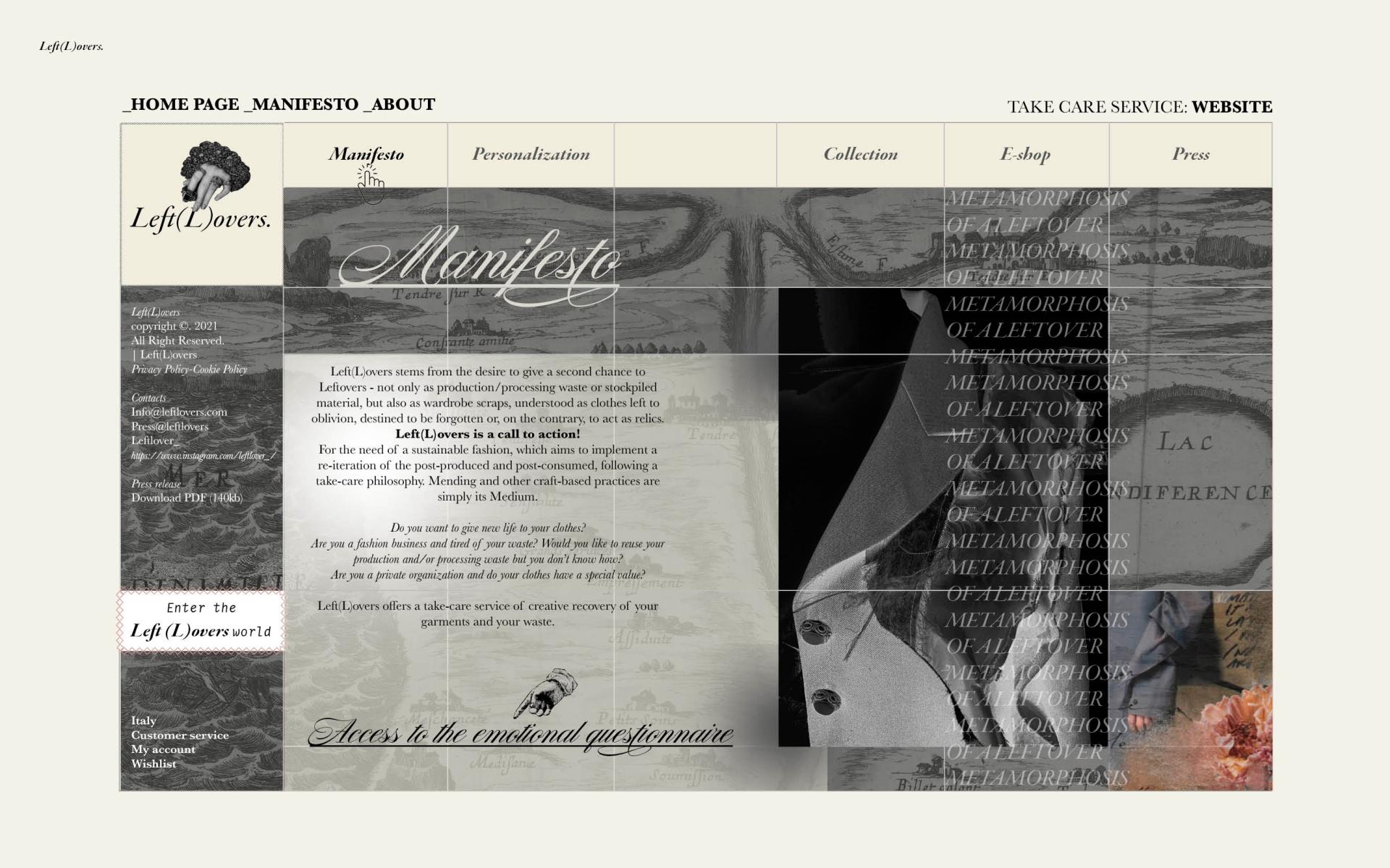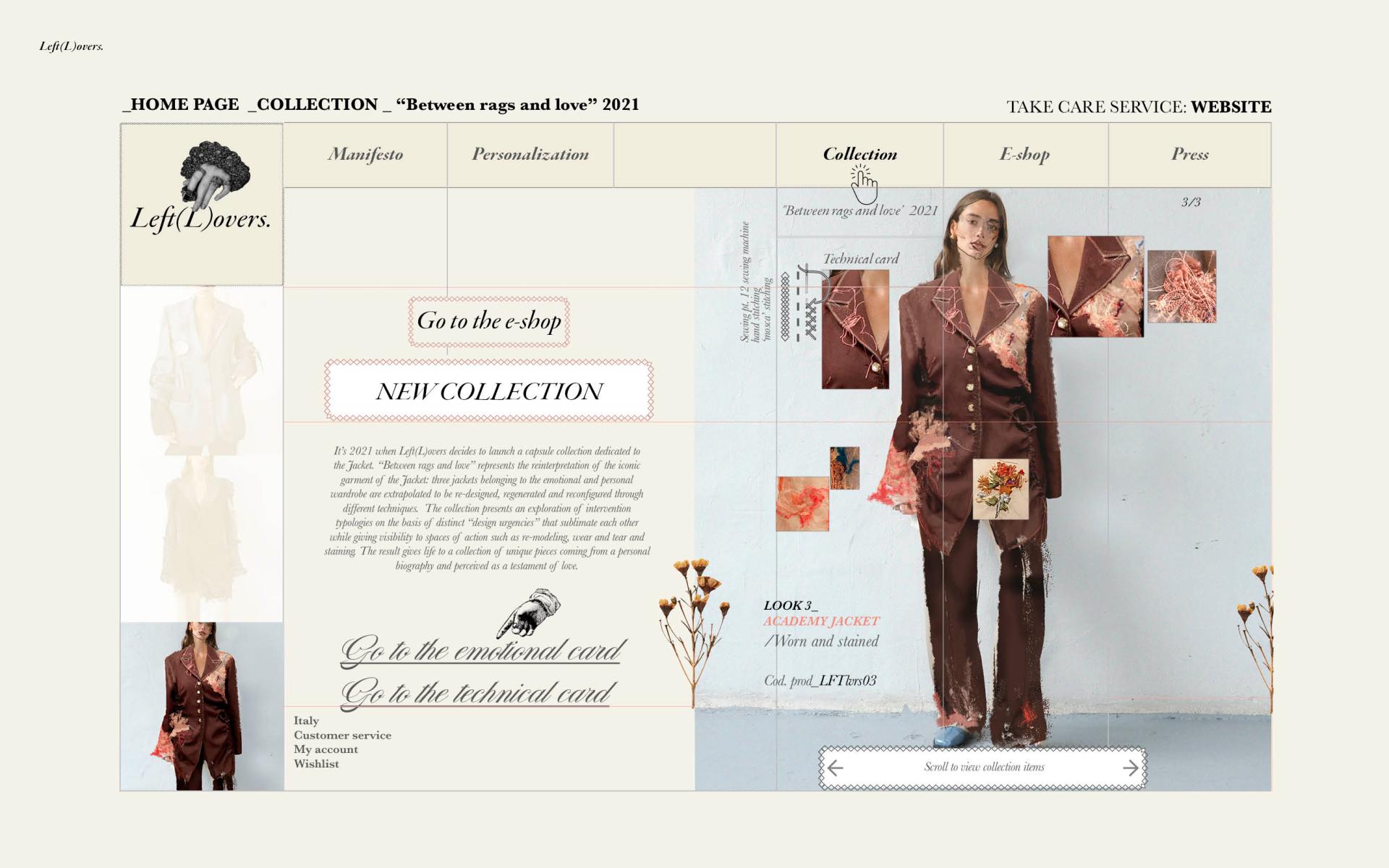 The moment the user answers positively to at least 5 of these questions then Left(L)overs examines the specific case and considers undertaking the journey of redesigning the garment.The emotional questionnaire is a simplified method of analysis to understand the level of connection that co-exists between an individual and his/her clothing. The questionnaire is aimed at clients as companies and/or individuals who wish to recovery, regenerate and reconfigure their collections, and/or individual garments, and/or production waste. The test of affection allows Left(L)overs to identify, among the types of intervention that it proposes, which one could best approach the treatment requested and imagined by the client. Left(L)overs is a definitely inclusive model as it consists of a participatory and open-source format for the fashion system.