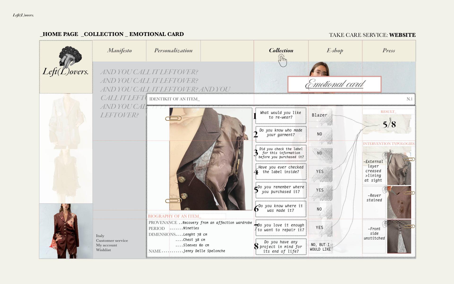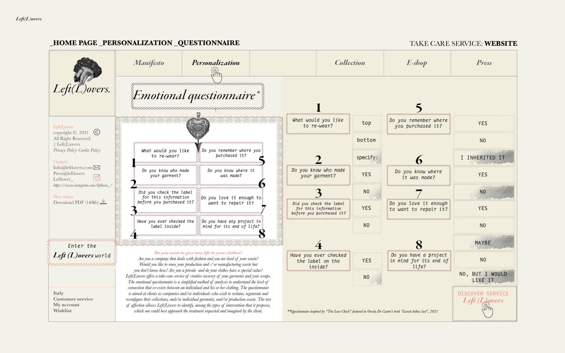 Freely inspired to "the love check" by Orsola De castro: the interactive questionnaire presents eight key questions that must be hypothetically filled in by the user of the service in order to enable him/her and Left(L)overs to understand how much the person is actually emotionally attached to that item of clothing.