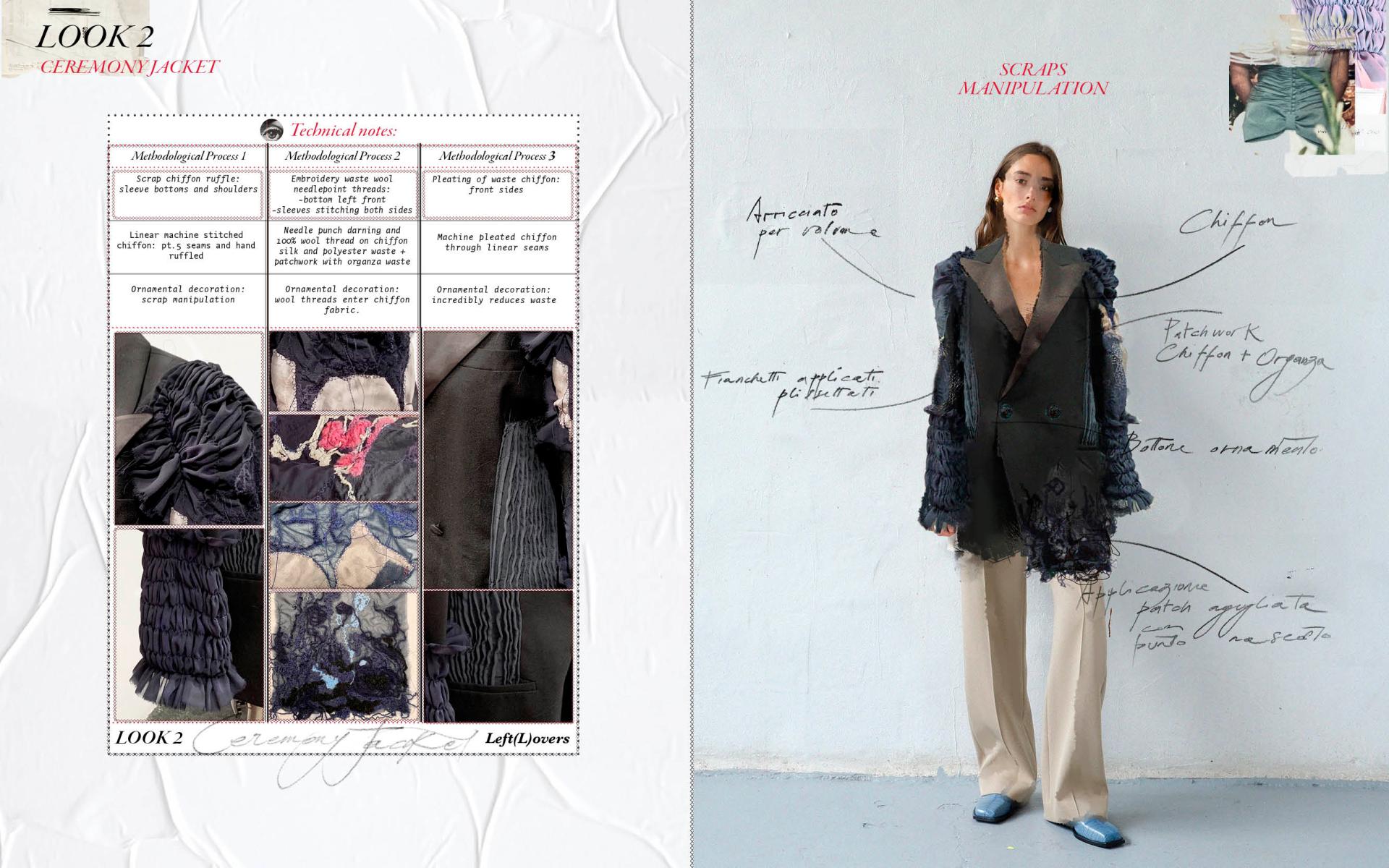 Restarting from the four pillars of sustainability, Left(L)overs investigates the concept of waste, discard and surplus in the fashion industry in order to resemantize and reconfigure it within the system. In 2017, the Montreal Declaration emphasized that the figure of the designer plays a central role, not only in the product creation process, but also in educating consumers on the values of social, cultural, environmental and economic sustainability.